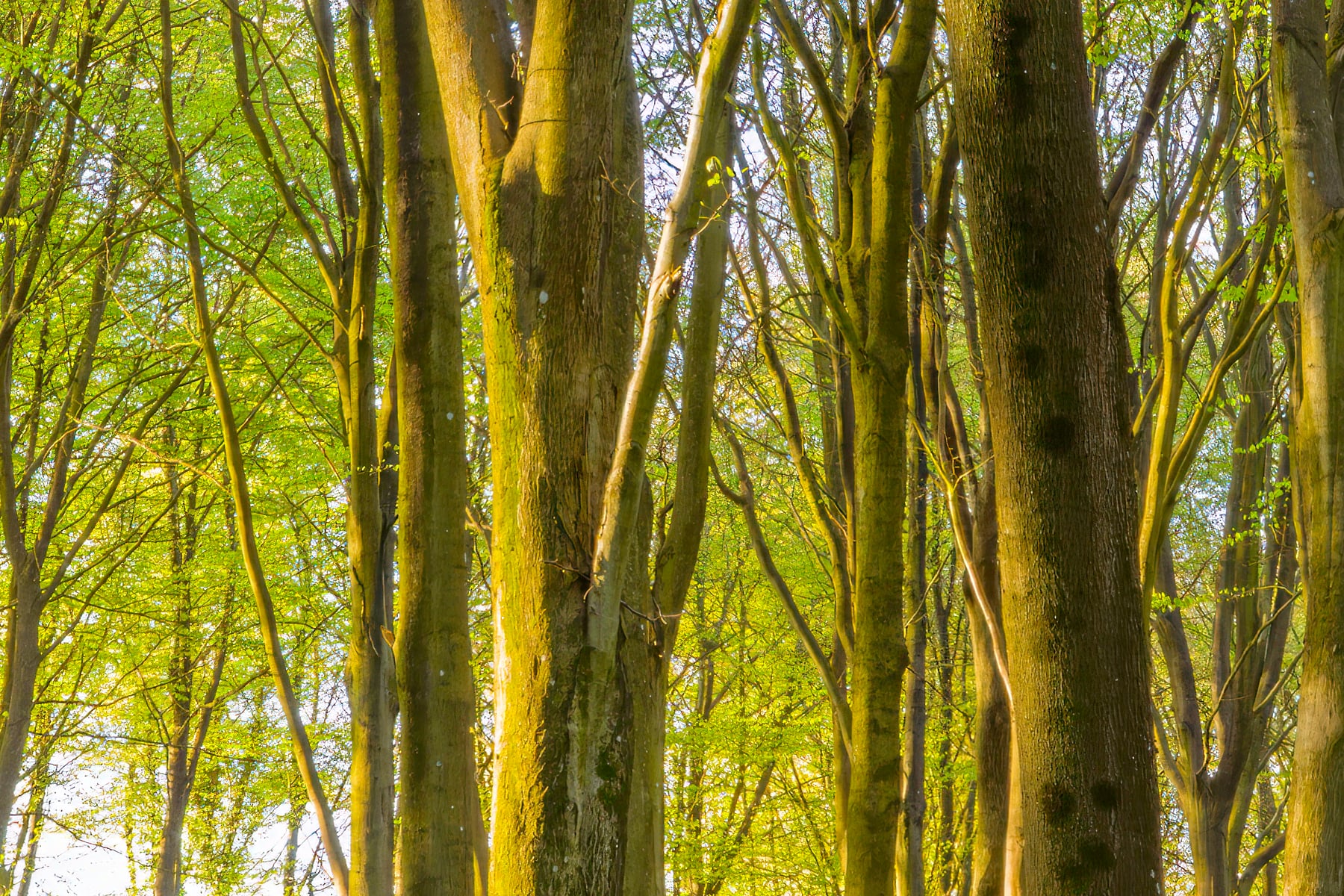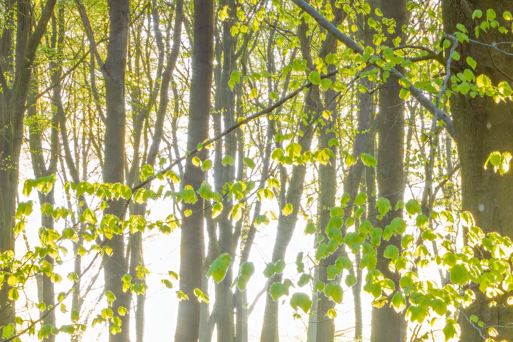 The towering trees stand in perfect harmony, their fresh green leaves illuminated by the soft morning light. The lush undergrowth and delicate flowers add a sense of renewal and vitality, marking the arrival of spring in this peaceful woodland. The stillness of the forest is only broken by the gentle rustling of leaves and the distant chirping of birds.
