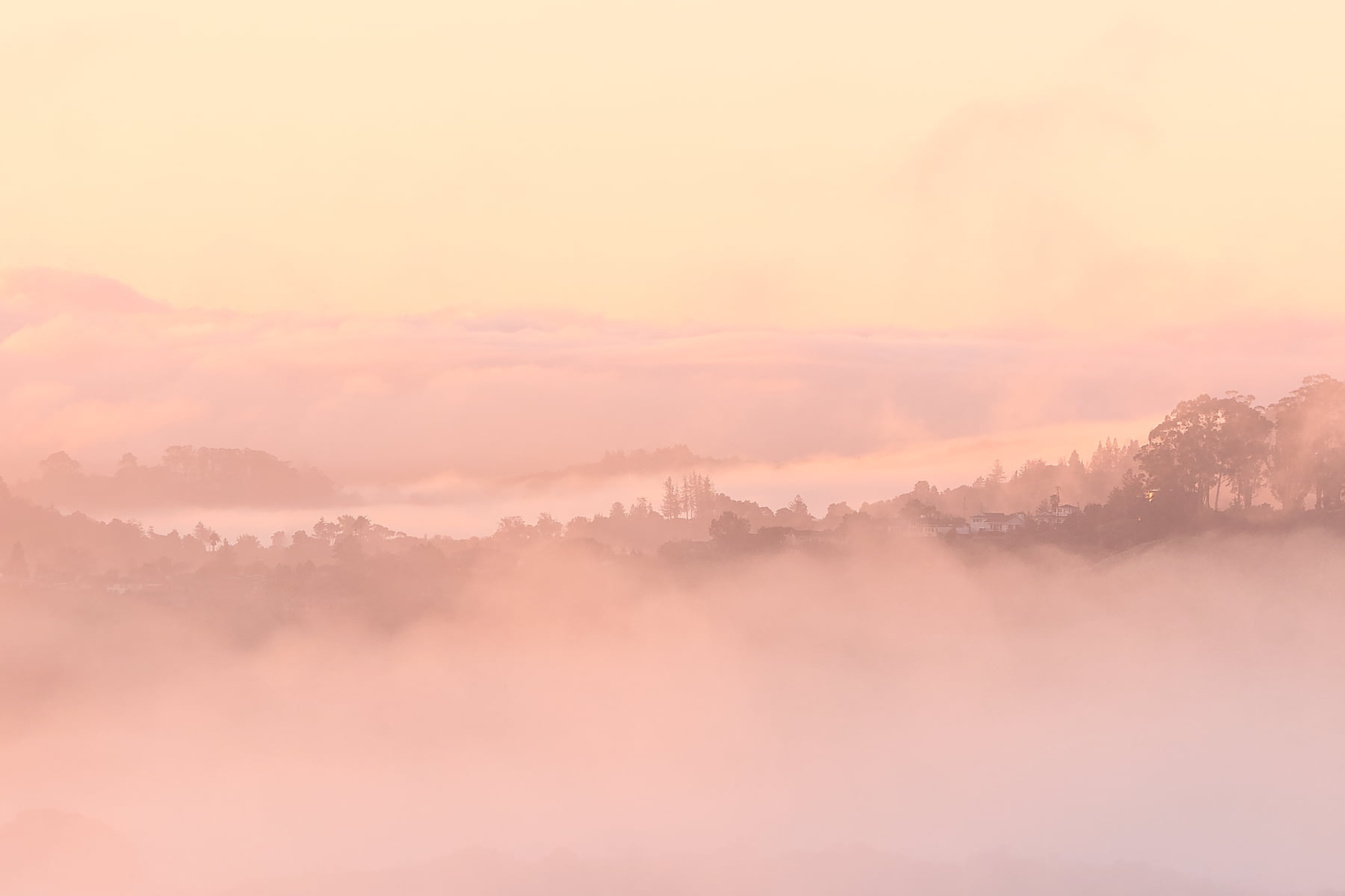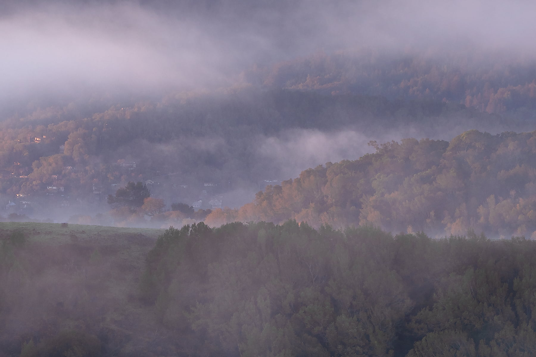 On this morning, I sensed there would be perfect conditions for a vista I had been hoping to capture for many months. It was about an hour hike up in the dark, but this looked like the day, so off I went, straight up the mountain. As I climbed higher, I noticed something concerning... another fog layer was forming above me. A big yikes. But fog changes every minute, so this could happen. About halfway up the hill, it became clear that this was not going to work out as I'd hoped. I hiked down a bit, and quickly captured a few panoramic photos of a spectacular scene from about halfway up the hill, before the higher fog engulfed everything. It wasn't quite what I'd come for, but that's part of the game. It was still extremely beautiful.