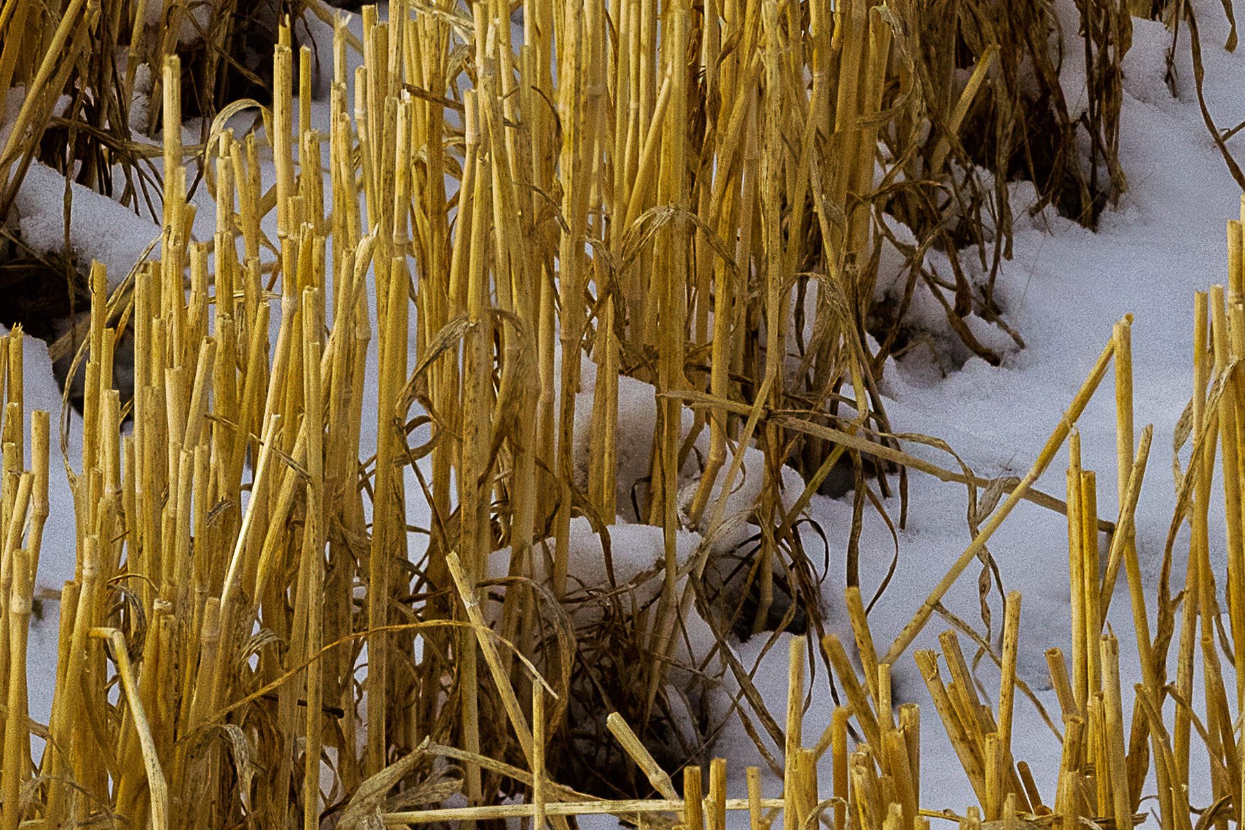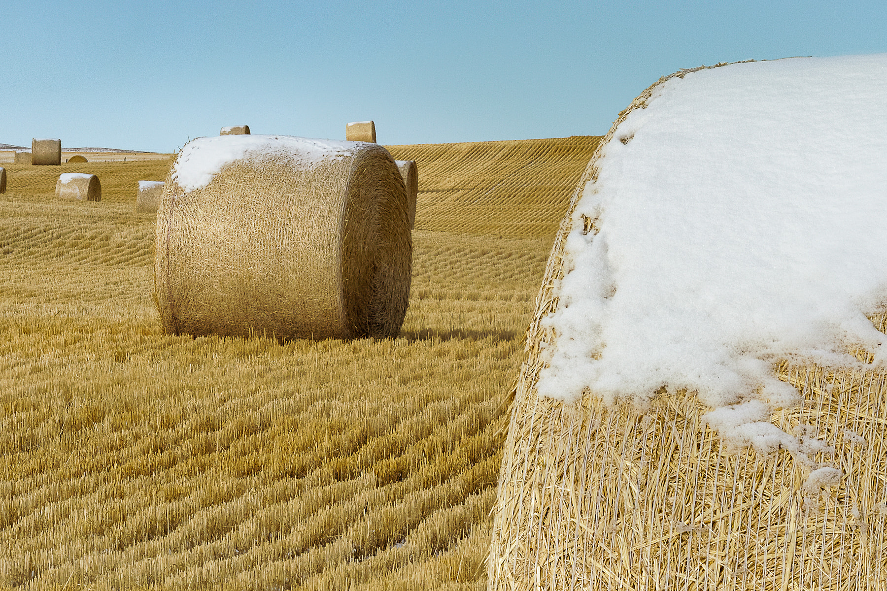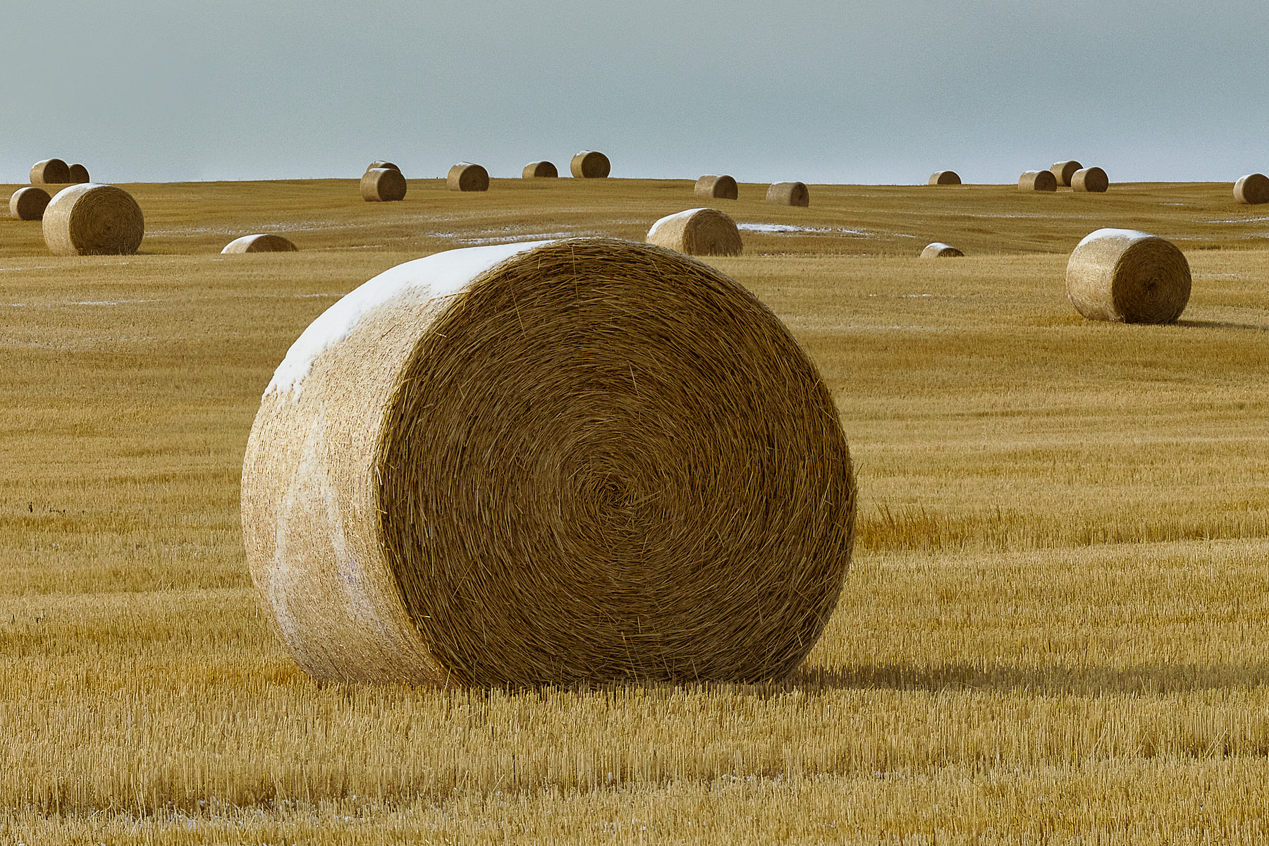 I had passed this wonderful and seemingly endless field of hay bales a week earlier but it was snowing and overcast. I returned a week later to find beautiful wispy clouds quickly moving overhead and most of the bales sporting a white crown of snow. There was snow on the field also, but interestingly, it was only visible when looking directly down a crop line as the stubble was high enough to obscure the snow otherwise.