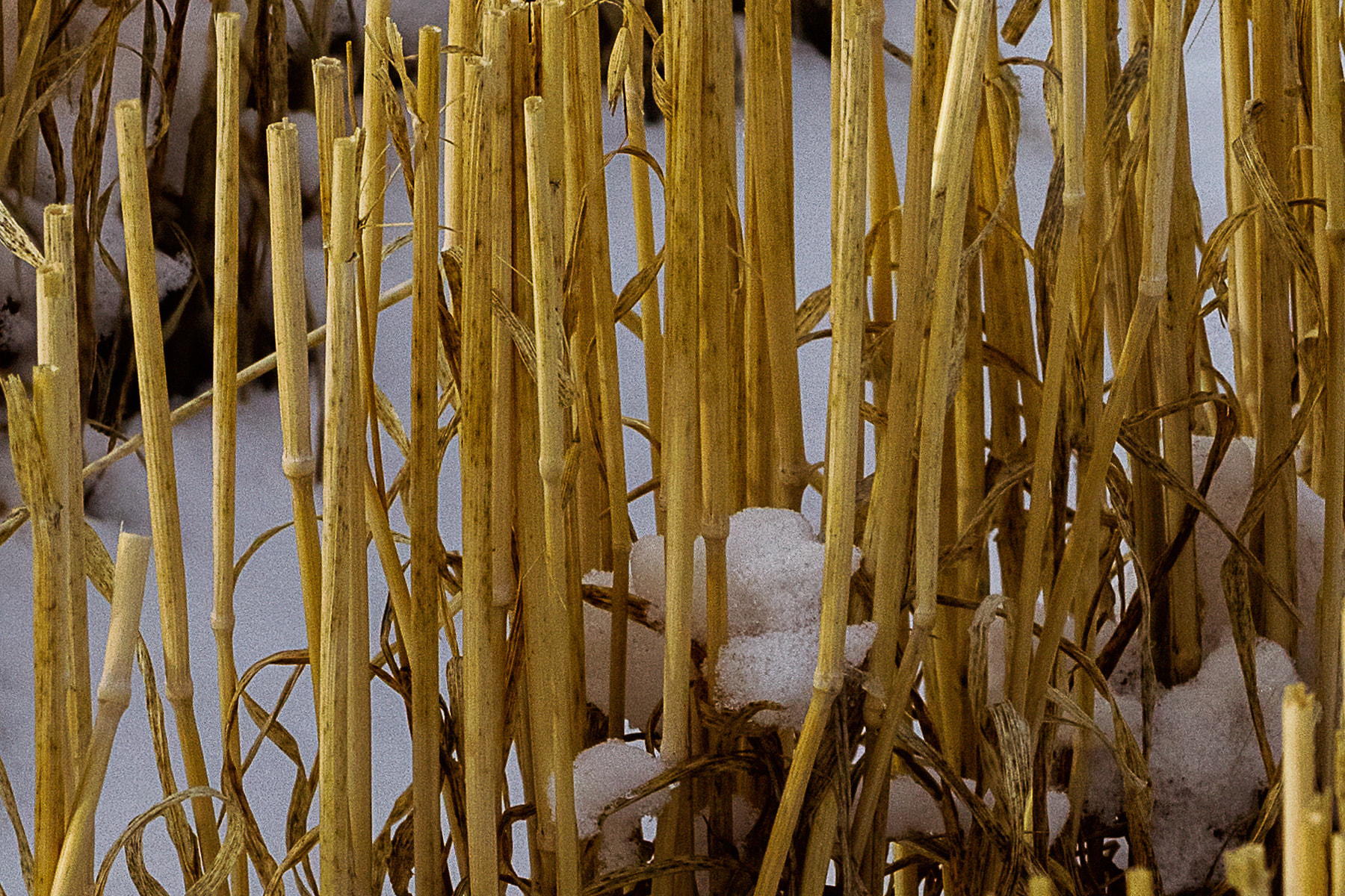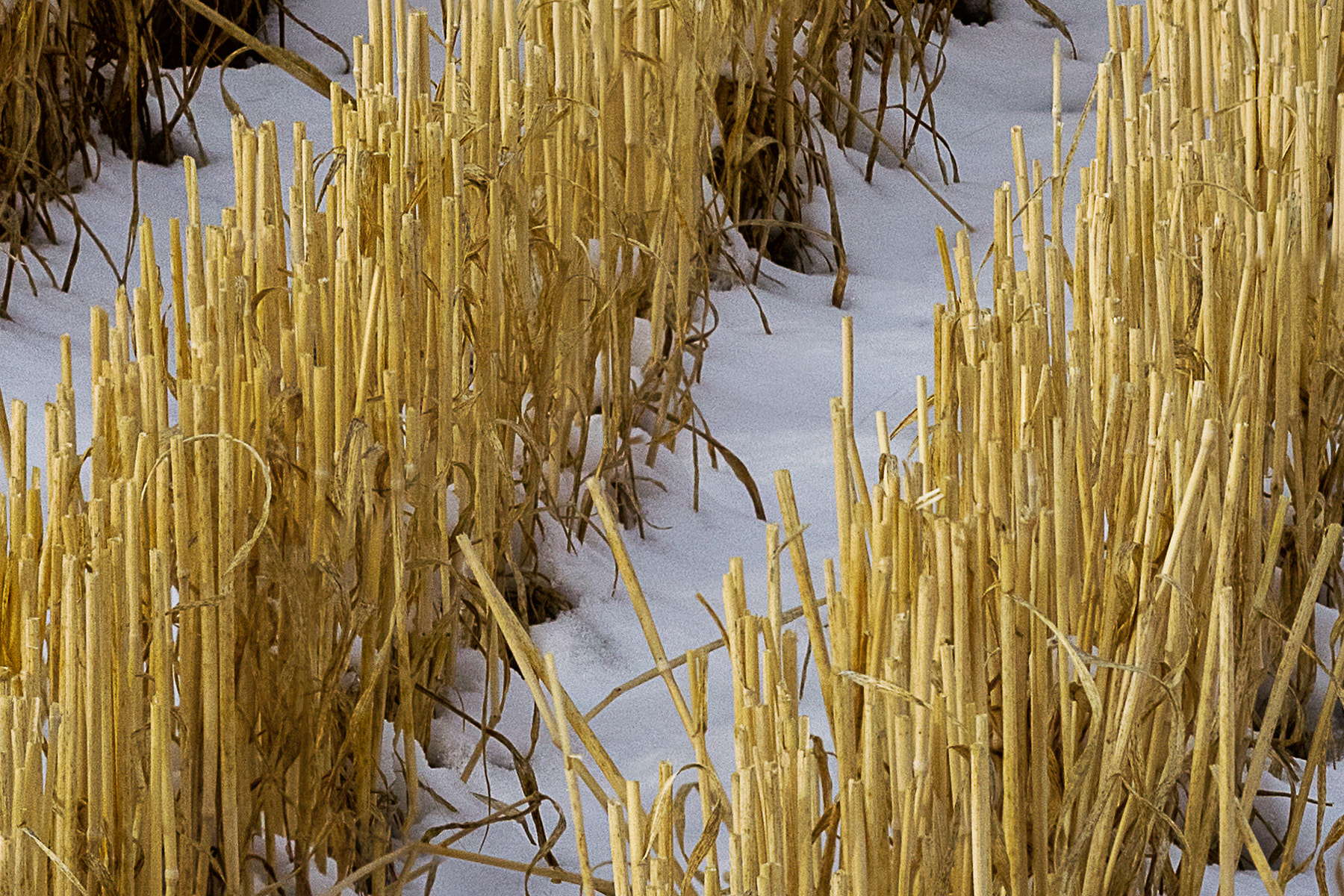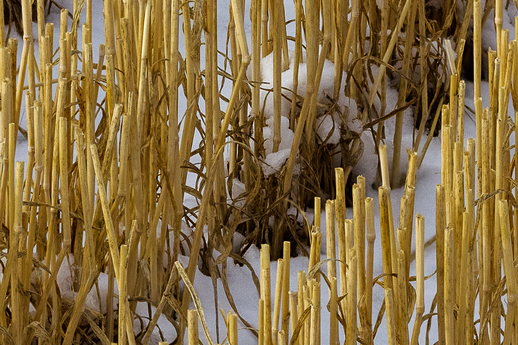 I had passed this wonderful and seemingly endless field of hay bales a week earlier but it was snowing and overcast. I returned a week later to find beautiful wispy clouds quickly moving overhead and most of the bales sporting a white crown of snow. There was snow on the field also, but interestingly, it was only visible when looking directly down a crop line as the stubble was high enough to obscure the snow otherwise.
