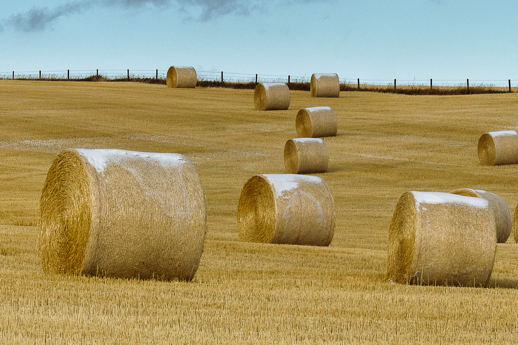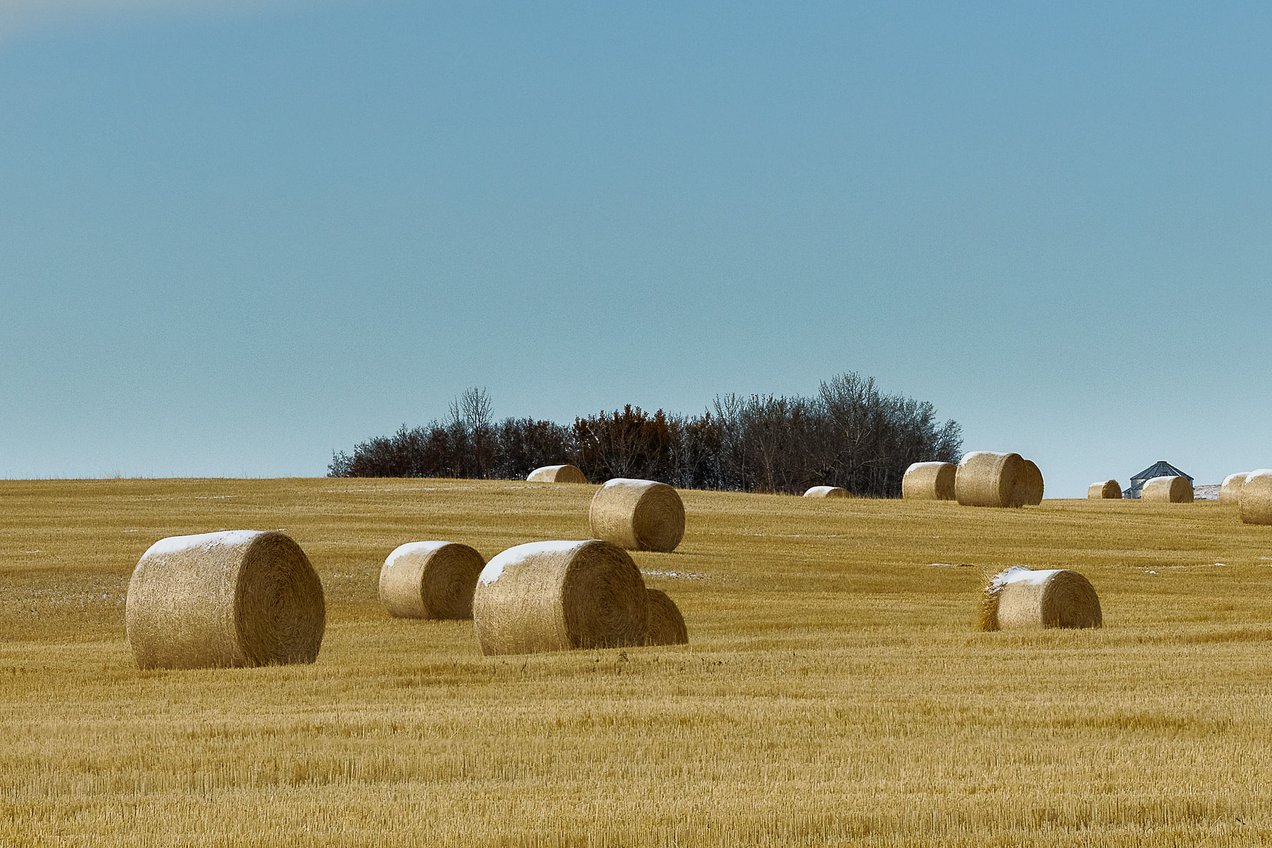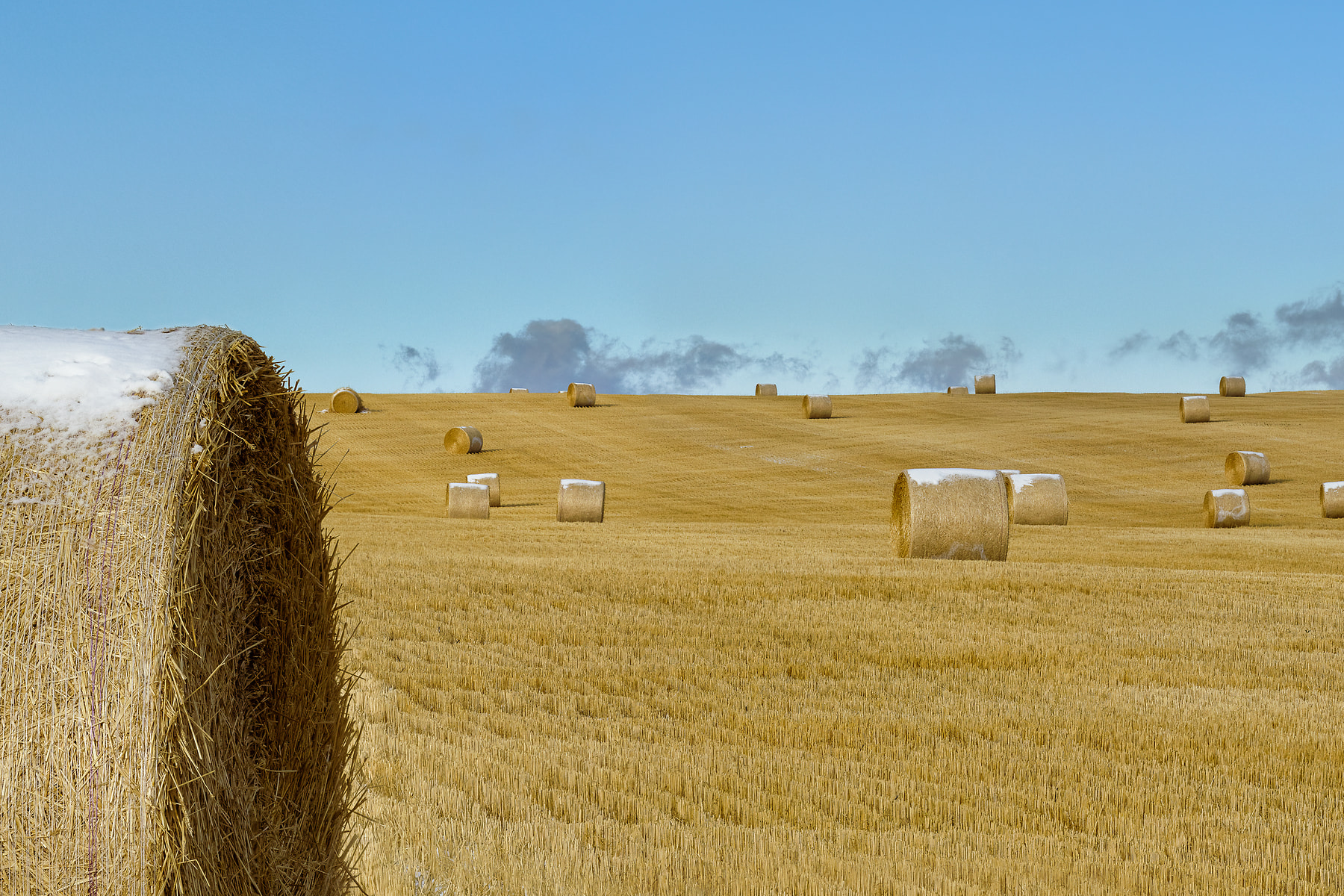 The appearance of harvested bales of hay or straw on the prairies is a sure sign that winter is on the way. There is always a rush to finish the harvest before the first snow of the season. In this case, the farmer had a very large job to do and was successful in that quest.