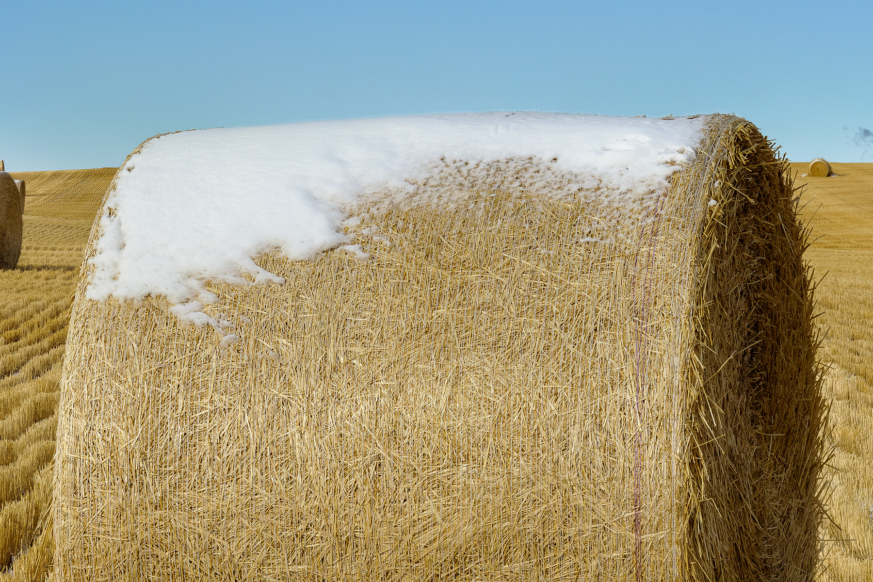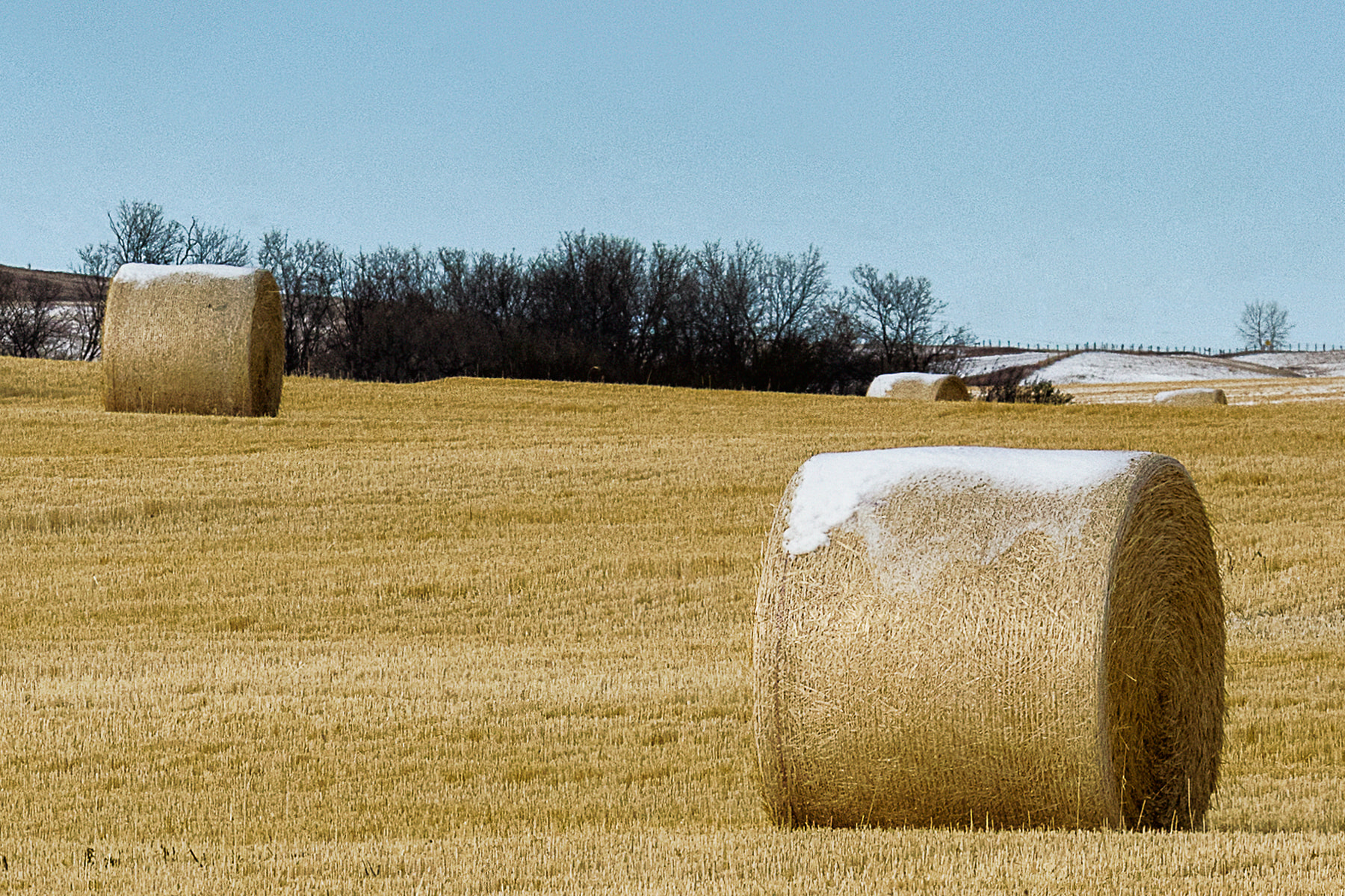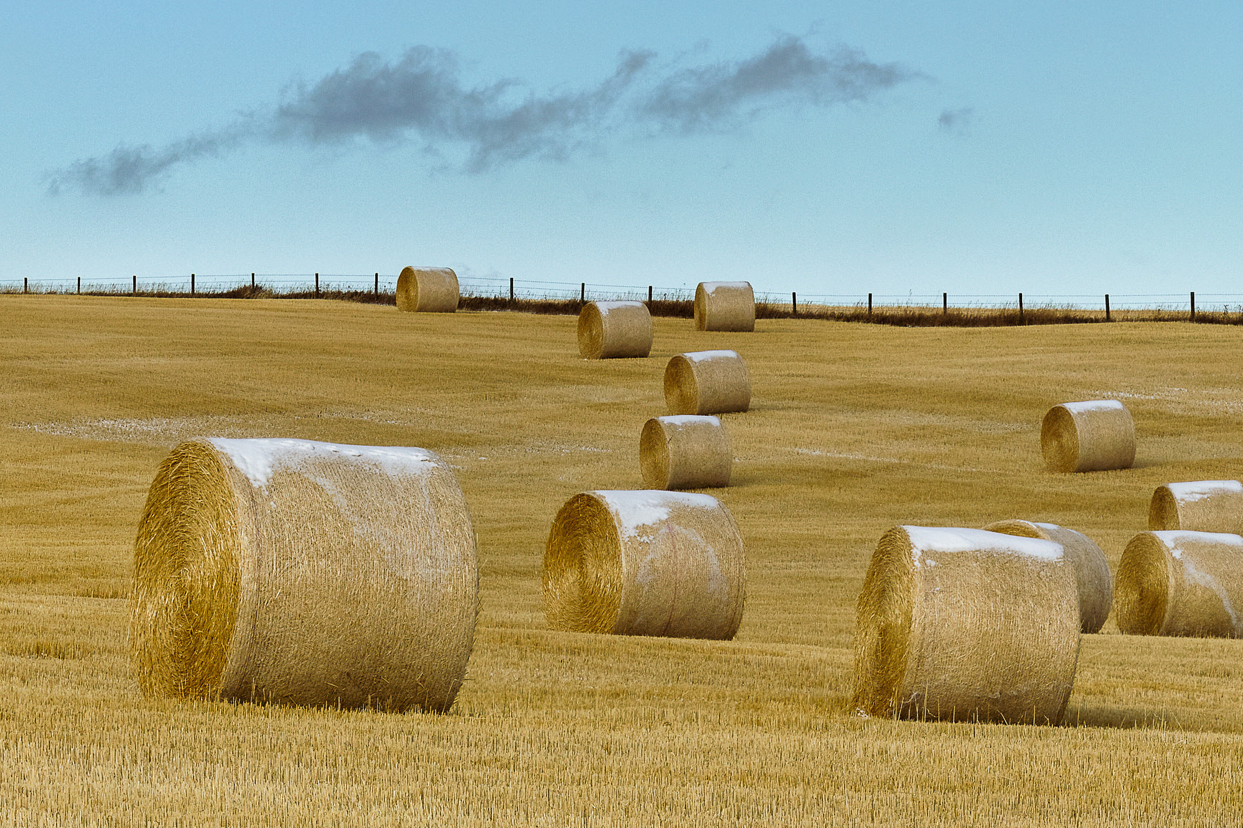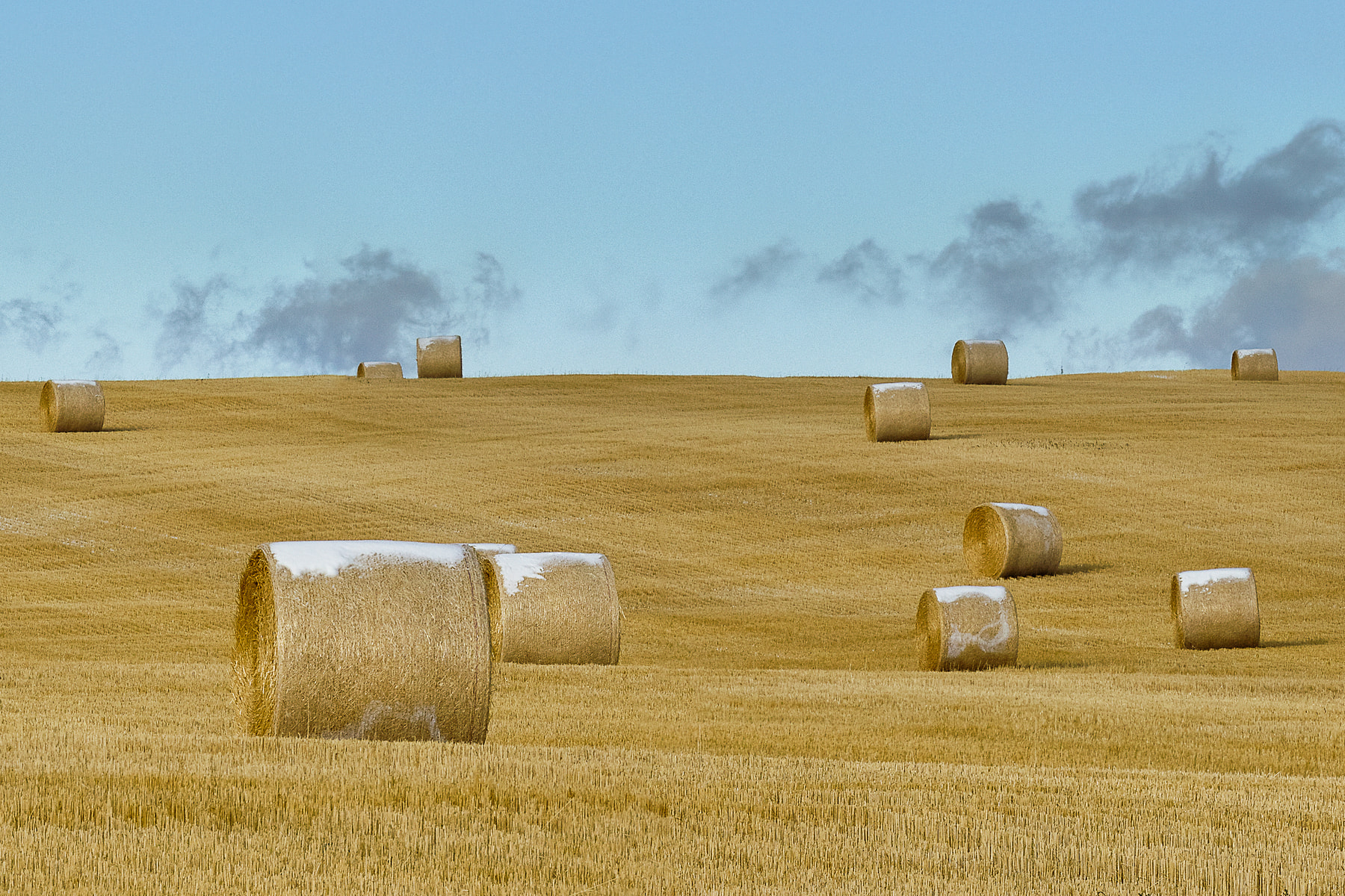 The appearance of harvested bales of hay or straw on the prairies is a sure sign that winter is on the way. There is always a rush to finish the harvest before the first snow of the season. In this case, the farmer had a very large job to do and was successful in that quest.