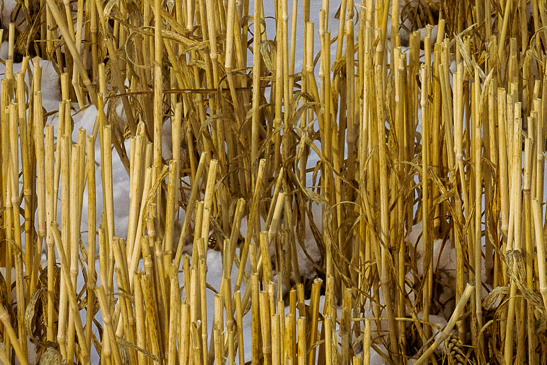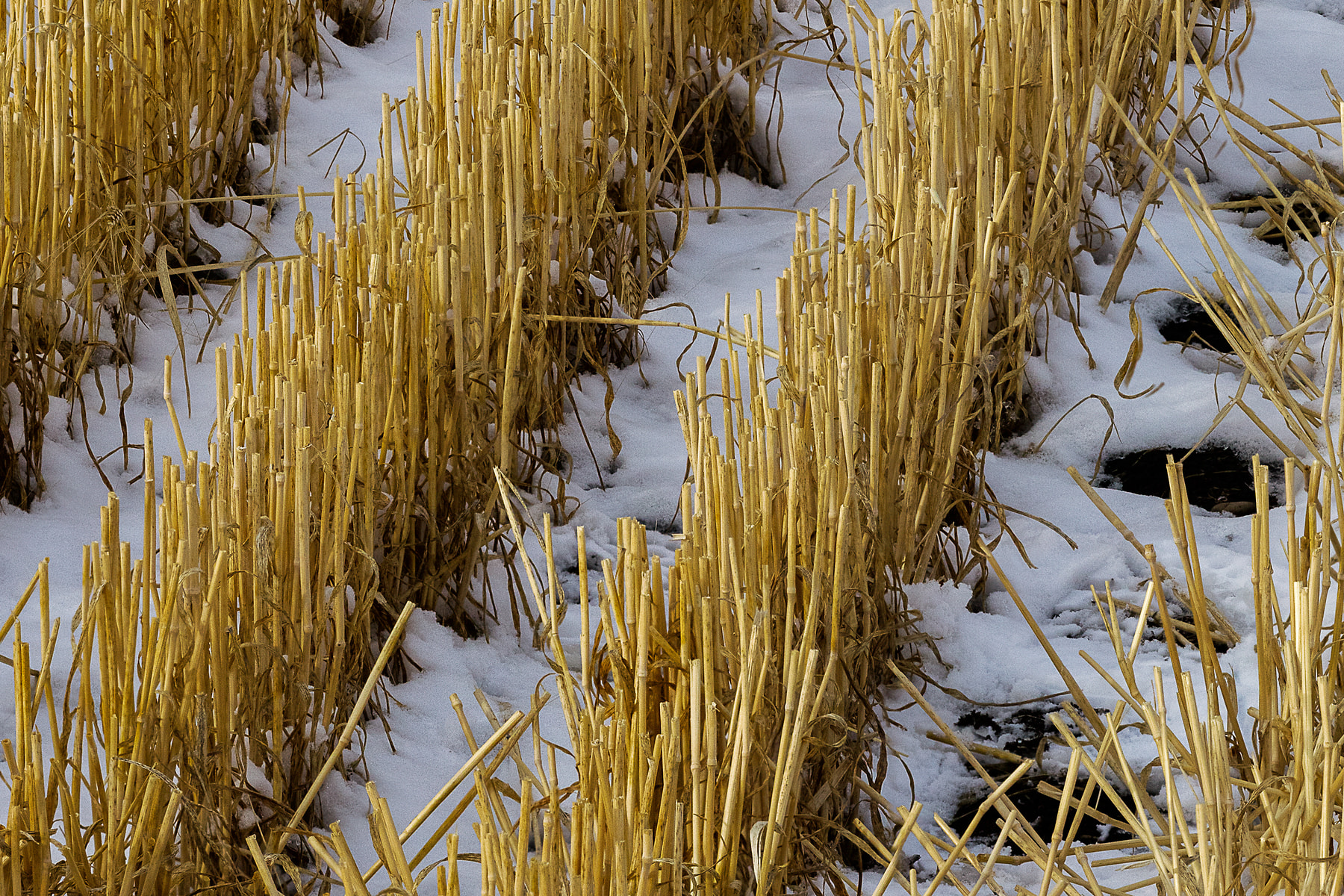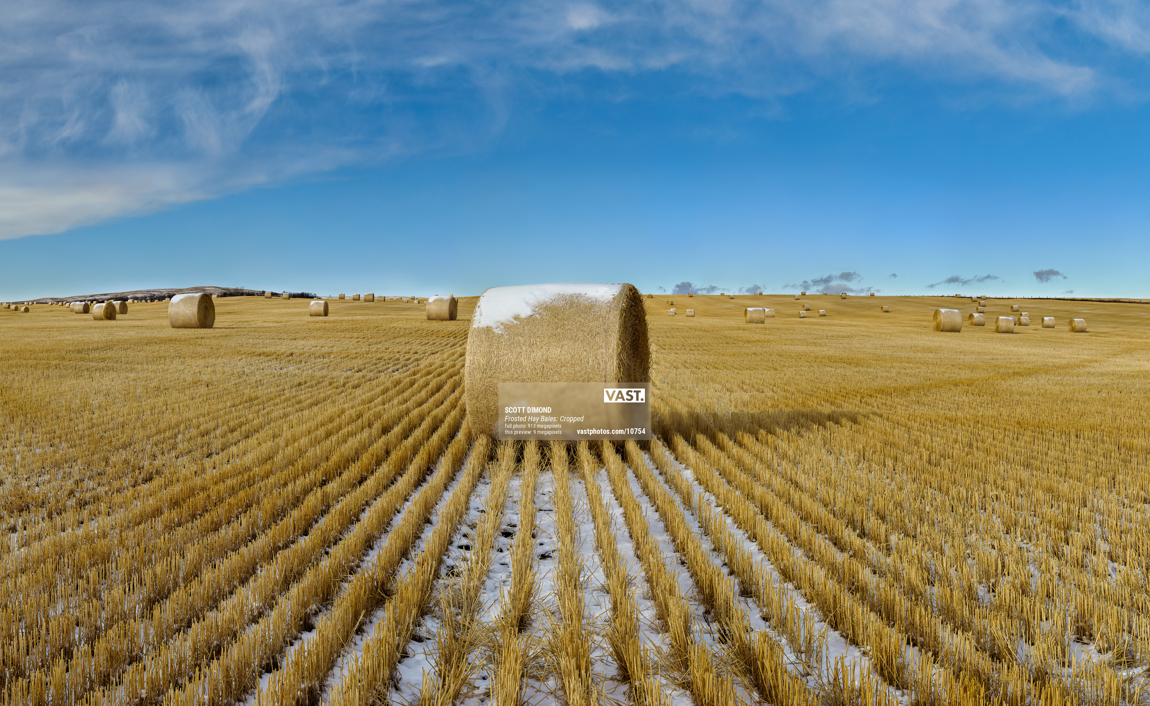 I had passed this wonderful and seemingly endless field of hay bales a week earlier but it was snowing and overcast. I returned a week later to find beautiful wispy clouds quickly moving overhead and most of the bales sporting a white crown of snow. There was snow on the field also, but interestingly, it was only visible when looking directly down a crop line as the stubble was high enough to obscure the snow otherwise.