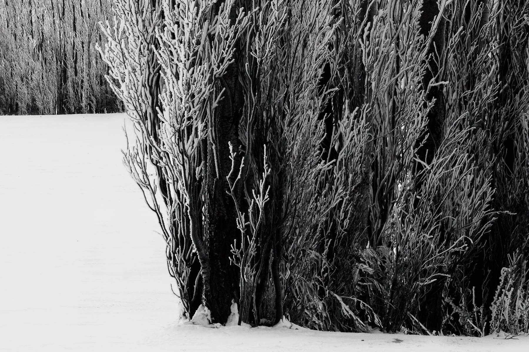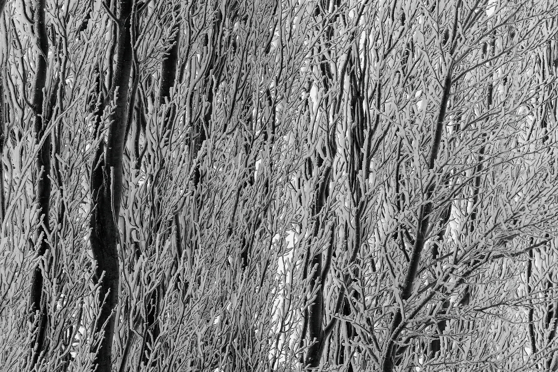 The term “hoar” comes from Old English meaning “to show signs of old age” and within the context of frost, refers to trees looking like they are covered in white hair. When cold winter conditions are just right, hoar frost creates layers of feather-like white crystals on tree branches. At times, its formation can be very localized, appearing in one area but not in other areas just kilometers apart. And that became the challenge. I needed a major hoar frost event so that when I was seeing it at my home, I knew there would be a good chance of it also occurring 80 kilometers away where these trees stand.