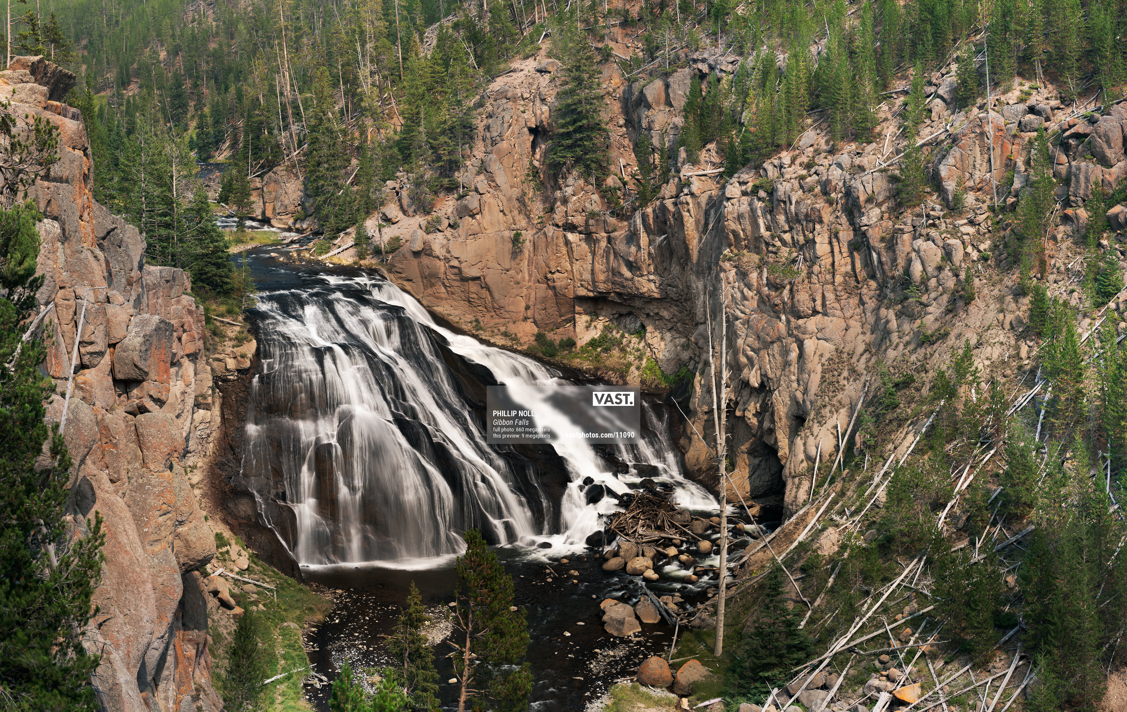 660 megapixels! A very high resolution, large-format VAST photo print of Gibbon Falls waterfall; photograph created by Phillip Noll in Yellowstone National Park, Wyoming.