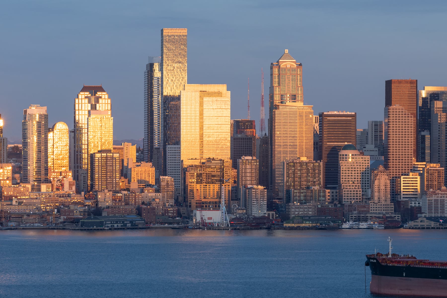 193 megapixels! A very high resolution, large-format panorama photo of the Seattle skyline at sunset with Elliott Bay in the foreground; cityscape photograph created by Greg Probst in Seattle, Washington.