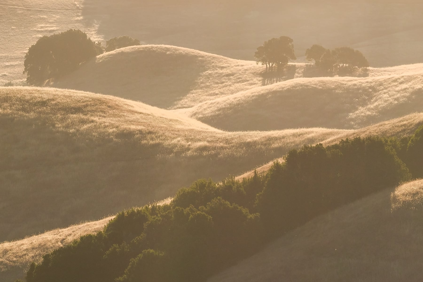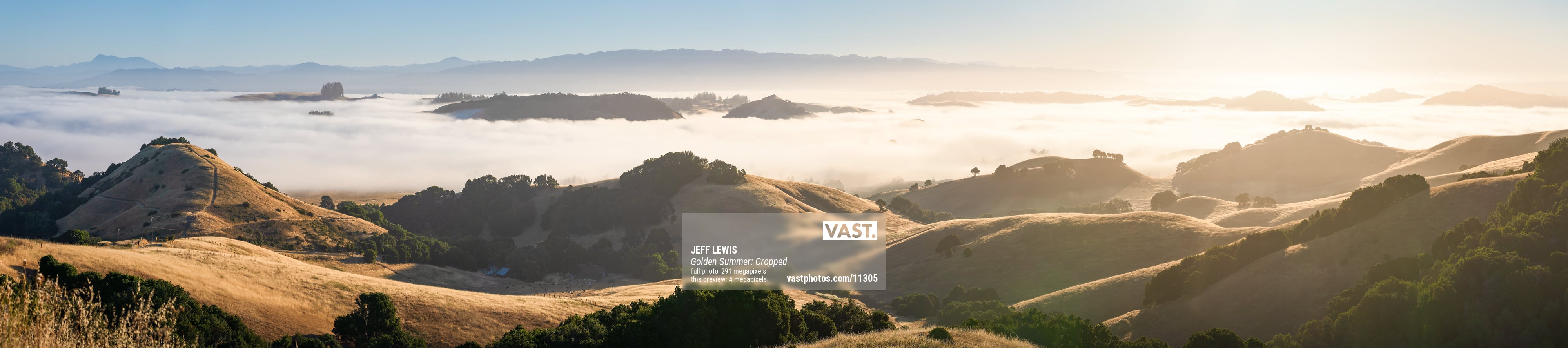 This view is commonly photographed in the winter, with Tule fog. It is absolutely gorgeous then. However, most photographers avoid it in the summer, when low fog in the valleys is much more rare. However, I realized summer has a much more favorable sun angle -- in the winter, the sun rises behind a big hill, and the hills just don't get the same stunning golden light. So, seeing a rare day of low fog in the summer, I gave it a try, and it was everything I hoped for! Plus, the two other photographers around both left just as the sun came up, so I enjoyed this spectacular view all to myself. It was quite a clear morning, so I was able to make this VAST photo!