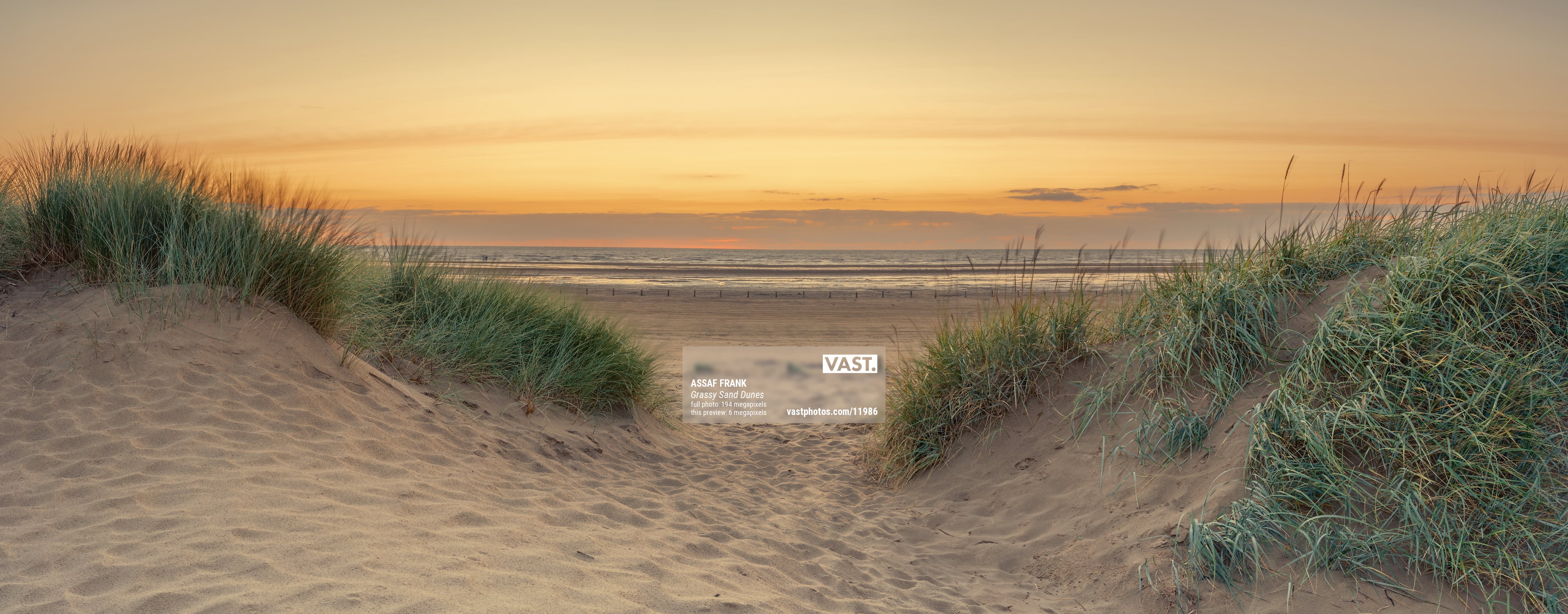 The golden hues of the setting sun illuminate the serene coastal landscape, where grassy sand dunes frame a tranquil view of the sea. The gentle curves of the dunes, adorned with windswept tufts of grass, guide the viewer's gaze towards the vast beach and shimmering waters. The sky is painted with warm orange and soft pastel tones, creating a harmonious contrast with the deepening shadows on the sand. This idyllic scene captures the peaceful essence of a coastal sunset, inviting reflection and a sense of calm.