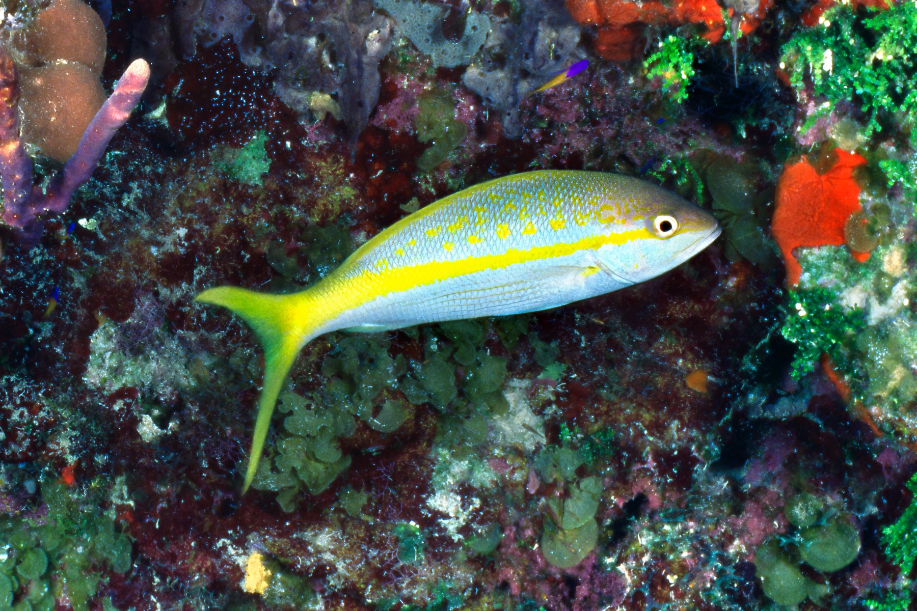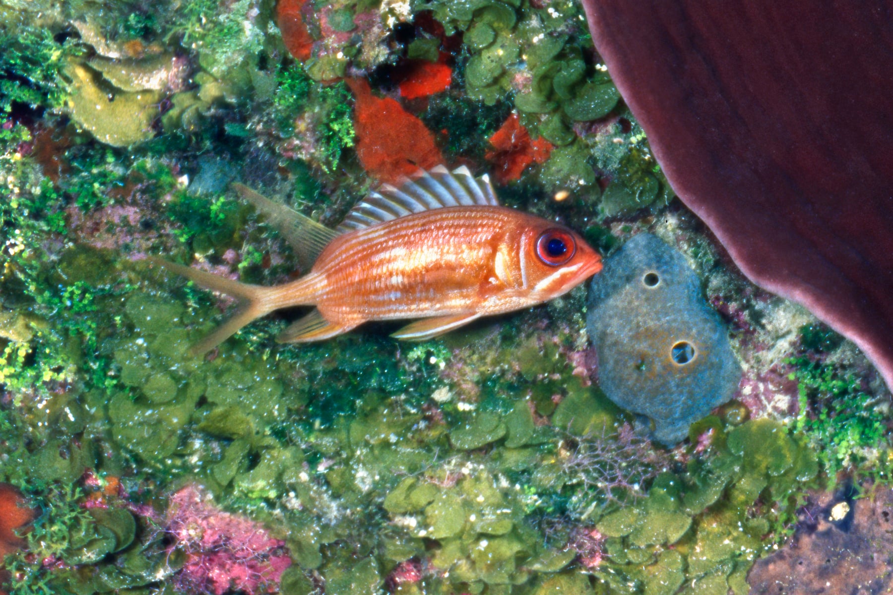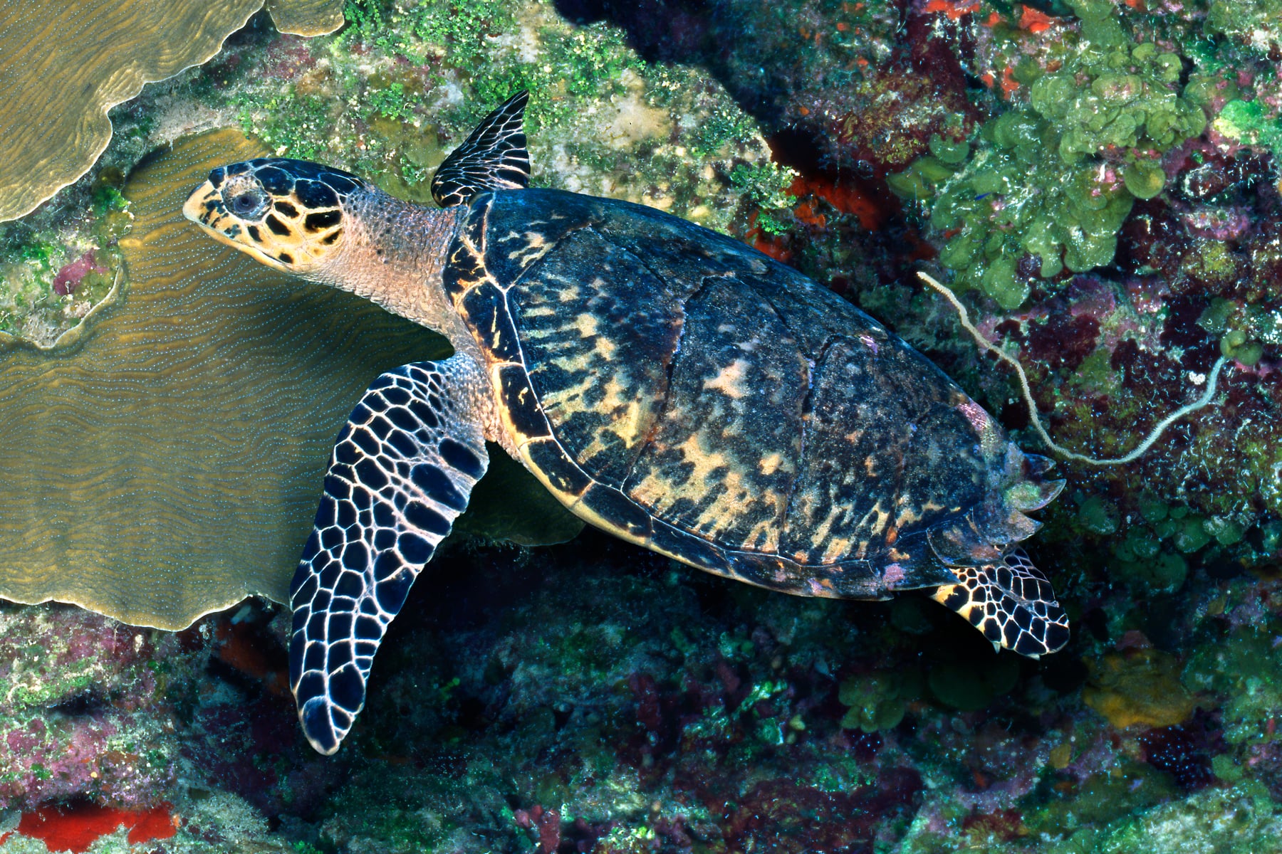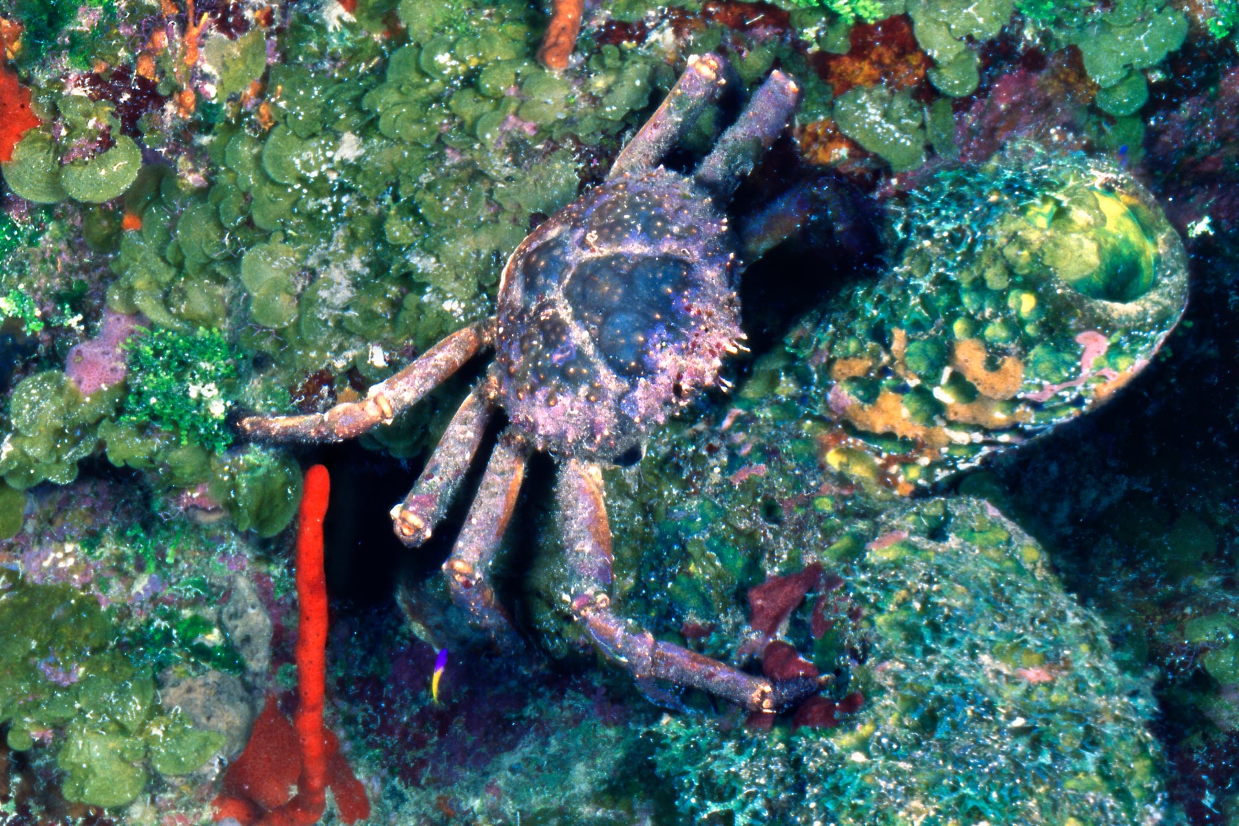 Bloody Bay Wall is a unique underwater formation in the reef walls surrounding Little Cayman Island, where the reef wall are steep and shear. The reef here is vertical, and the walls are so steep as to be nearly flat as the side of a tall building for almost a mile. At the heart of this super-resolution image is a magnificent cluster of of sheet corals and a large Nassau Grouper being “cleaned” by smaller fish, who trade services by removing parasites on the grouper’s body in return for a meal.