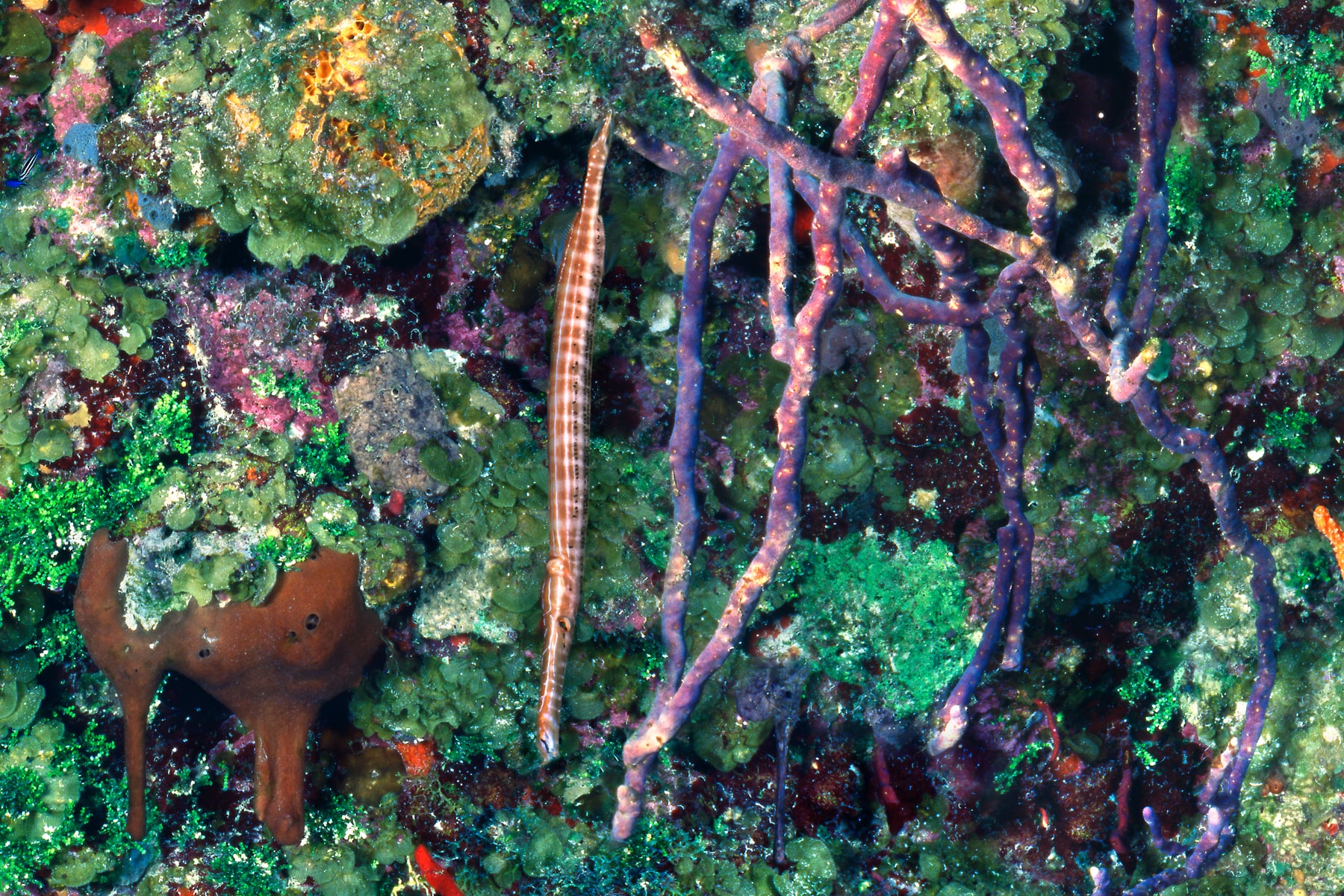 A portion of the famous dive site “Bloody Bay Wall” is captured in this life-size photomosaic, assembled manually from hundreds of 35mm slides taken with a Nikonos V camera mounted on a custom underwater platform.