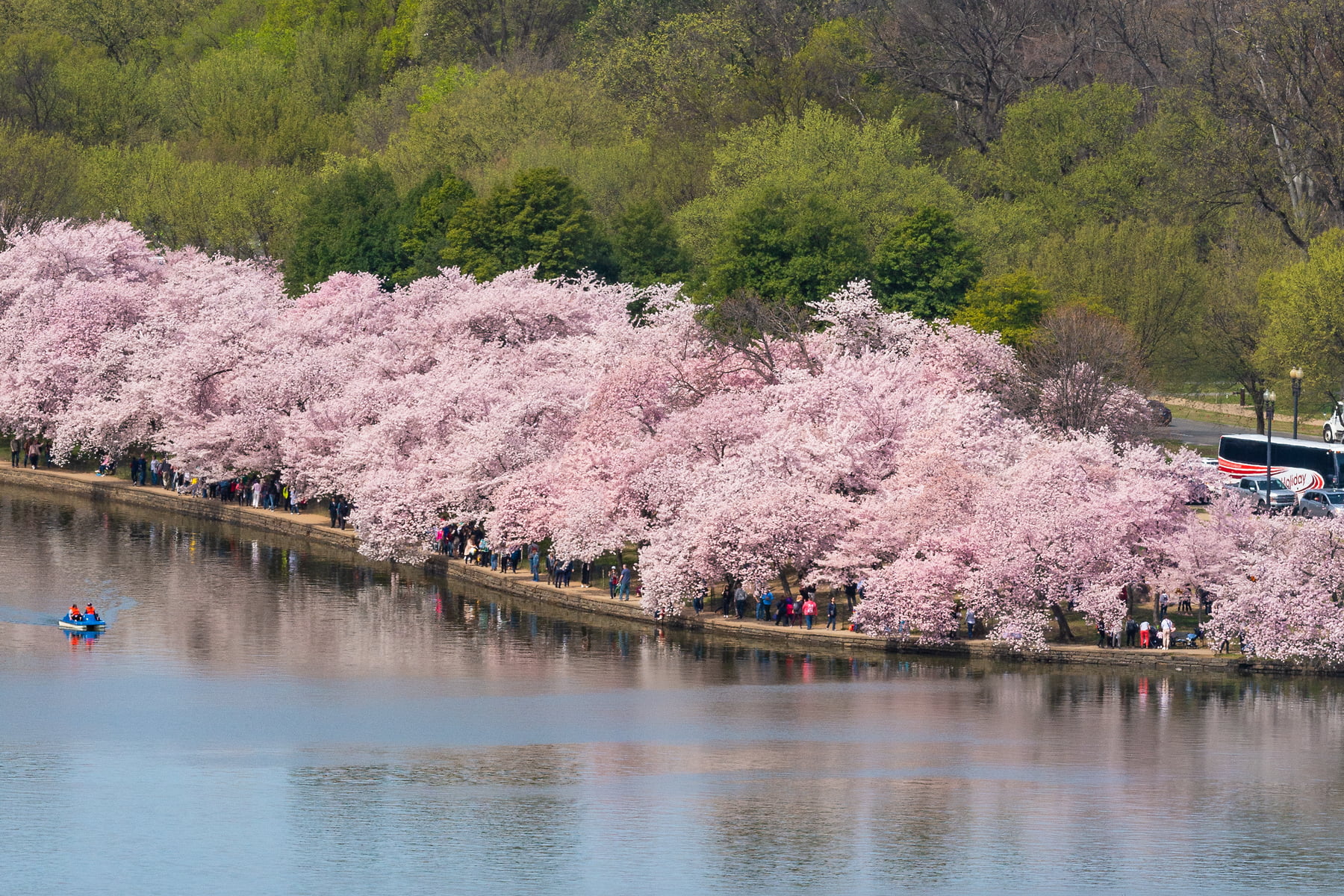The iconic Cherry Blossoms of Washington, D.C. in their peak bloom. The Japanese term “Hanami” translates literally to flower viewing and refers to the enjoyment of the transient beauty of flowers. The Washington, D.C. Cherry Blossom peak bloom in late March / early April attracts an estimated 1.5 million visitors a year to experience the nearly 3800 Cherry trees. Visitors will find mostly Yoshino Cherry Trees, but also Kanzan Cherry, Akebono Cherry, Usuzumi Cherry, Black Cherry, Choke Cherry, Higan Cherry, Okame Cherry, Oshima Cherry, Snowgoose Cherry, Sour Cherry, Sweet Cherry, and a handful of other varieties. The cherry trees in bloom mark the first real sign of spring in the area. The views along with the warmer weather make it a pleasure for tourists and locals alike to get out and enjoy downtown Washington, D.C. and the National Mall.