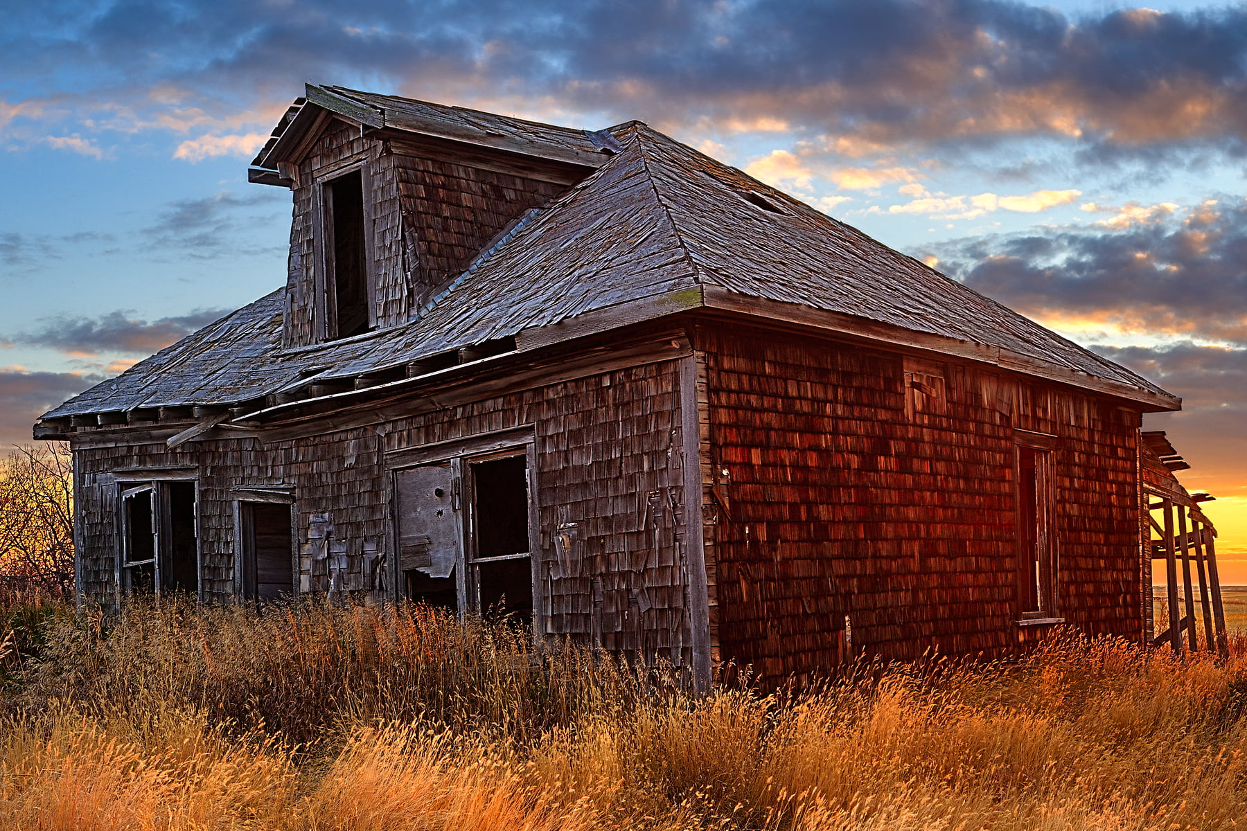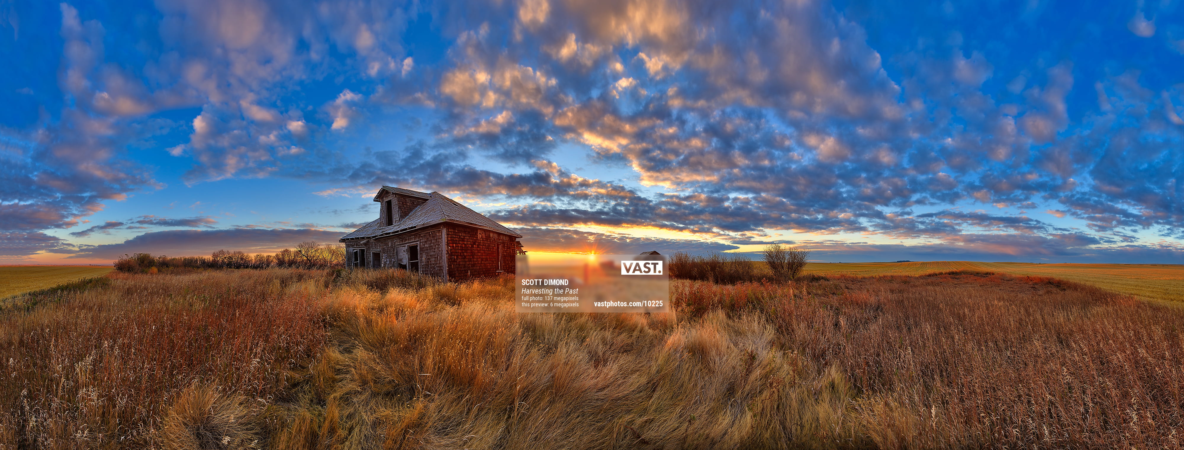 137 megapixels! A very high resolution, large-format VAST photo of farmland, grasslands, the prairie, and an old abandoned house; fine art landscape photo created at sunset by Scott Dimond on the Great Plains in Alberta, Canada.