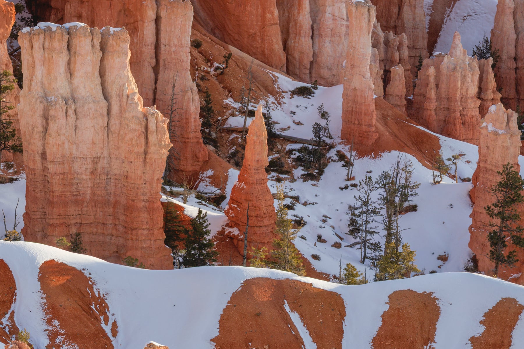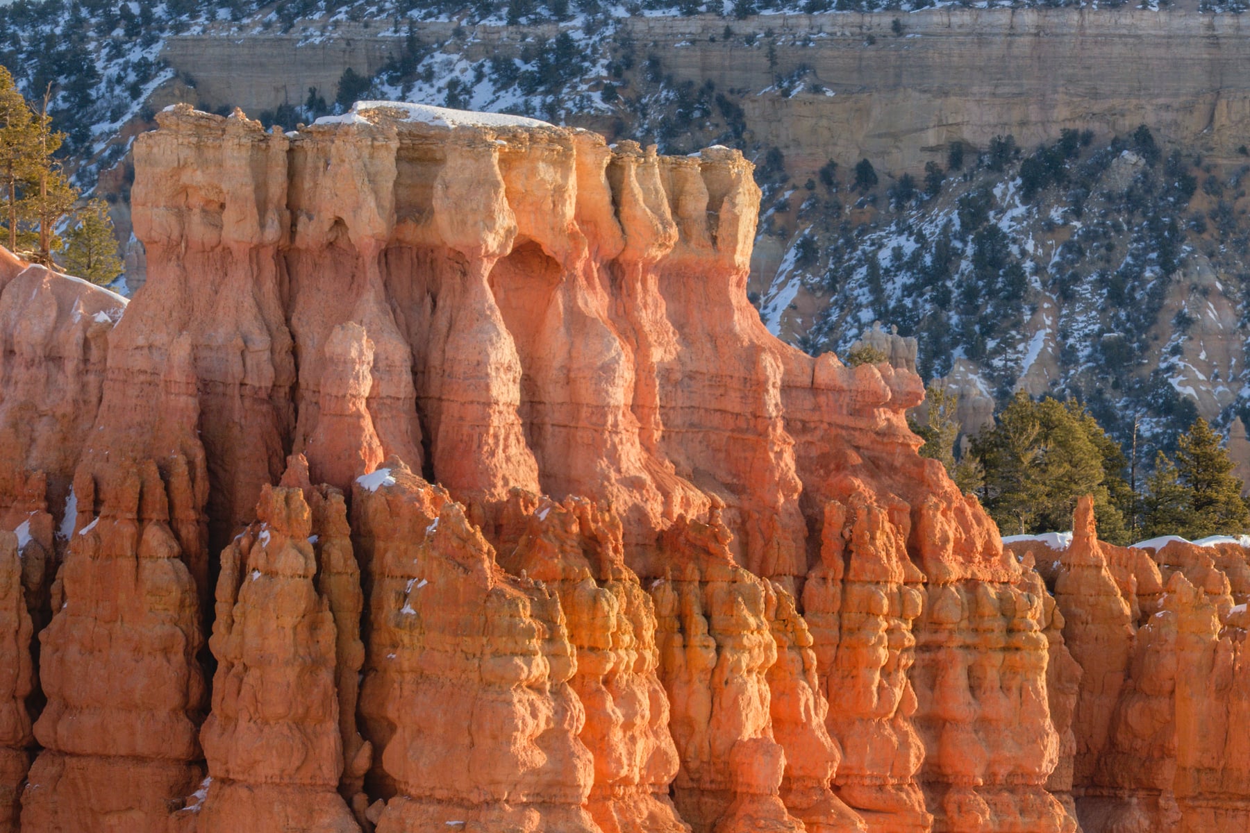 I didn't wear crampons to walk down the trail and I wish I had. The snow had been compressed into ice and it was a bit dicey in a few places. I found a place that I could use the foreground to support the rest of the image without being dominate. It's sharp and you can just reach out and touch those Hoo-doo's. The morning sun causes that nice glow and shapes all the remaining Hoo-doo's which gives this image a nice dimensional feel.
