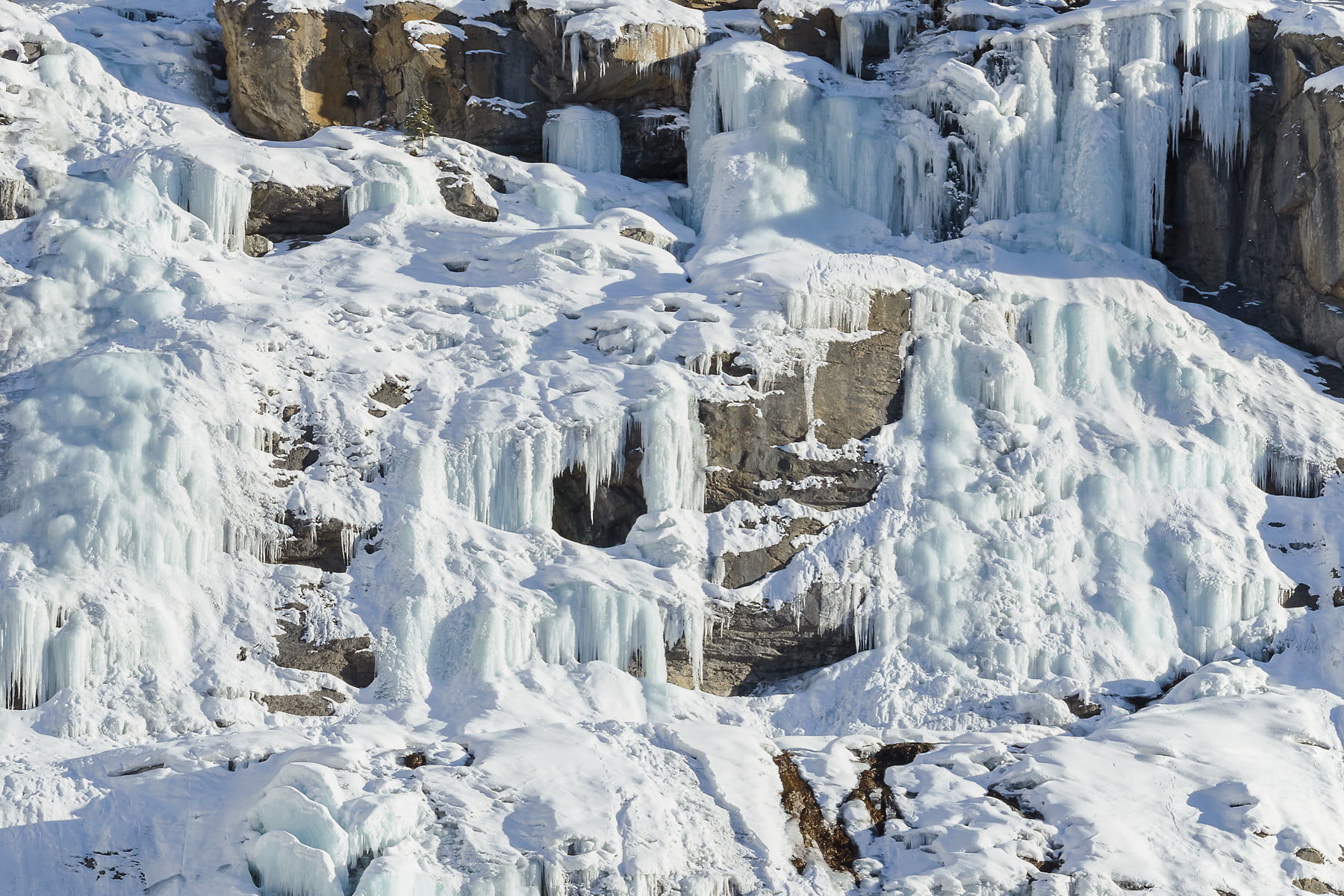 Along the Icefields Parkway, just at the northern boundary of Banff National Park and located at the western base of Cirrus Mountain is the Weeping Wall. Comprised of a collection of cliffs that are over 300 meters (1000 feet) high, the waterfalls are fed by a spring higher up on the mountain that never stops flowing. In spring and summer, the cliffs are usually covered with cascading waterfalls but in winter, the frozen water creates towering pillars of ice, creating one of the best known and sought-after waterfall ice climbing destinations in Canada.