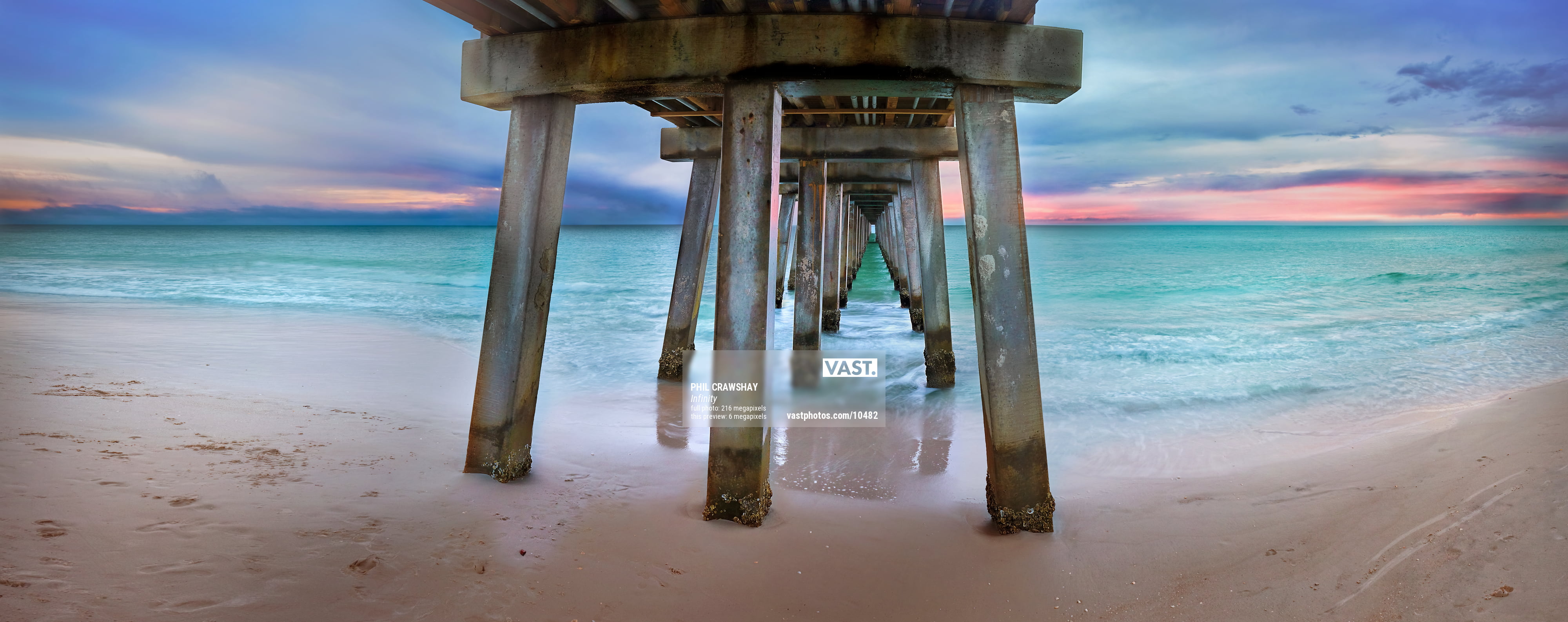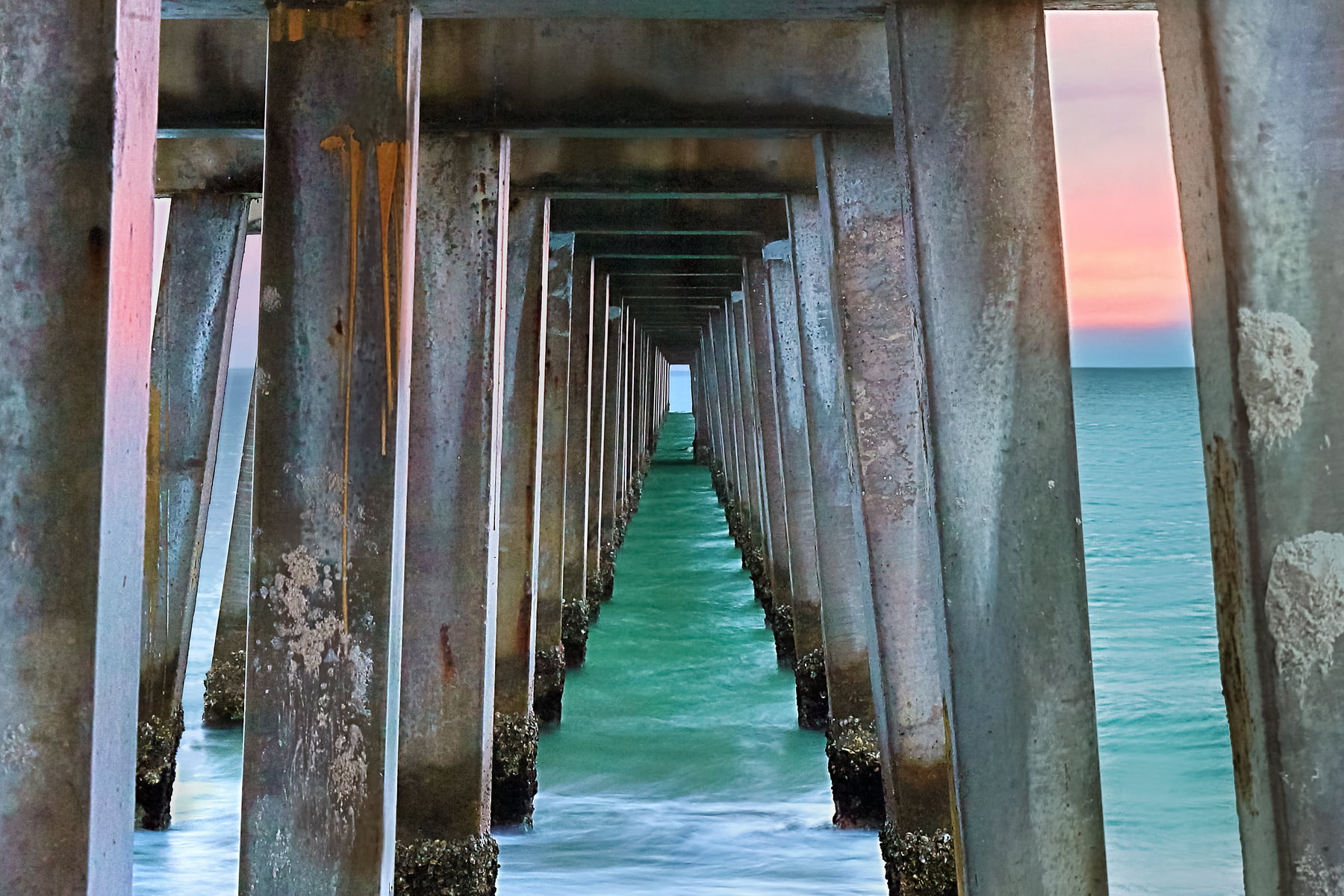 Under the pier at Naples Beach, Florida photographed at sunset and featuring a beautifully colored sky.