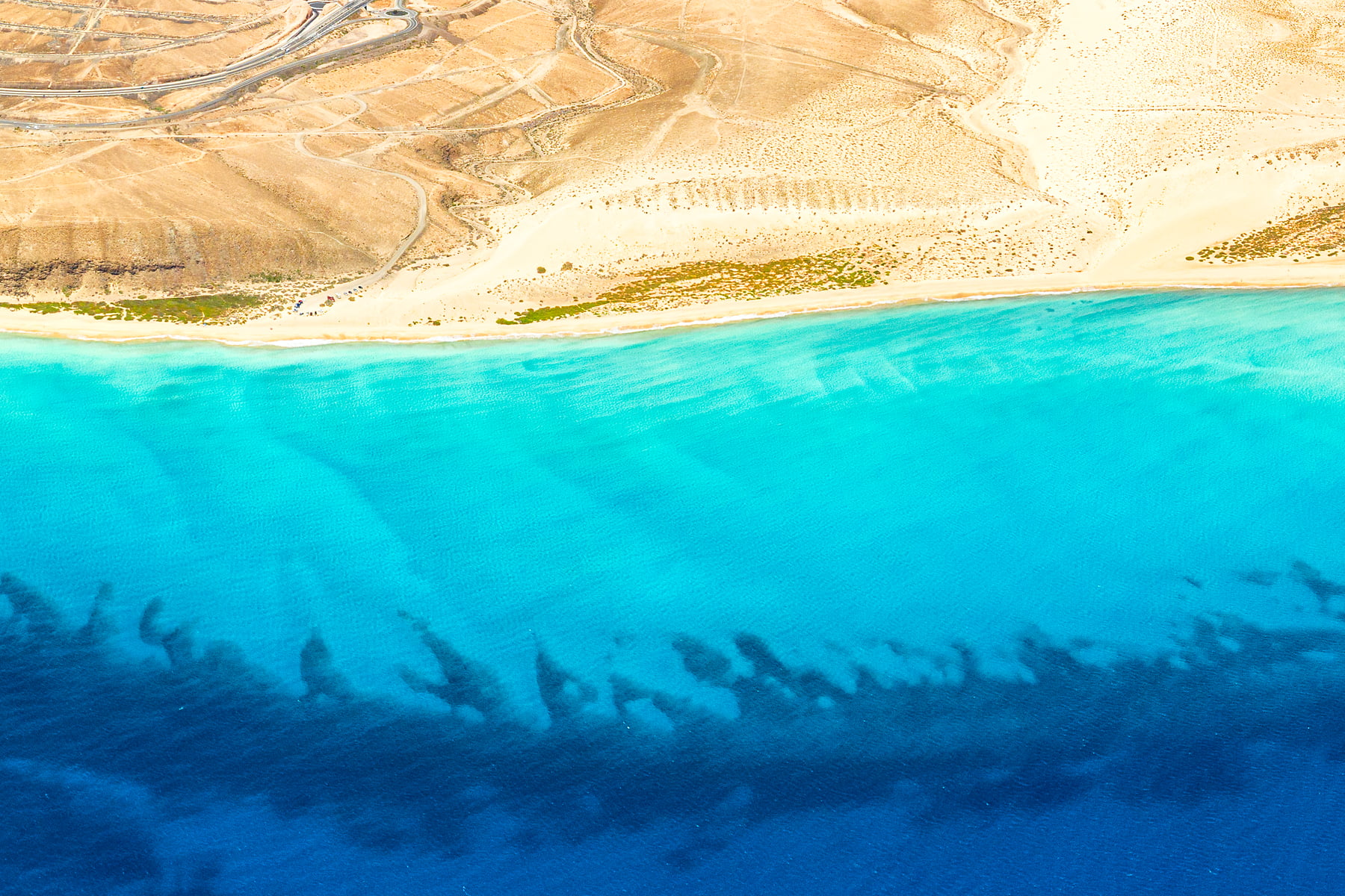 Aerial view of the clear sky above the white sandy beaches of Costa Calma washed by the turquoise sea. Jandia Natural Park, Fuerteventura, Canary Islands, Spain