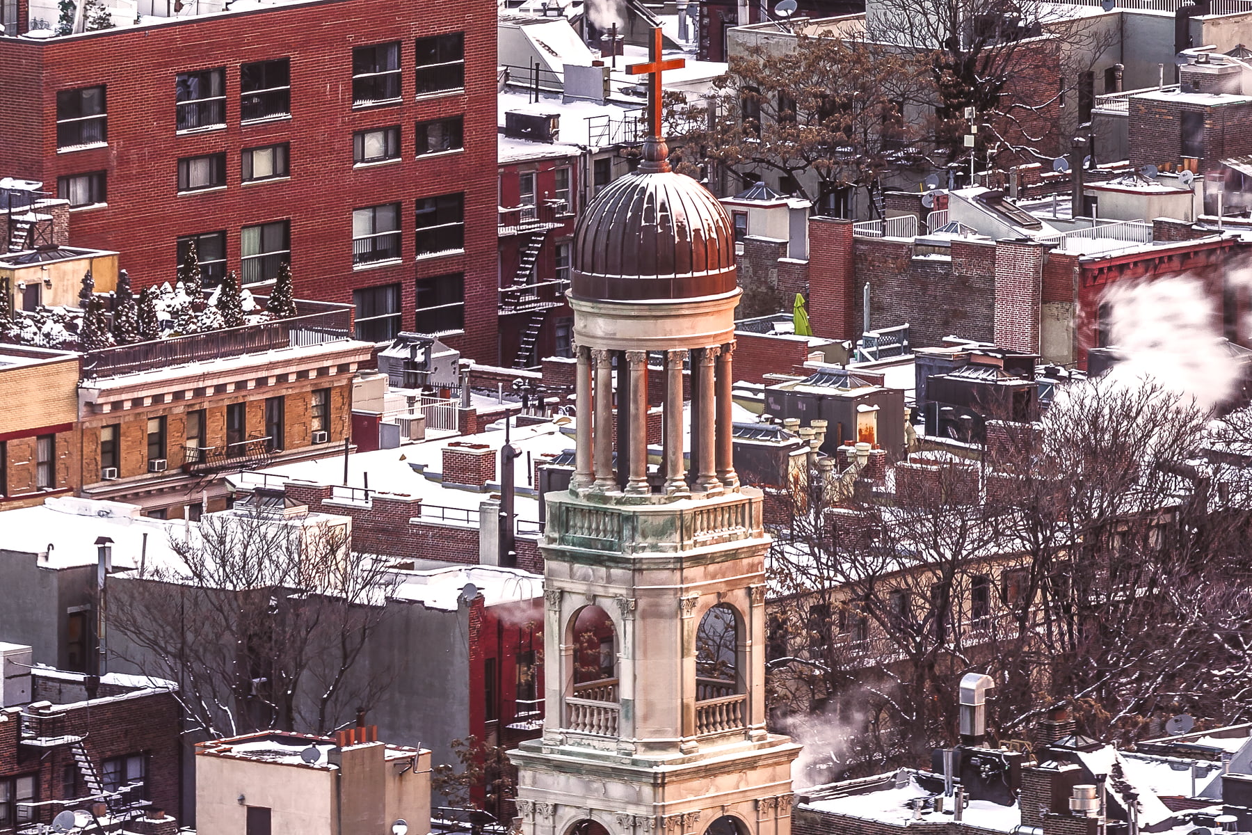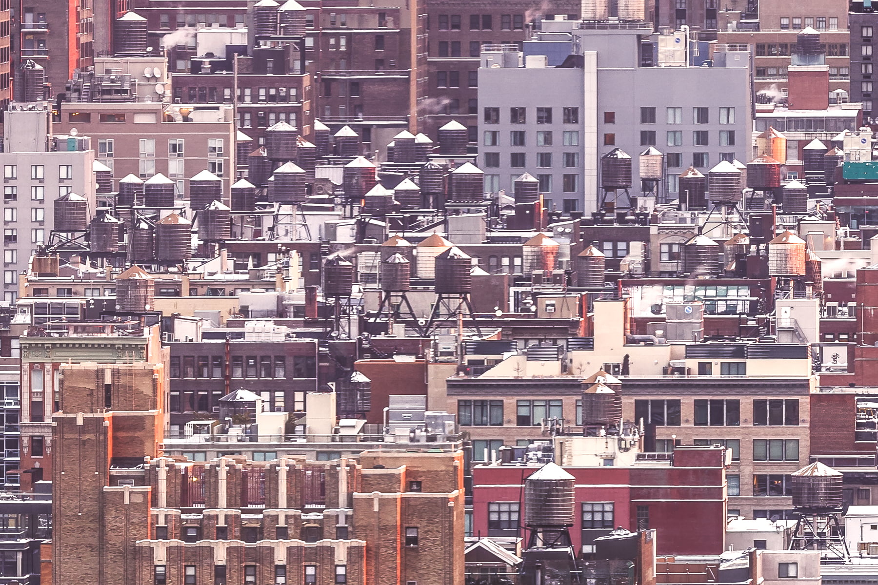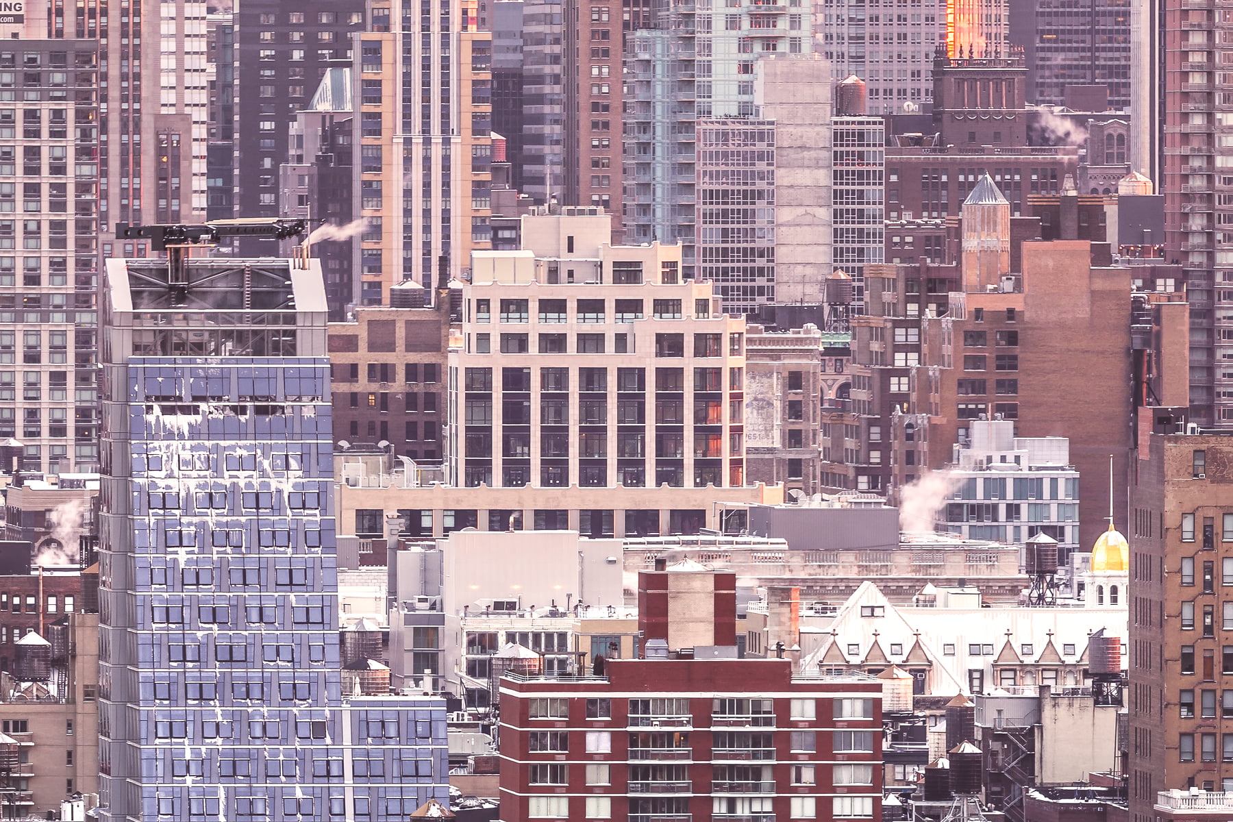 The sky began to glow with a beautiful, subdued peach-pink hue, casting the entire city in a heavenly light. Complementing this were the typically-drab rooftops that were now now shining with their thick coats of bright white snow. It was a sublime winter scene, the likes of which few New Yorkers have ever witnessed from as stunning a vantage point.