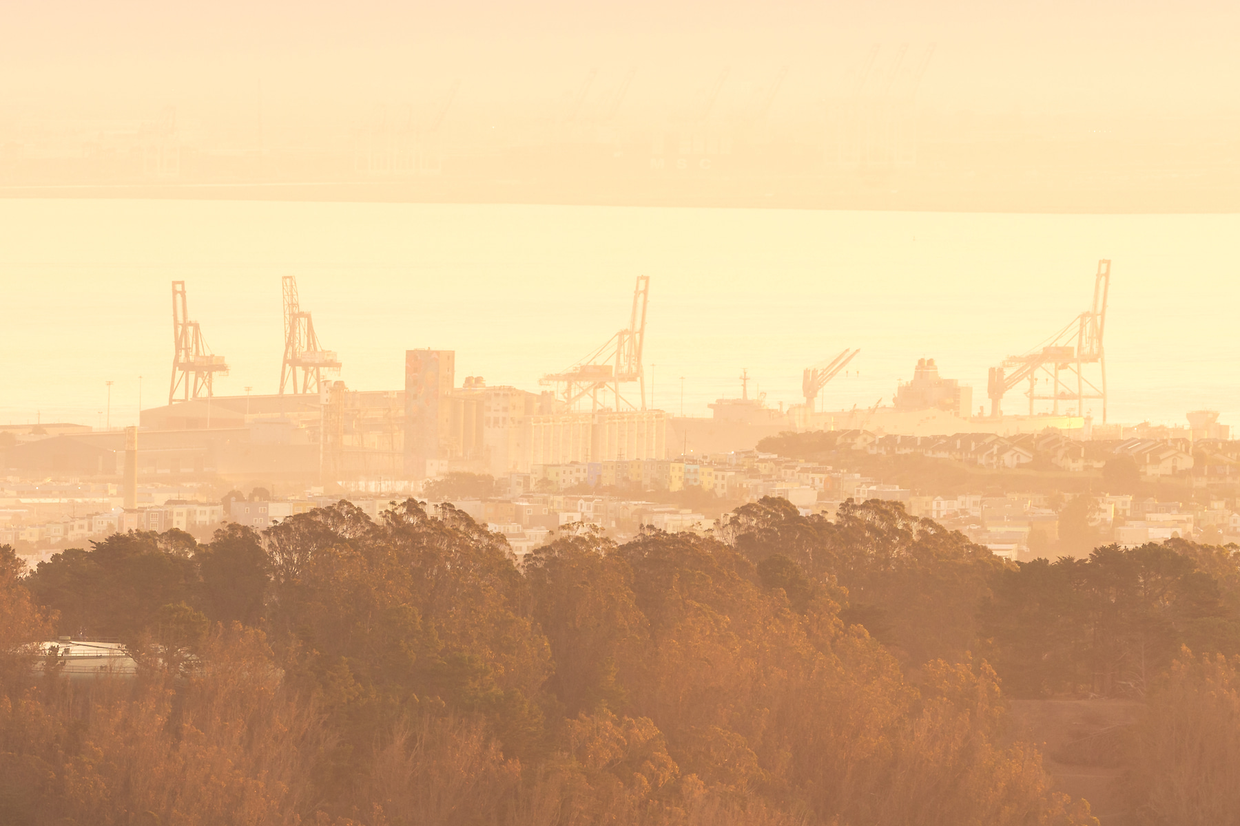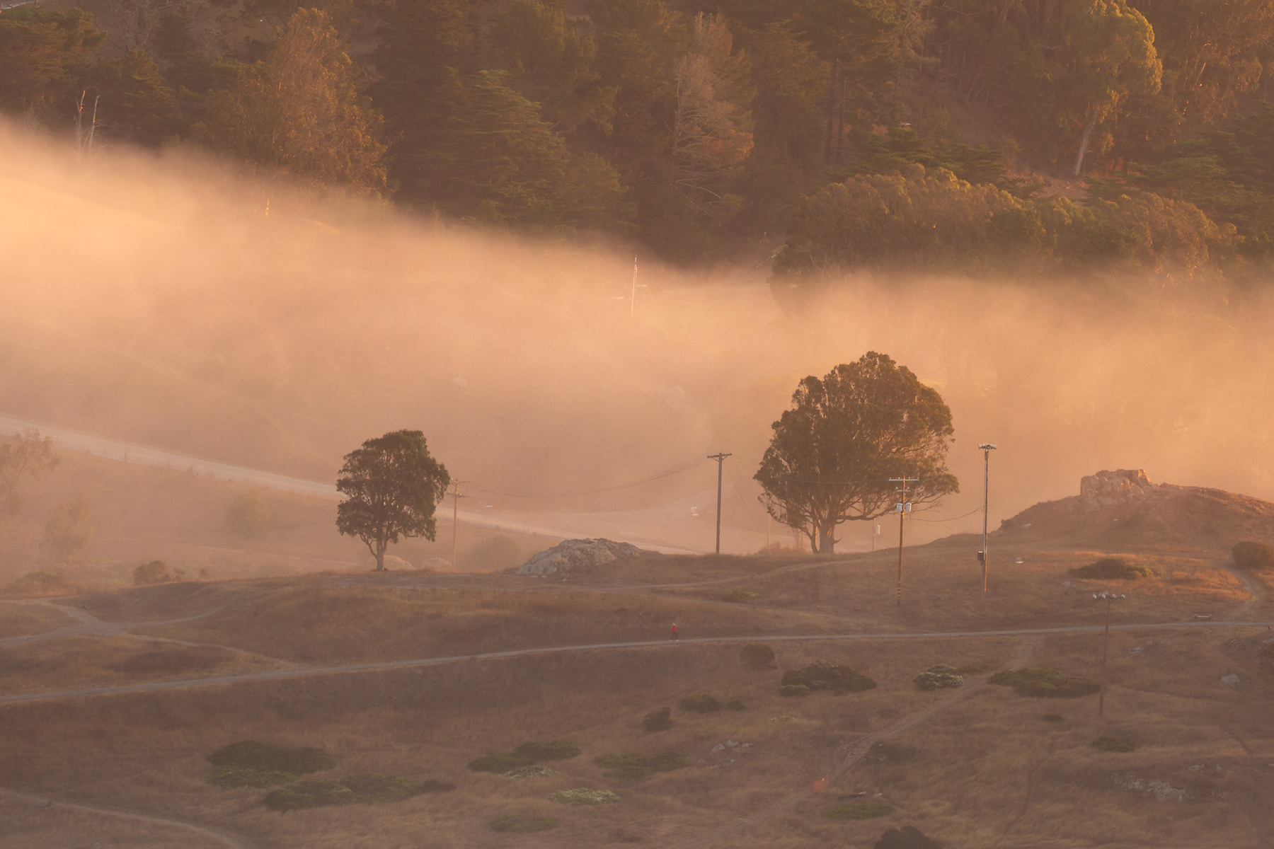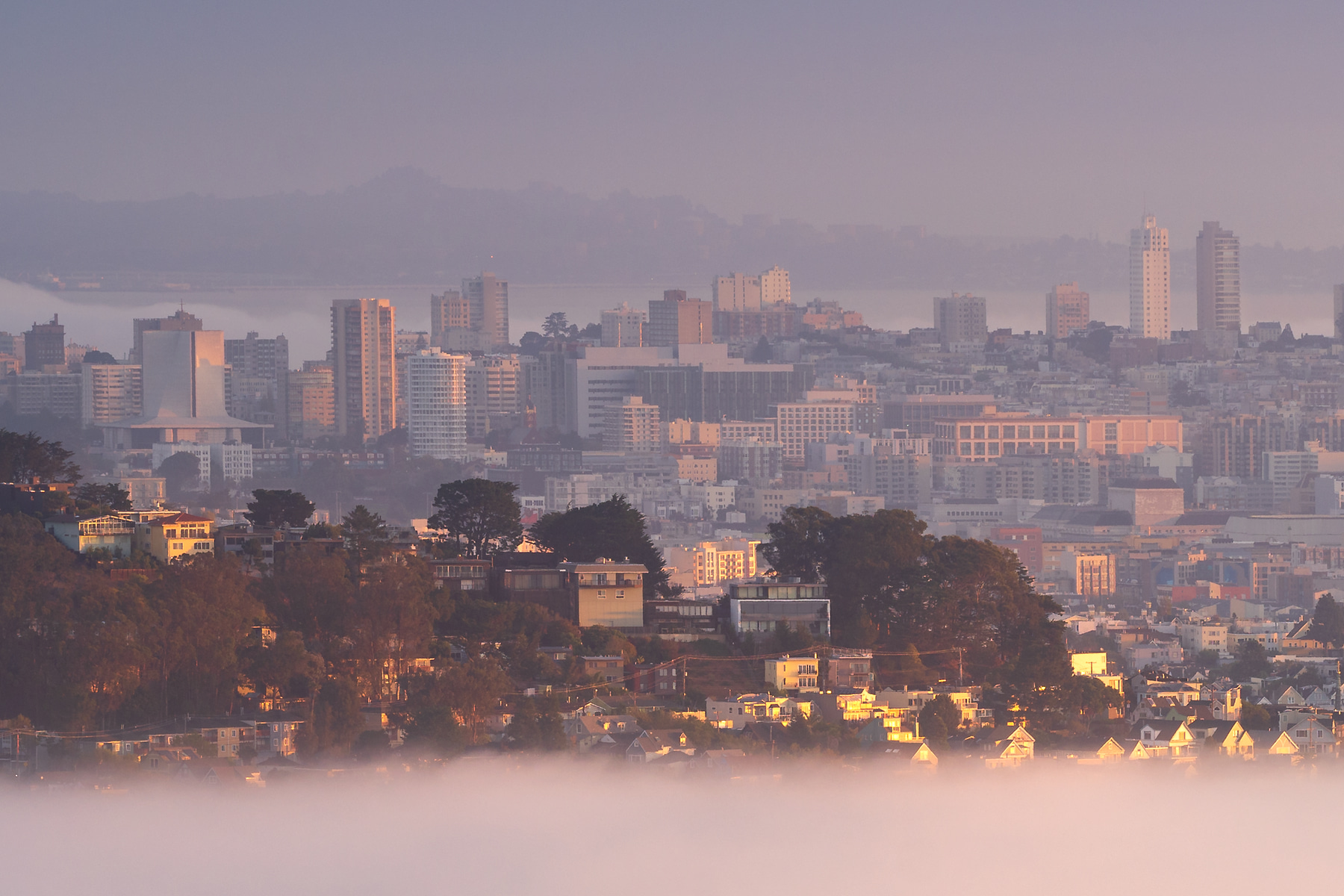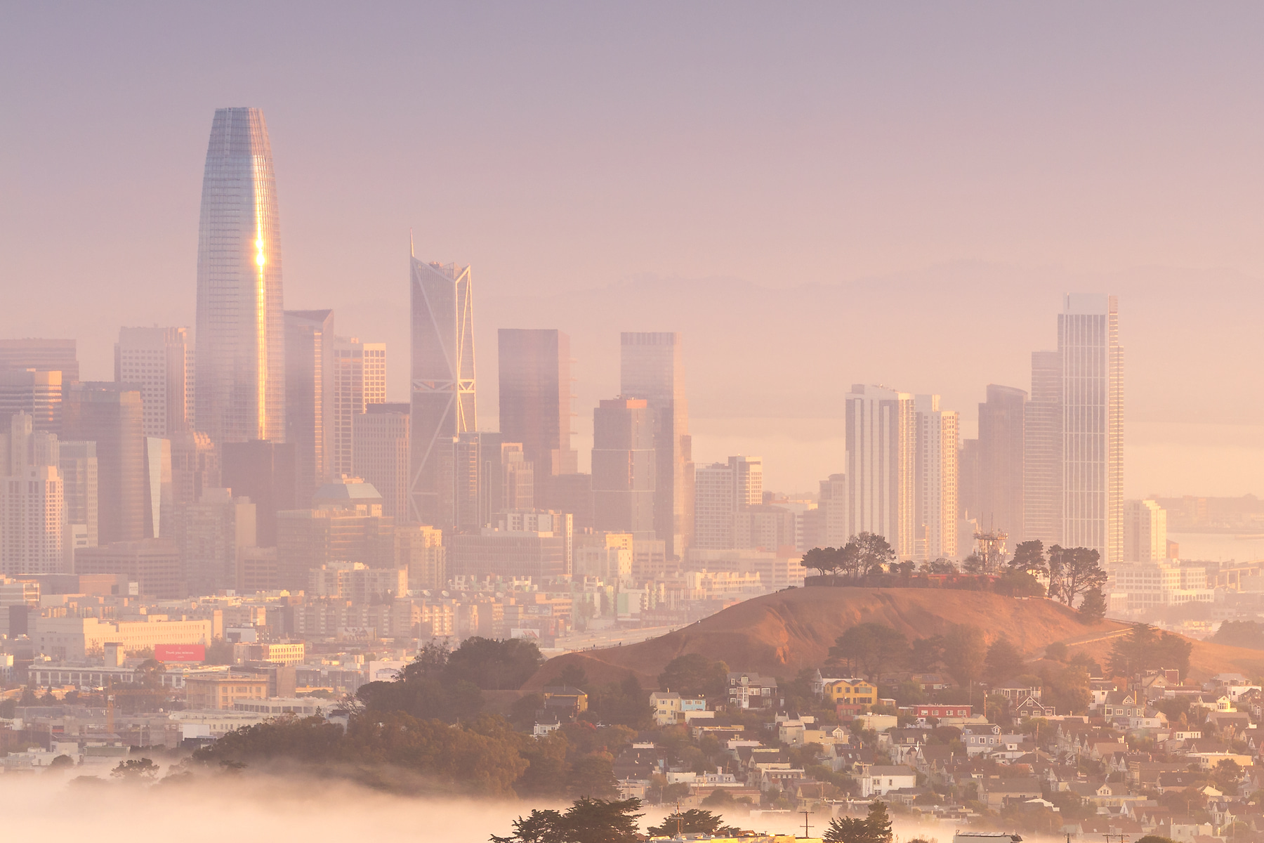 This VAST photo shows the San Francisco skyline, peeking out from behind its rolling hills and a blanket of fog, featuring neighborhoods that are rarely spotlighted in photos. As the sun rose, it bathed the scene in stunning golden light, which was the lighting I chose for this image. It needs to be seen large, and up close!