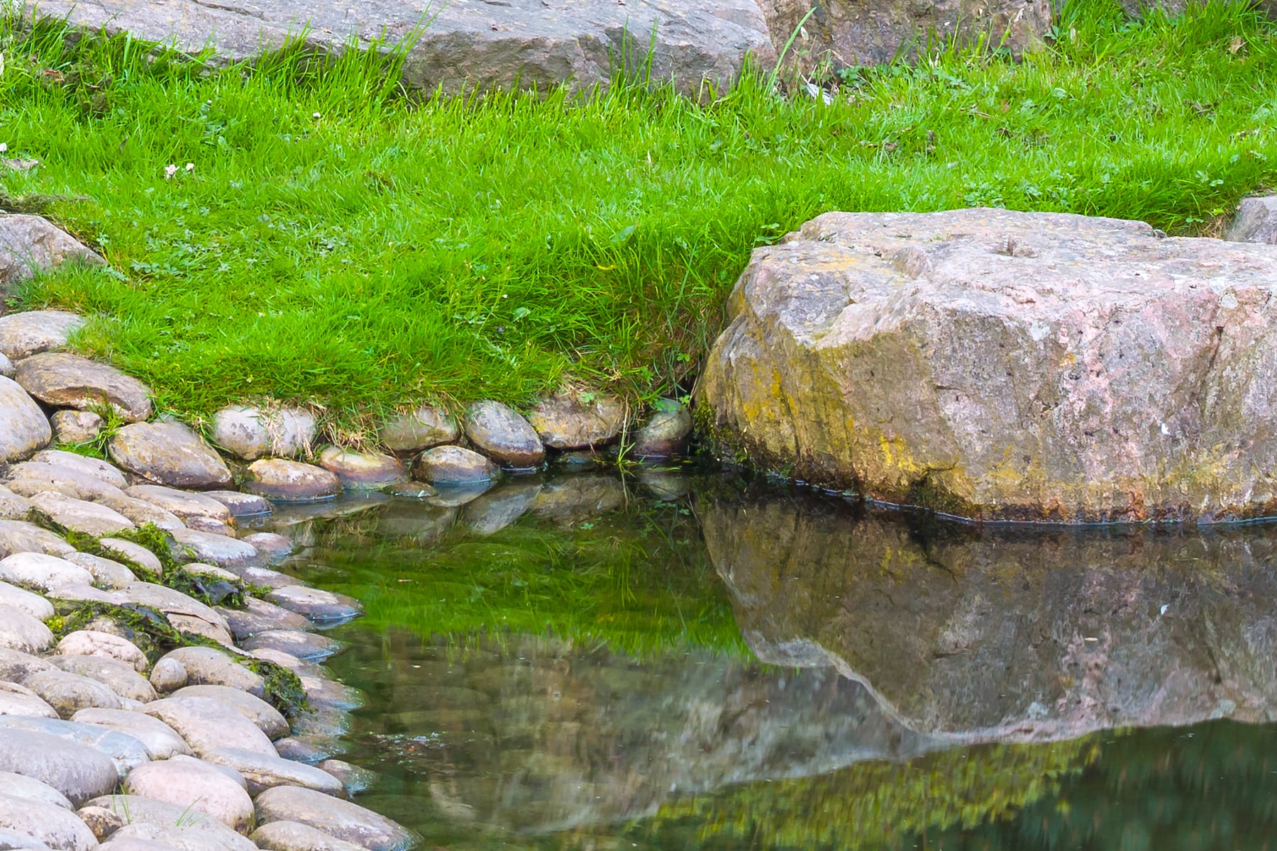 At the centre of the garden lies a tranquil pond, its surface reflecting the surrounding greenery and the gentle cascade of a small waterfall. The clear water and the carefully positioned stones provide a sense of balance and natural beauty, typical of Japanese garden design. The scene is enhanced by the presence of a traditional stone lantern and wooden bridge, which add to the authenticity and charm of the garden.