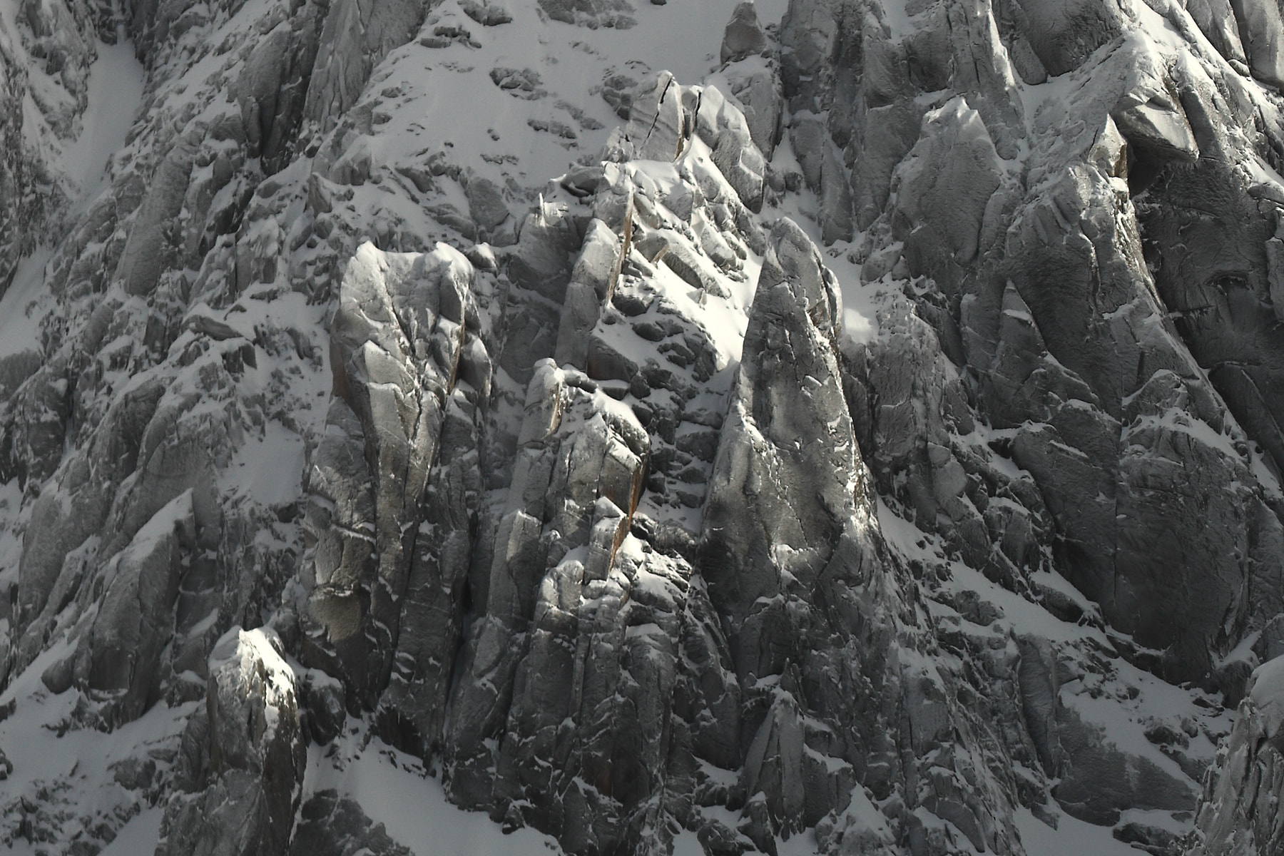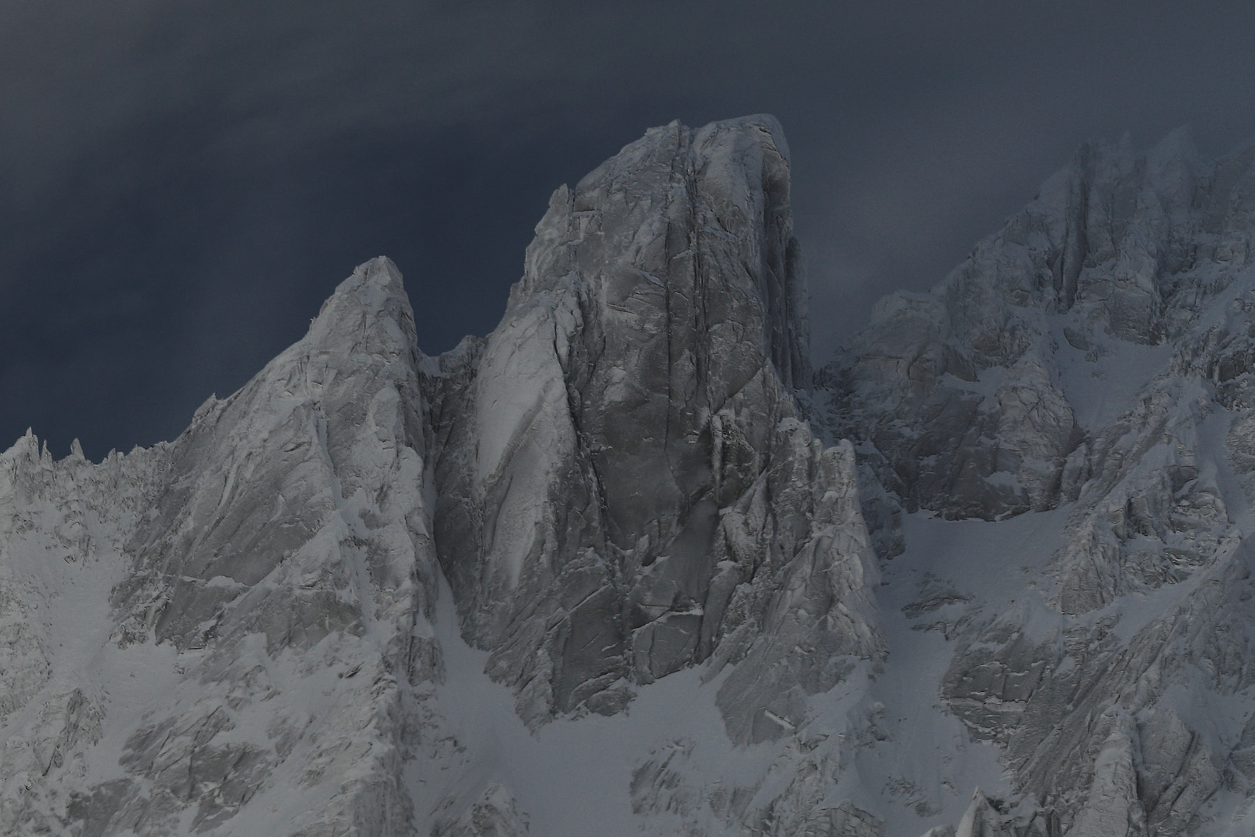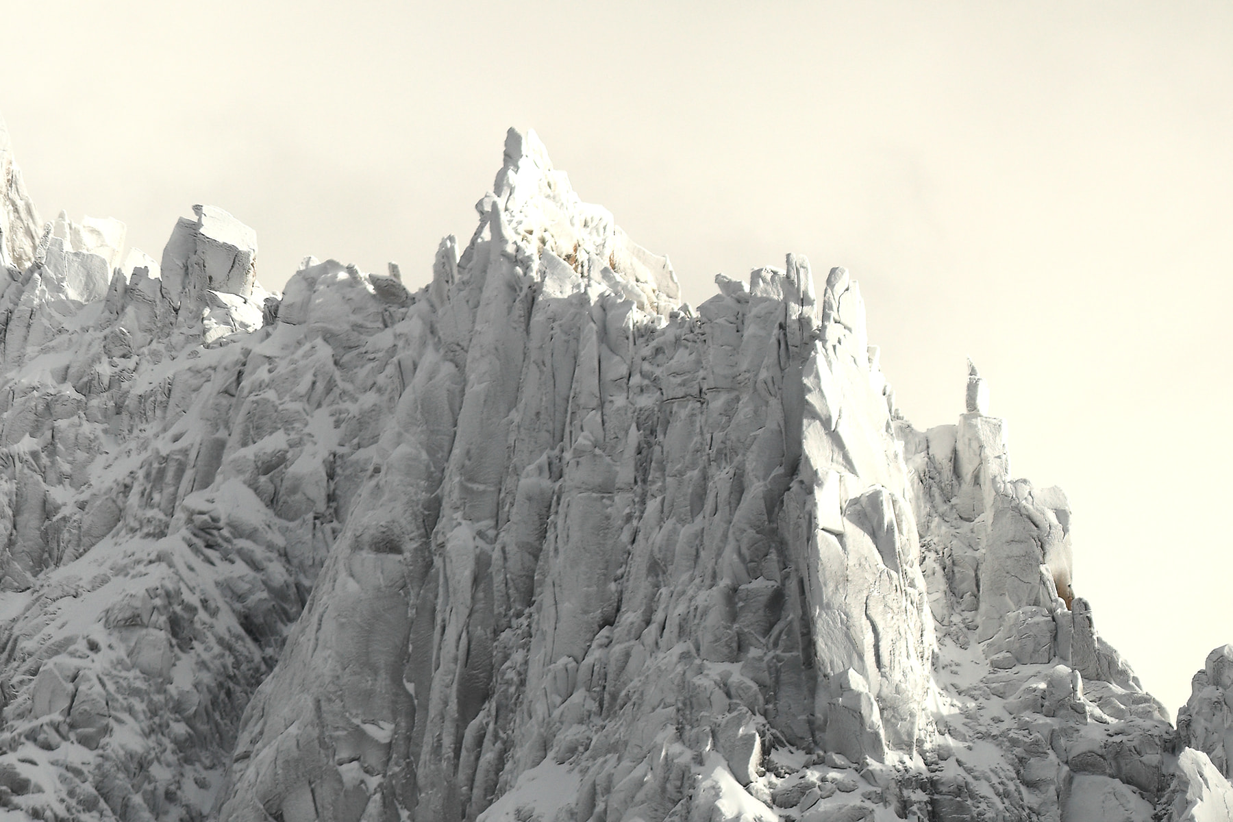 The powerful peak of "les drus" captured above the sea of ice in Chamonix Mont Blanc. The mountain is all frosted after a storm.