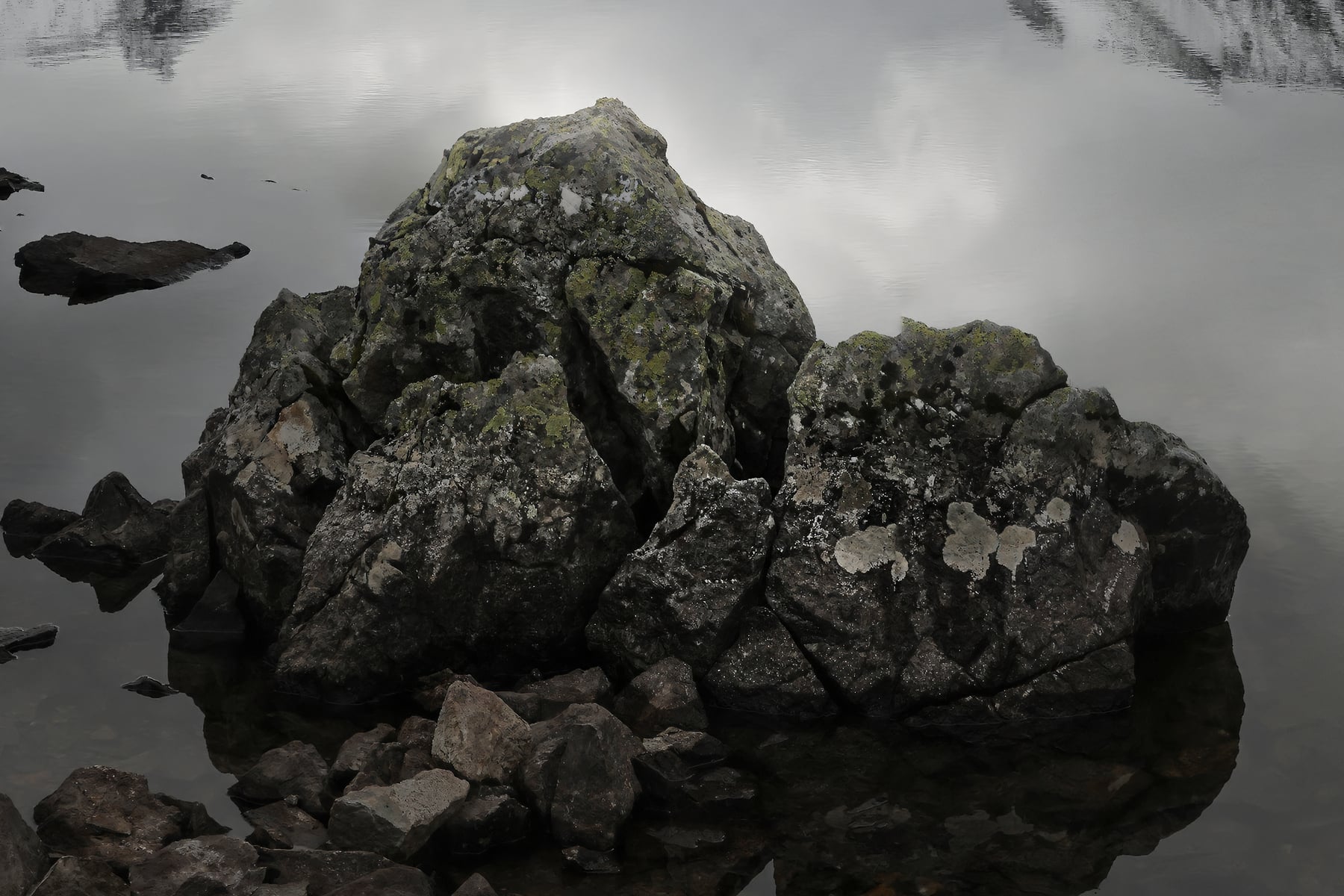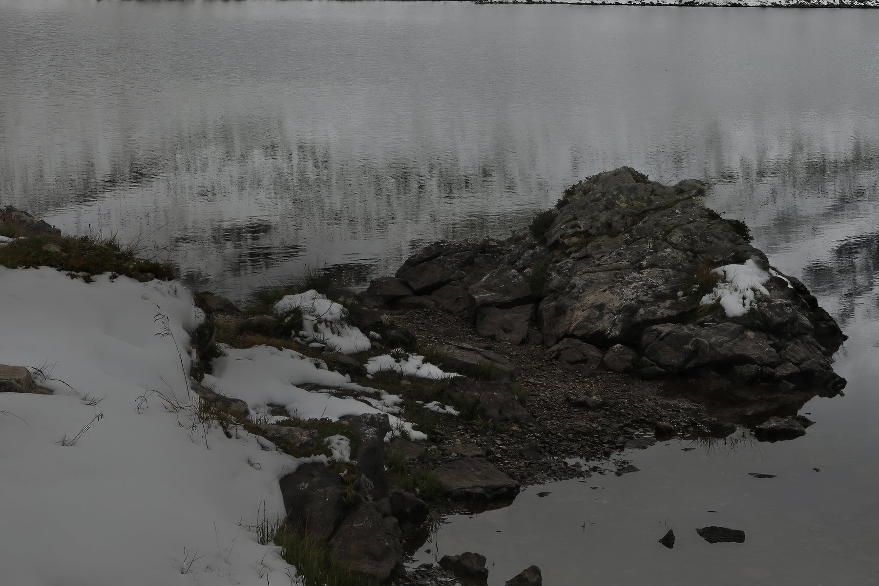 The interplay between ice, water, and rock enhances the raw beauty of this moment, where the changing season is palpable. Dark clouds loom overhead, adding an almost cinematic depth to the image, while the scattered rocks in the foreground bring a sense of scale and texture. The quiet solitude of this place is undeniable, a fleeting moment before winter fully claims the landscape.