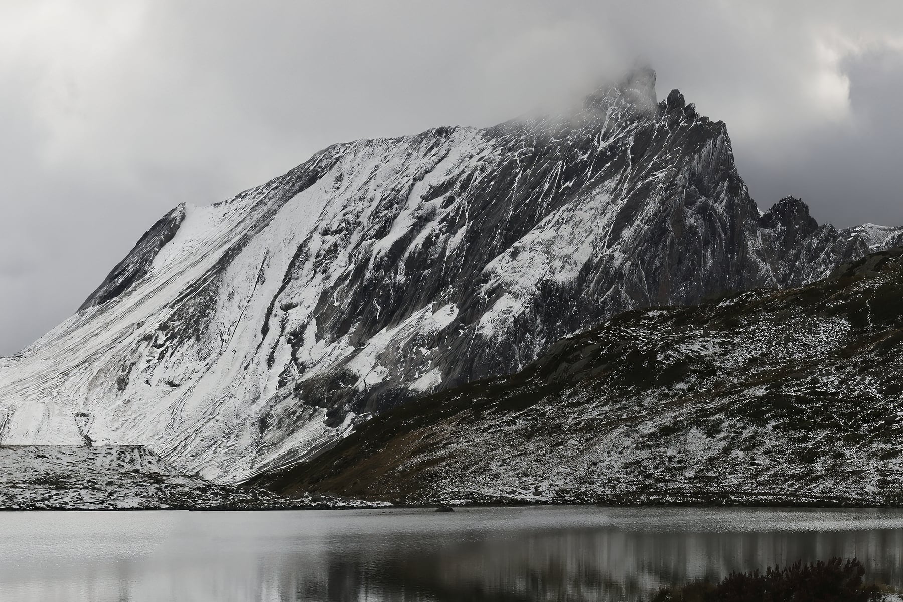 This panoramic photograph captures the shores of Lac Jovet, nestled within the Contamines-Montjoie Nature Reserve, as the first snows of the season begin to settle. The scene is enveloped in a cold, atmospheric stillness, where the muted tones of early winter contrast with the rugged alpine terrain. The lake's surface mirrors the dramatic sky and snow-covered slopes, creating a perfect balance between land and reflection.
