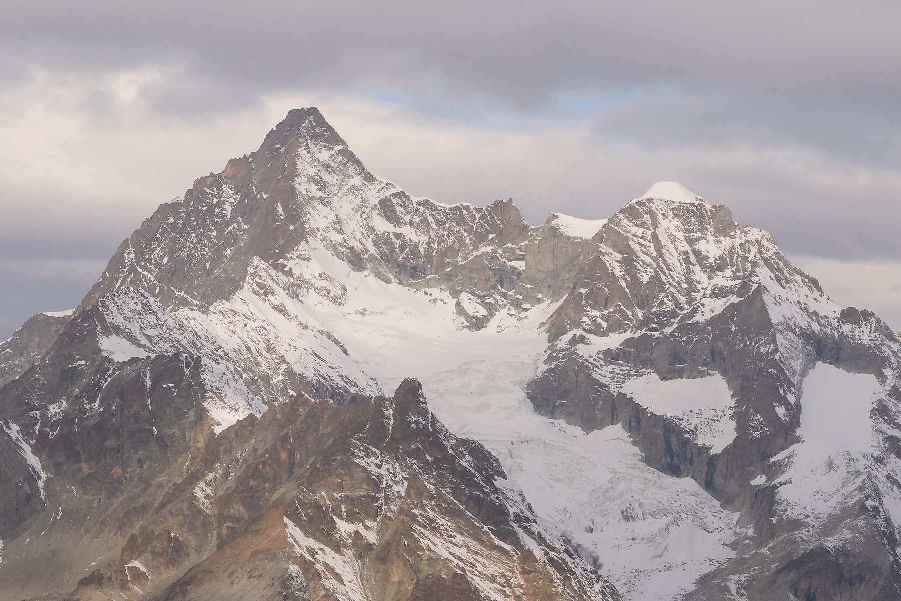 I took this photo facing the Matterhorn and its friends, high above the village of Zermatt, on a lovely morning with fluffy clouds and plenty of sunshine.