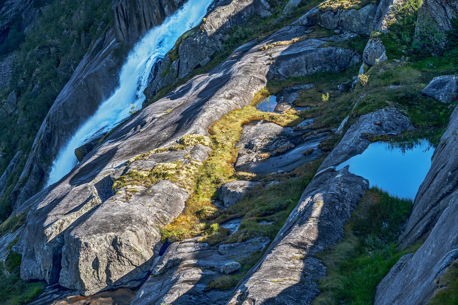Just 1,200 metres downstream, the 43-metre-high Trollforsen (Troll Waterfall) continues the river's fall. Two kilometres further on, the Helligforsen plunges into the Helligholet gorge. But the most grandiose is the Waterfall Værivassfossen, which falls from Litleverivatnet (lake in the picture on the right) 223 m deep into the Valley Storskogdalen.