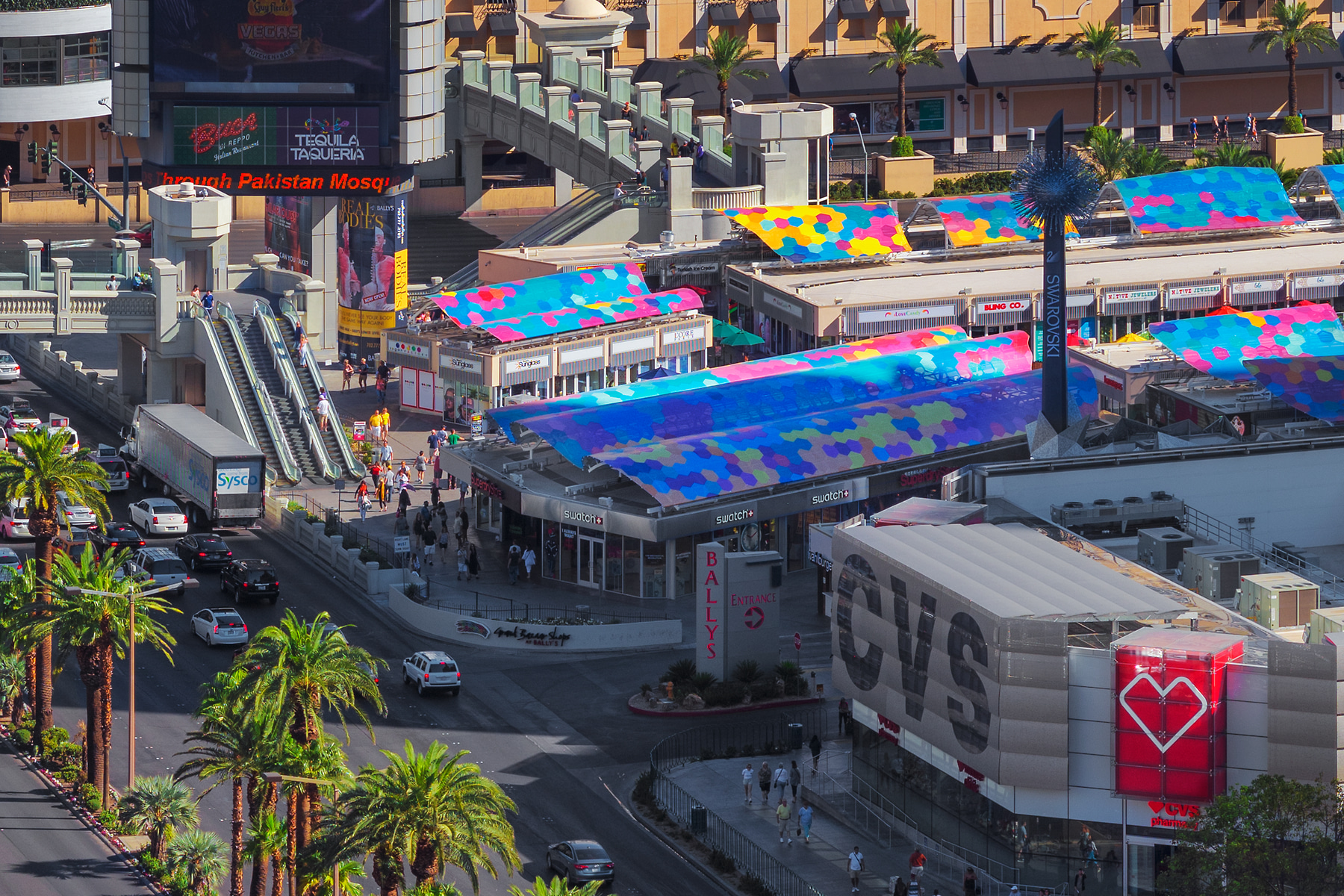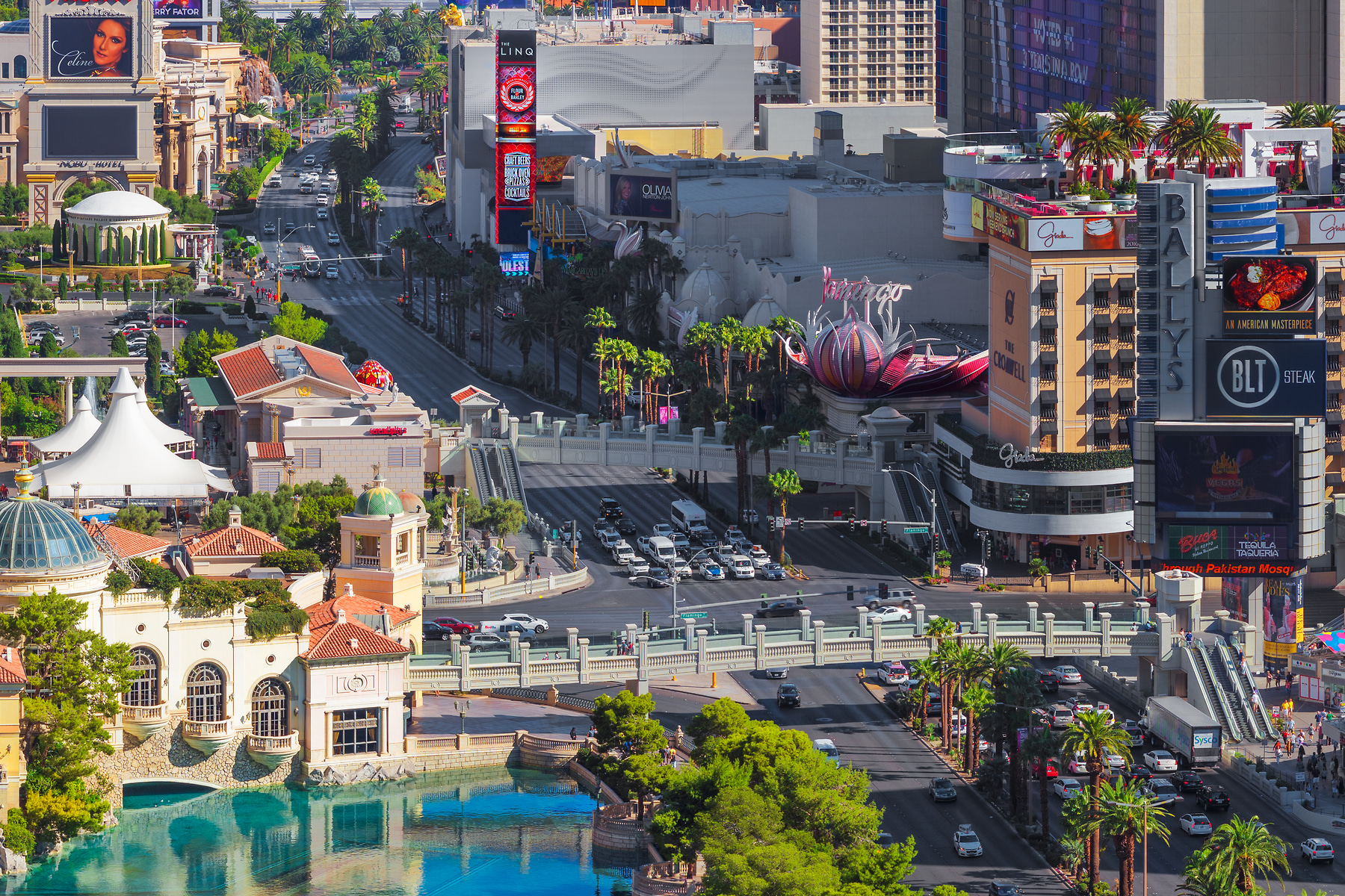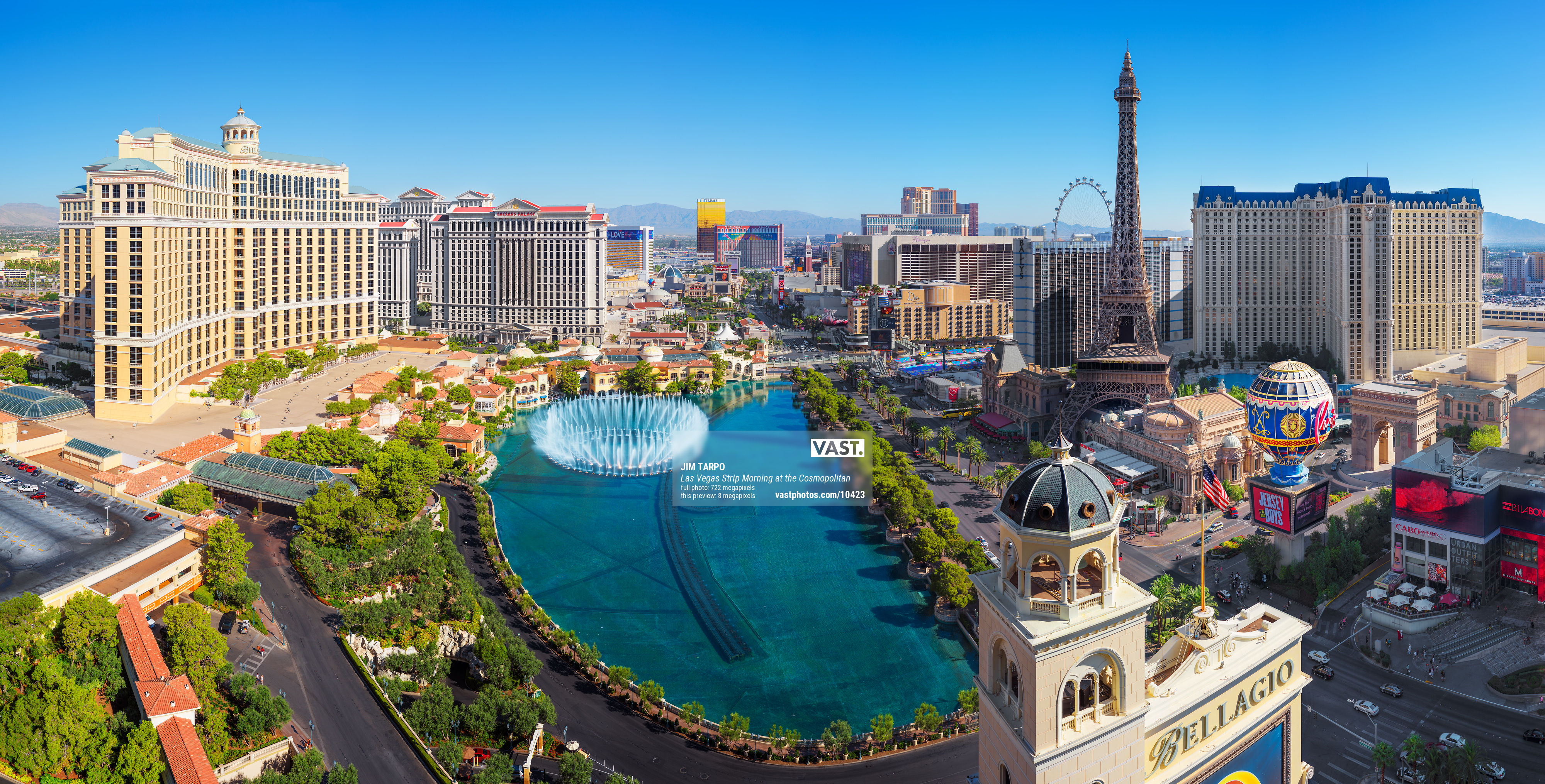 This VAST photo, captured from the balcony at the Cosmopolitan, was taken the day after the nighttime version. It is an incredibly large and detailed image from the view just south of the Bellagio. You can clearly see everything from Celine Dion on the sign at Caesars Palace to the Cirque du Soleil advertisement on the Treasure Island Casino. The people using the bridge from Bally’s to cross Las Vegas Blvd. are in clear view.
