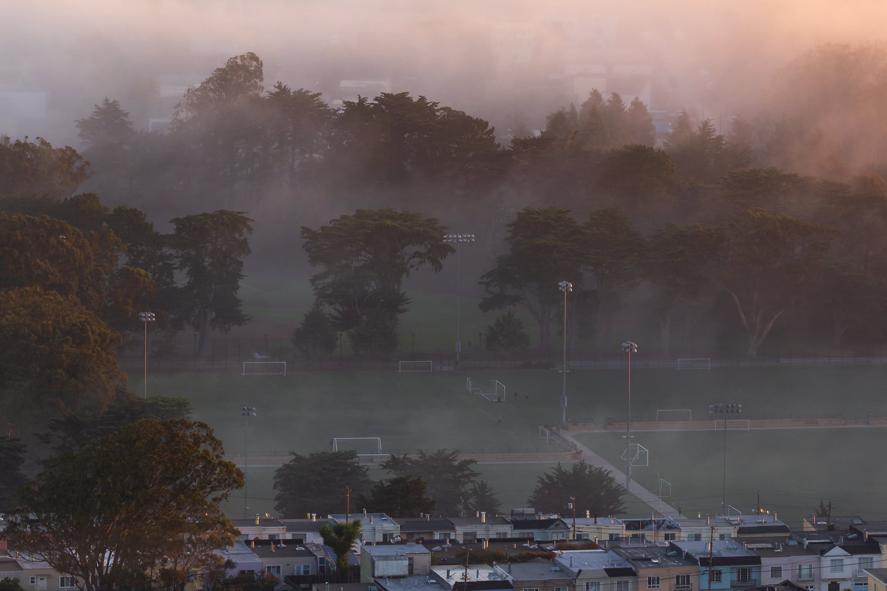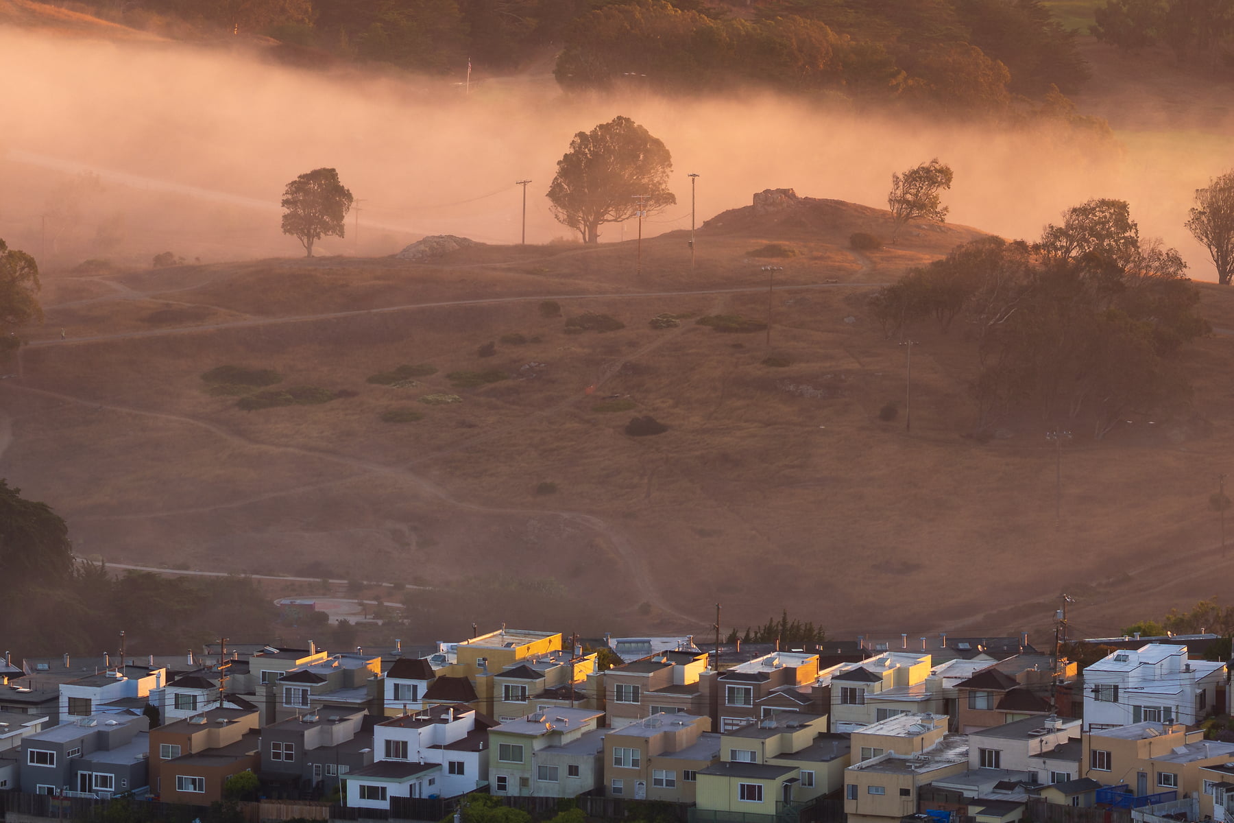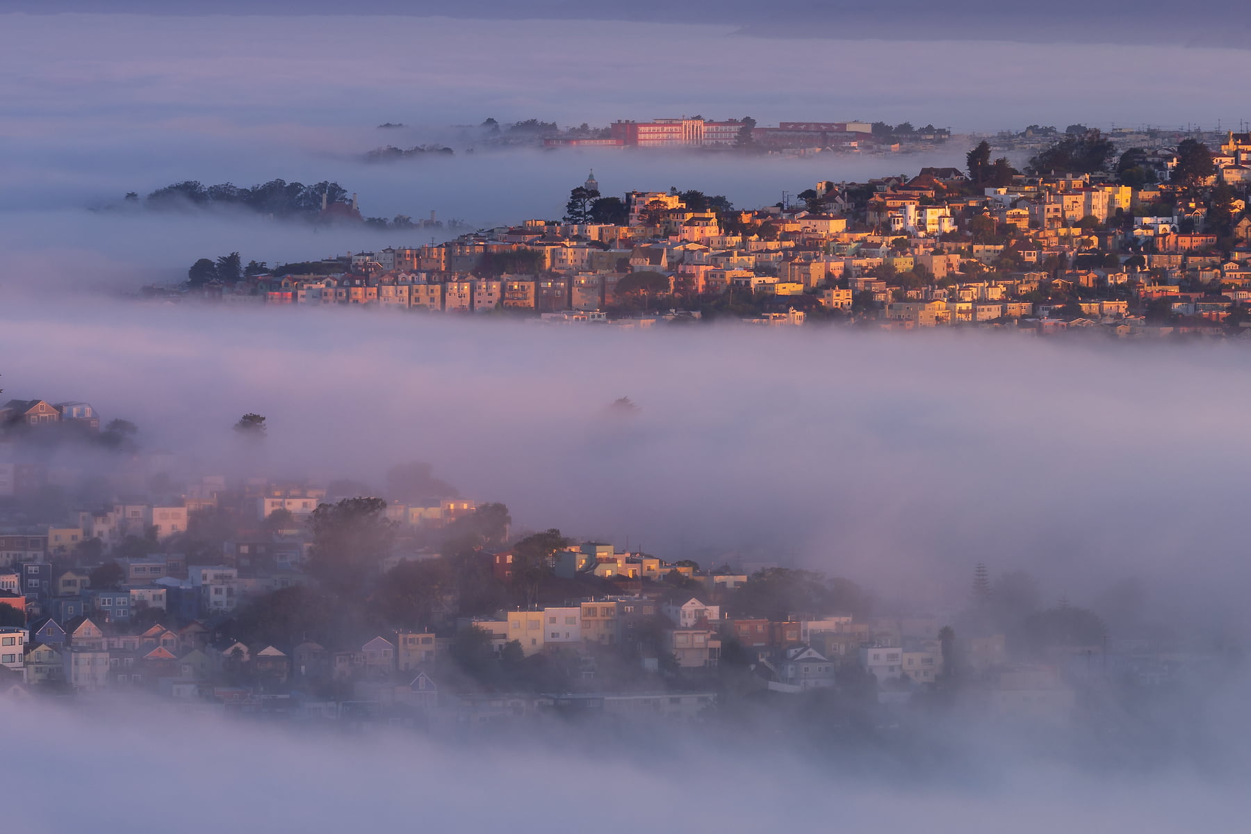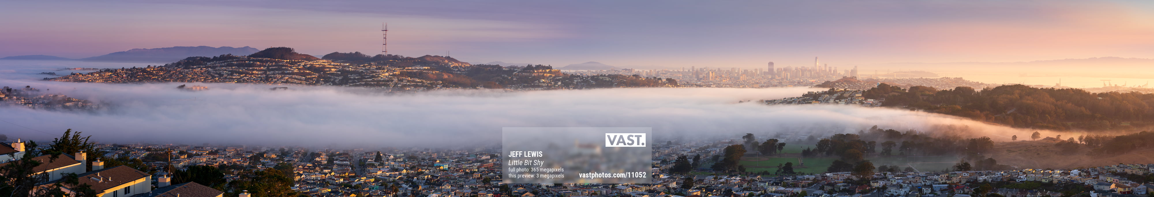 This VAST photo shows the San Francisco skyline, peeking out from behind its rolling hills and a blanket of fog, featuring neighborhoods that are rarely spotlighted in photos. As the sun rose, it bathed the scene in stunning golden light, which was the lighting I chose for this image. This scene is similar to my other VAST photo, "Karma" -- but this one showcases a wider view, focusing less on downtown SF and more on the various neighborhoods of the city, and the surrounding hills. It needs to be seen large, and up close!