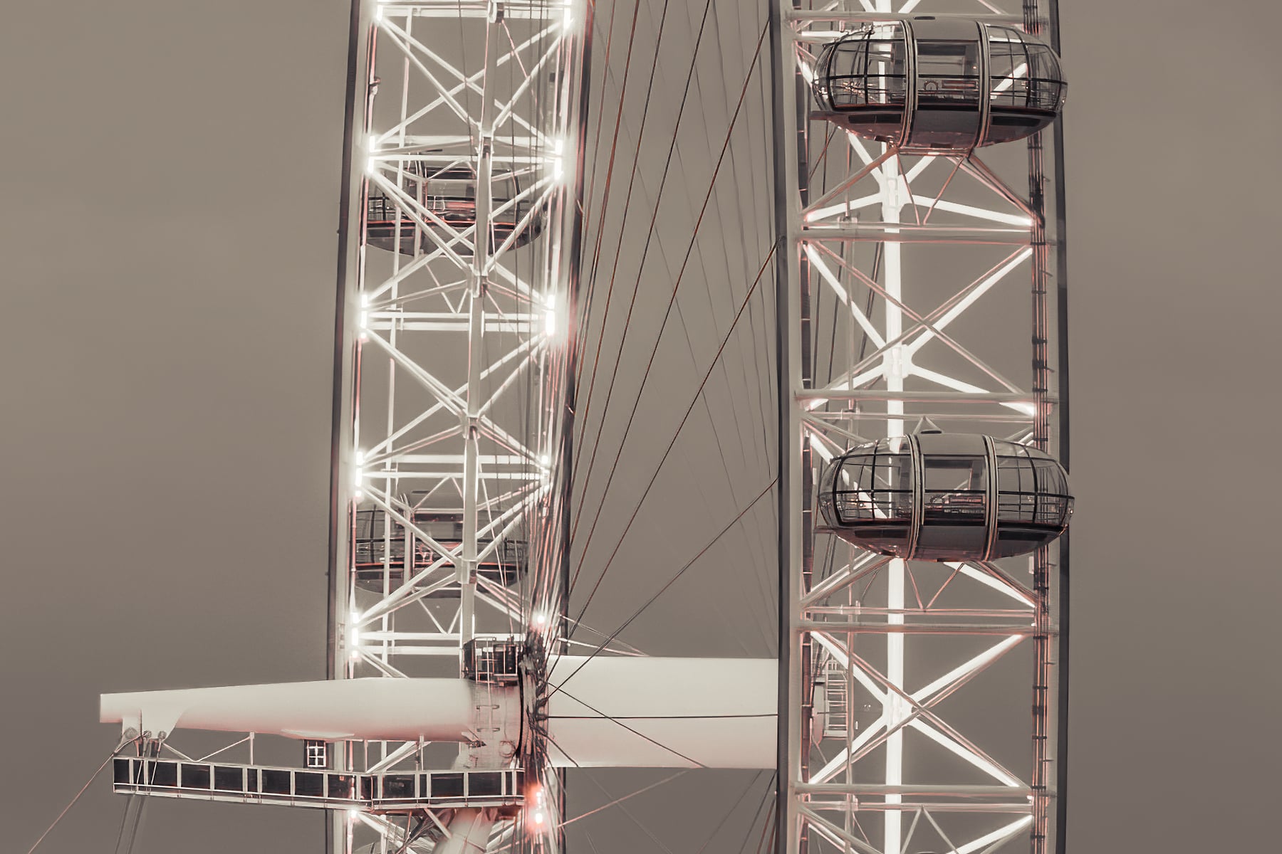 This evocative evening view of the London city skyline presents a mesmerising blend of modern vibrancy and historical grandeur. The image, captured with a nuanced sepia tone, bathes the iconic landmarks along the River Thames in a warm, nostalgic glow. The London Eye stands prominently on the left, its illuminated pods creating a striking contrast against the dusky sky. Hungerford Bridge, with its illuminated cables, stretches elegantly across the river, adding a dynamic architectural element to the scene.
