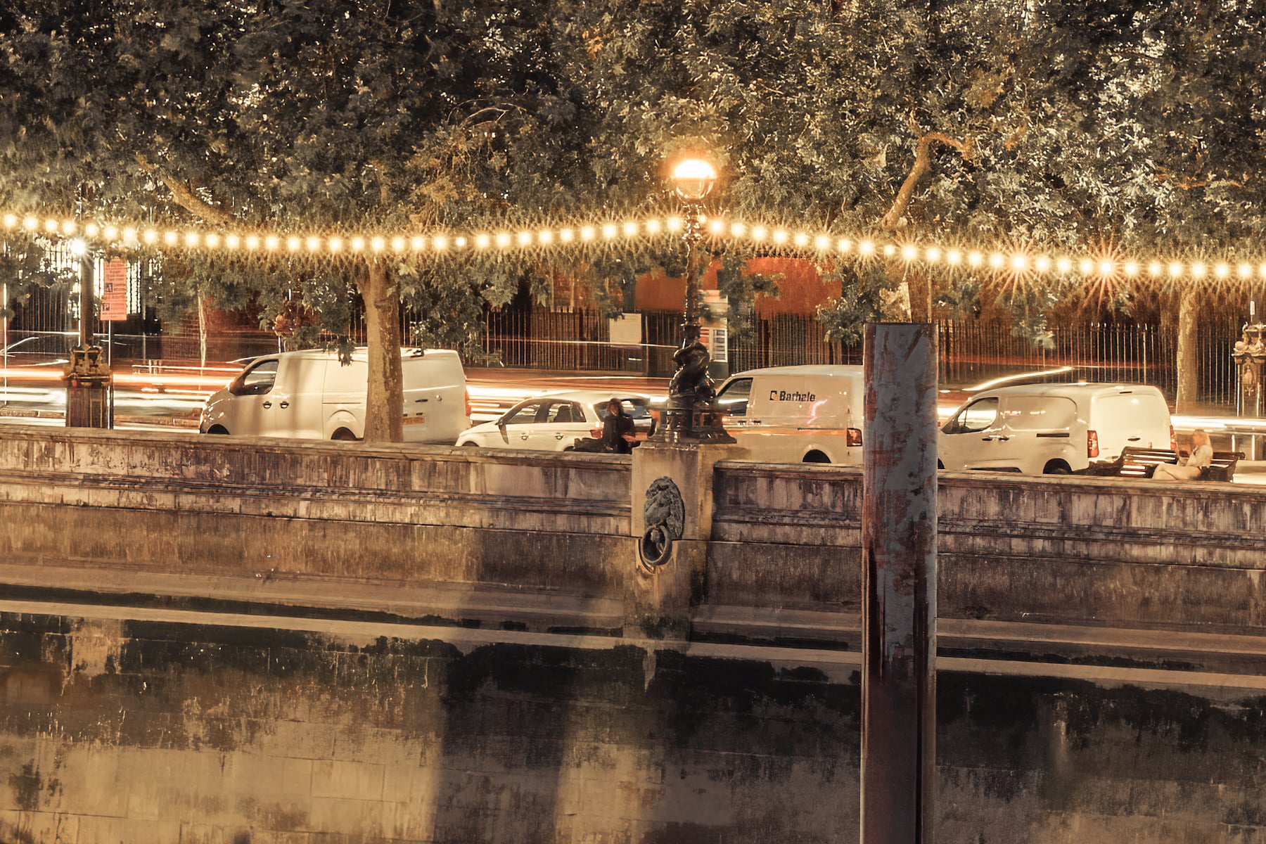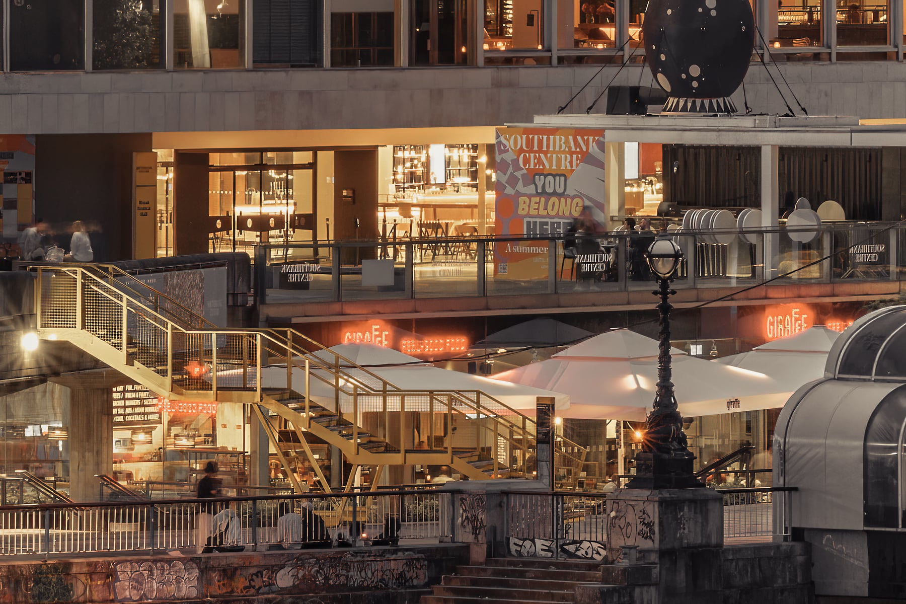 On the right, the South Bank comes alive with its cultural landmarks and vibrant nightlife, showcased through the glowing lights and subtle reflections. The overcast evening sky adds a dramatic backdrop, enhancing the sepia tones and providing depth to the panorama. This photograph beautifully encapsulates the essence of London, illustrating its rich history, architectural splendour, and the continuous pulse of urban life.