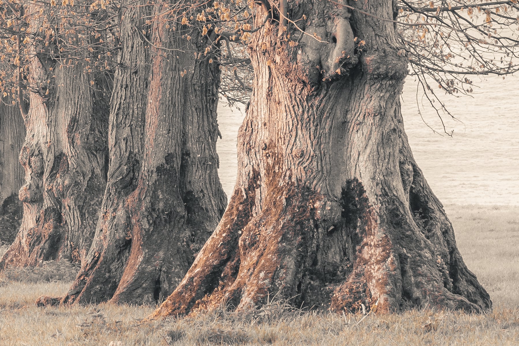 This enchanting sepia-toned image captures a majestic avenue of trees, leading the viewer's gaze down a serene, tree-lined pathway. The grand trees stand tall and proud, their trunks showing the marks of time with their textured bark and expansive roots gripping the earth firmly. The leaves, though sparse, add a delicate touch to the otherwise sturdy and imposing trunks. The sepia filter lends an old-world charm, evoking a sense of timelessness and nostalgia.