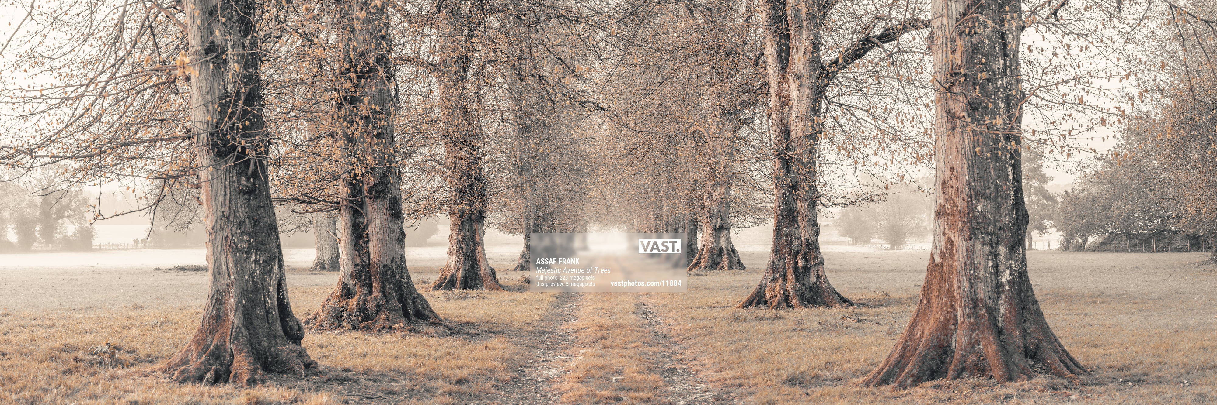 The pathway, slightly worn and covered in a thin layer of fallen leaves, invites one to walk down this natural corridor, perhaps leading to an unknown, mystical destination. The ground is a soft blend of earth and grass, while the mist in the background adds a layer of mystery and depth to the composition. The symmetrical alignment of the trees creates a sense of order and grandeur, emphasising the natural beauty and structure of this picturesque landscape.