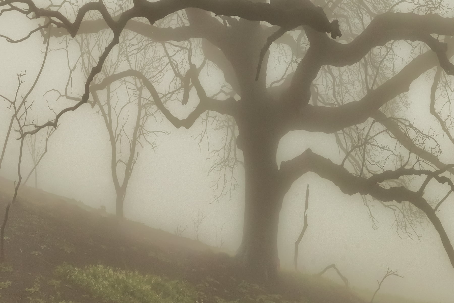 Only after the horrible events of the Malibu fires was I to witness the rebirth of the wild areas above the ocean in Malibu. Nature is strong. Nature prevails and this image is a homage to the beauty and life that lives within. Amongst the charred black trunks of burnt-out trees, little sprigs of green were starting to appear. The fog rolled in and made ominous, yet beautiful, shapes and cut distance - creating a world where only nature understands.