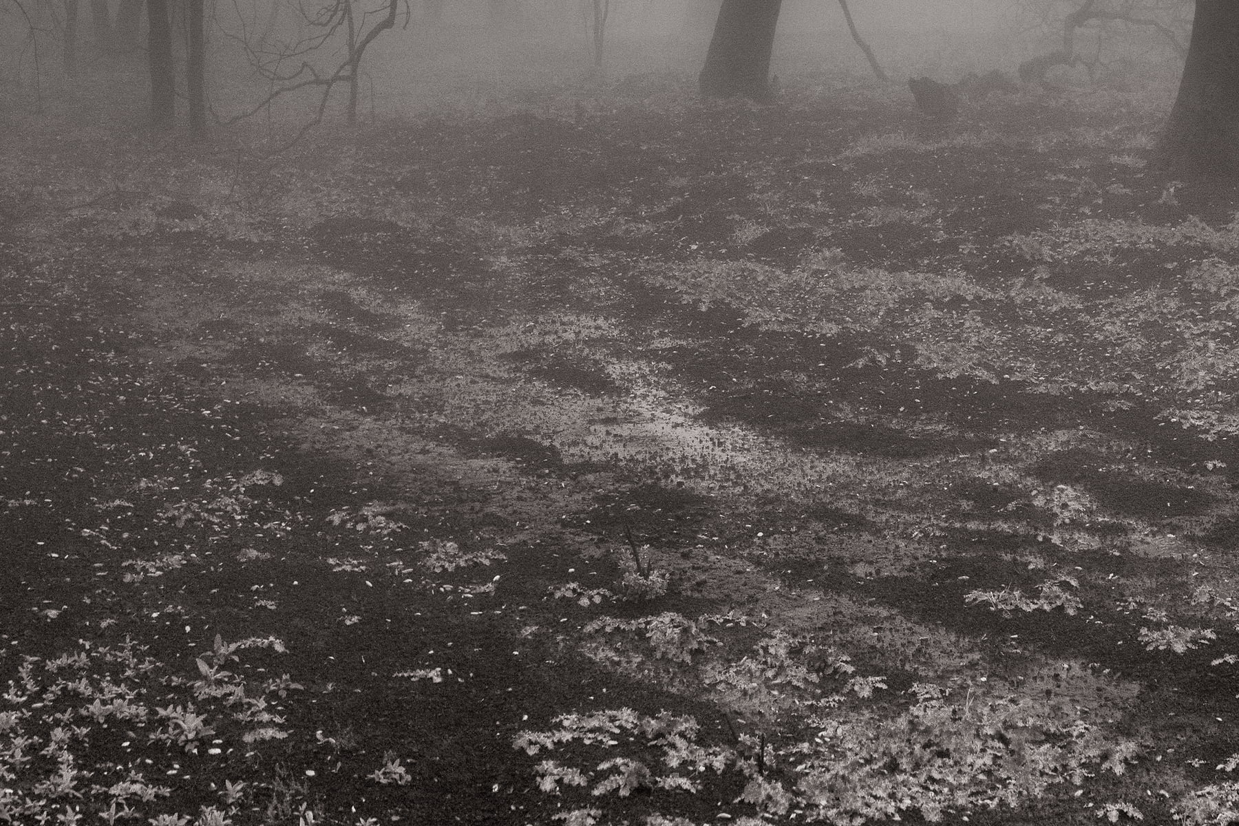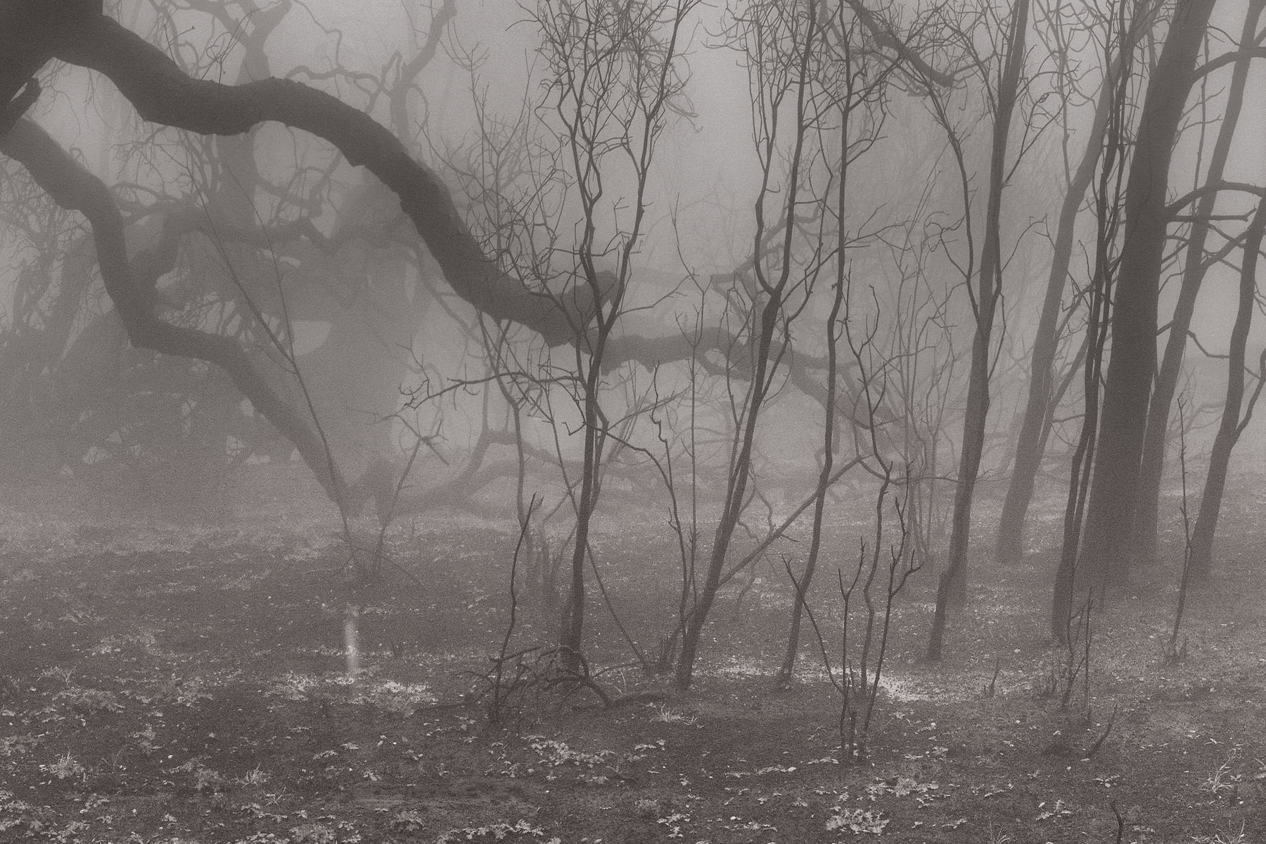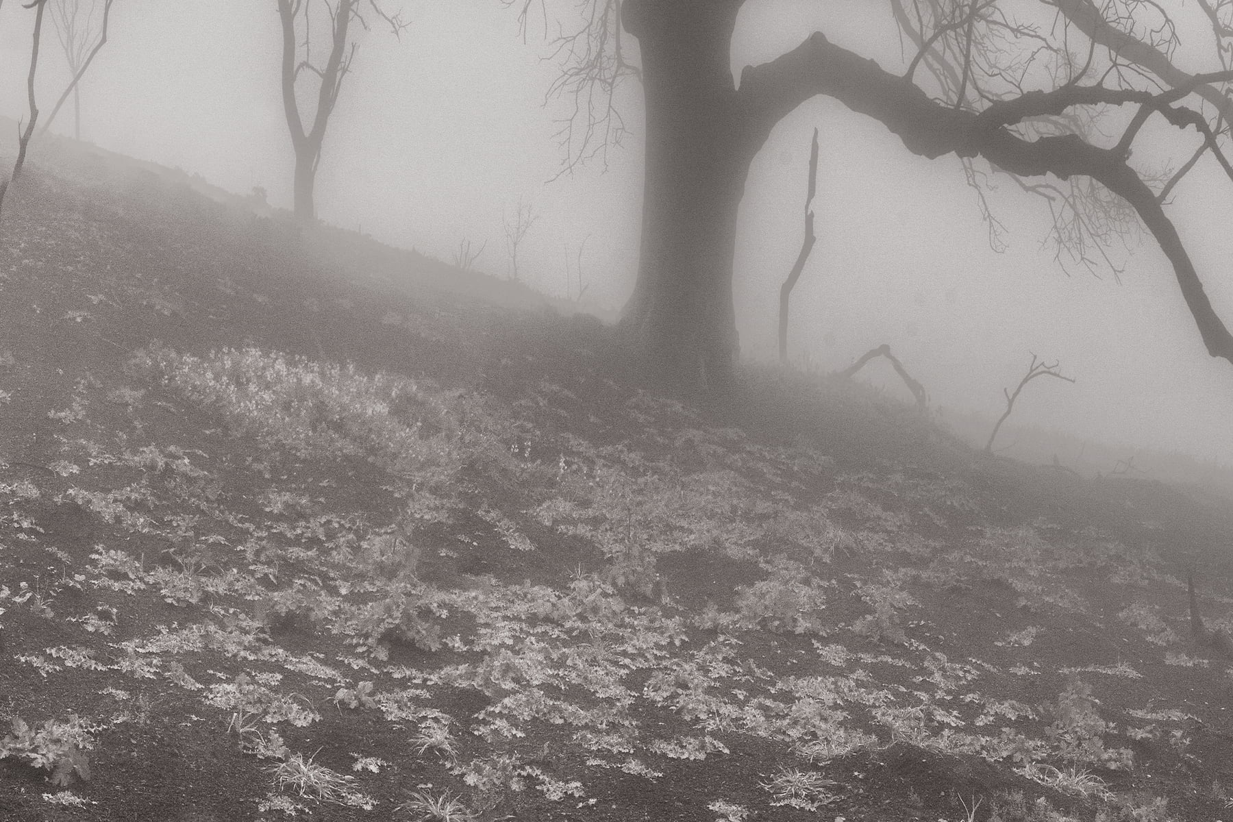 Only after the horrible events of the Malibu fires was I to witness the rebirth of the wild areas above the ocean in Malibu. Nature is strong. Nature prevails and this image is a homage to the beauty and life that lives within. Amongst the charred black trunks of burnt-out trees, little sprigs of green were starting to appear. The fog rolled in and made ominous, yet beautiful, shapes and cut distance - creating a world where only nature understands.