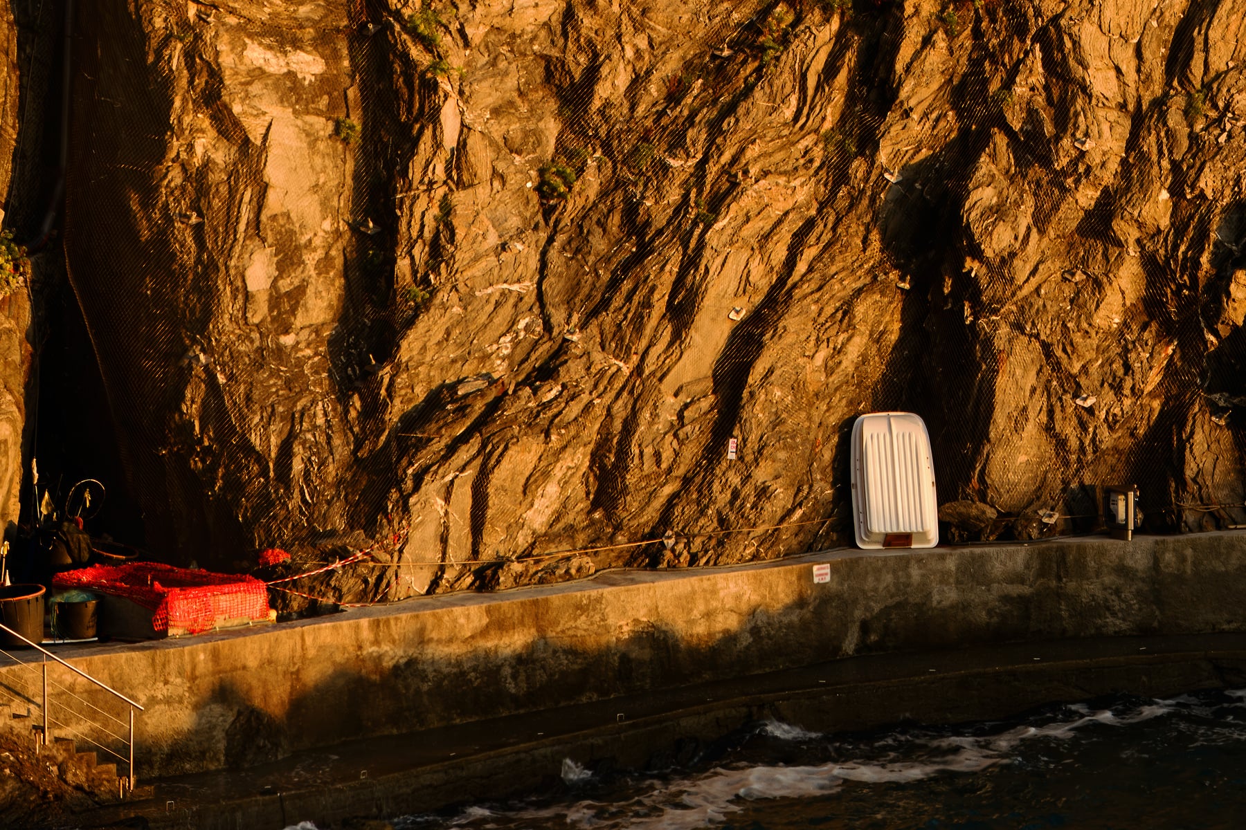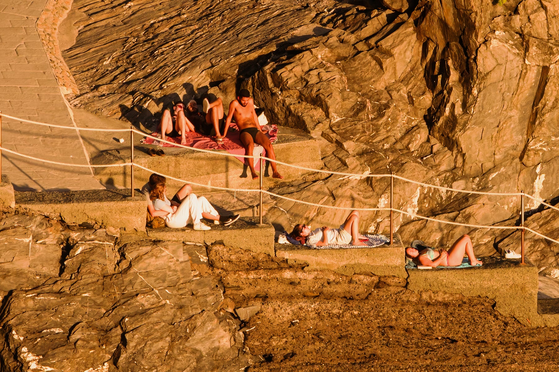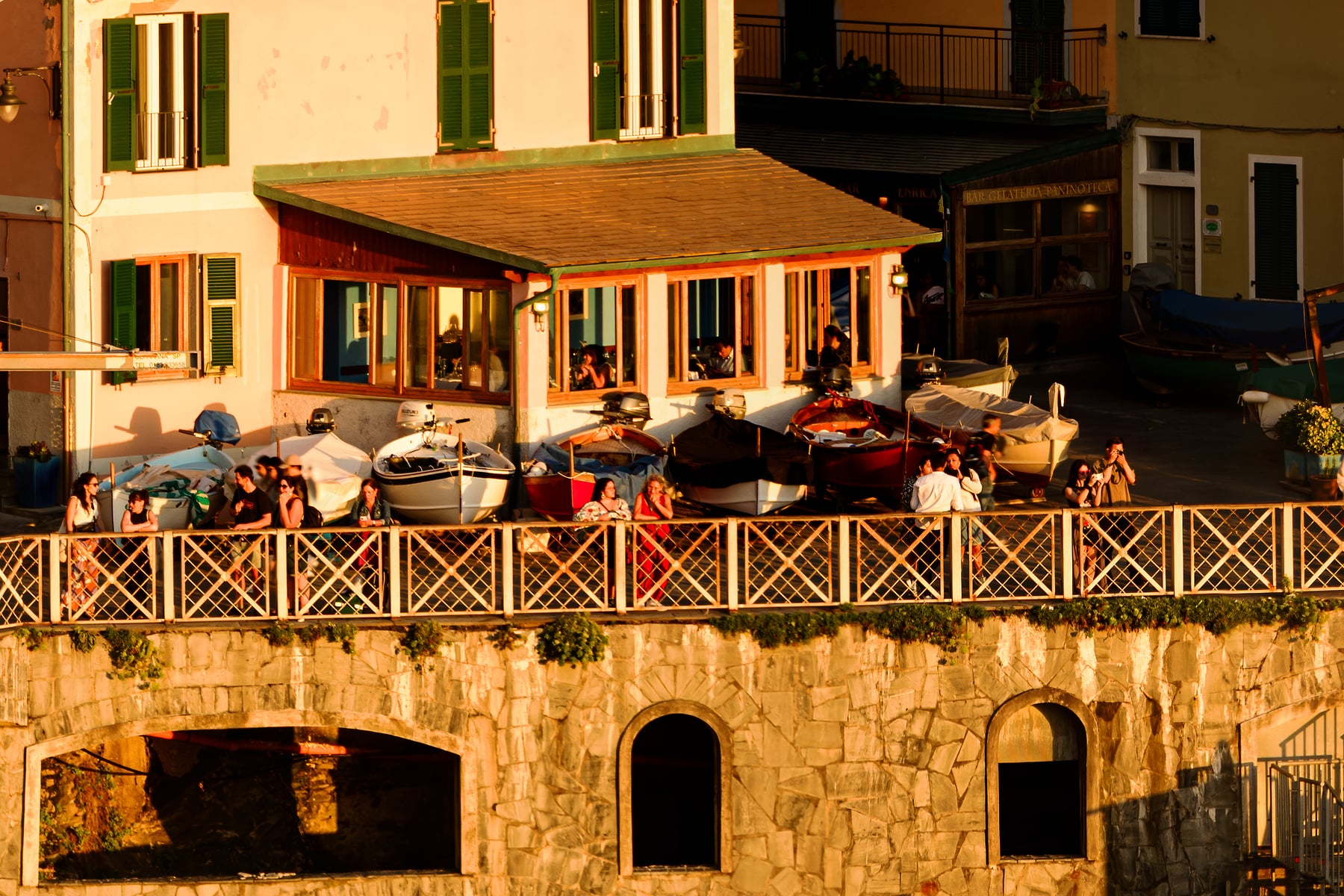 It was my quest to not only create an ultra-high-resolution image from that viewpoint but to do so while Manarola was bathed in golden light. I planned a three-day stay to try and pull off the shot. On the first evening, the view was wonderful and I did photograph it but there was no special light. Nice but not good enough. I would have to try again. As with the day before, I spent the next morning through mid-afternoon being a tourist and exploring the other Cinque Terre town. Around 4 pm I returned to Manarola, gathered my special VAST gear, and headed to the viewpoint. The spot that I wanted to photograph from was very close to the Nessun Dorma restaurant entrance. I knew there would be lots of people lining up, taking selfies, and generally milling around. As I needed to take hundreds of photos from a static location, I decided to place my tripod somewhat precariously on the other side of the safety fence. From there I could reach the camera controls and rotate the camera but without any risk of a tripod leg being kicked by a passerby or being jarred when someone leaned on the fence for their next selfie pose (which happened a lot!). As the late afternoon dragged on, there was cloud cover to the west but there was a glimmer of hope. Far off to the West, there was a sliver of clear sky above the sea. If Manarola was to be bathed in golden light, it was going to come late and it would not last long. I prepared myself for the opportunity. Just before sunset, the miracle happened. As the sun dipped closer and closer to the western horizon, it slipped below the clouds and Manarola lit up with wonderful warm golden light. I worked as fast as I could to capture all the photos necessary to assemble this ultra-high-resolution photograph. And if you zoom in, you can see just how special this sunset was. Endless people were looking out to sea and enjoying the view, taking a photos, or enjoying a cold drink as they watched the day coming to an end.