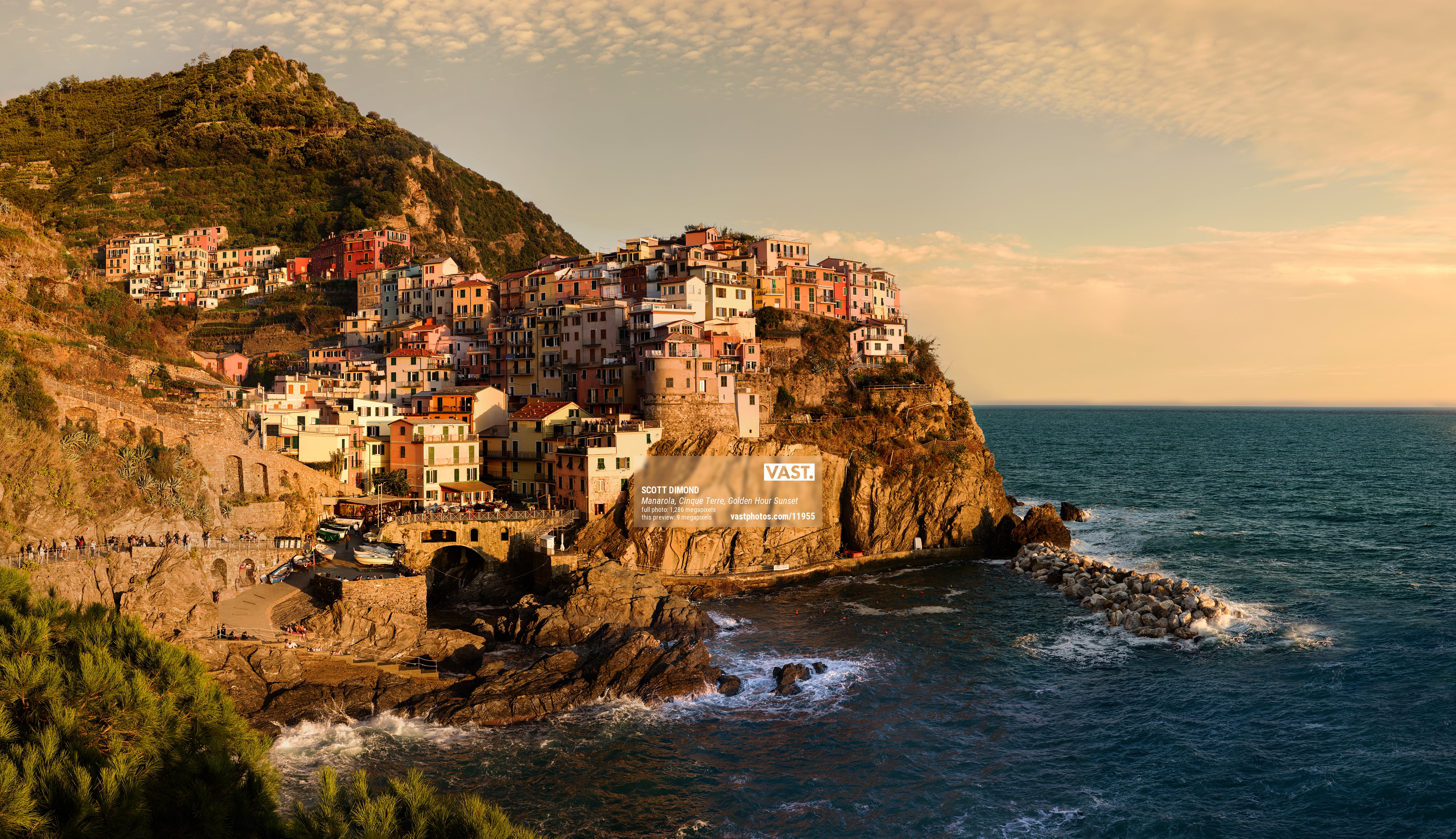 Creating an ultra-high-resolution VAST photo of Manarola has been on my wish list for a long time. You could even say it was a bucket list item. Of the five towns that make up Cinque Terre, it has always been Manarola that I long to photograph. Yes, the others are nice, but the coastline extending out into the sea to the north of town is what makes Manarola so special. From that point is a wonderful view back toward the village; a spectacular display of multicolored houses stacked on one another up the cliffs. Whether standing along the pathway taking in the view or enjoying an Aperol spritz in a coveted seat at the wonderful Nessun Dorma restaurant, this is the place to be. And the Holy Grail experience is to be there during a sunlit golden hour light show.