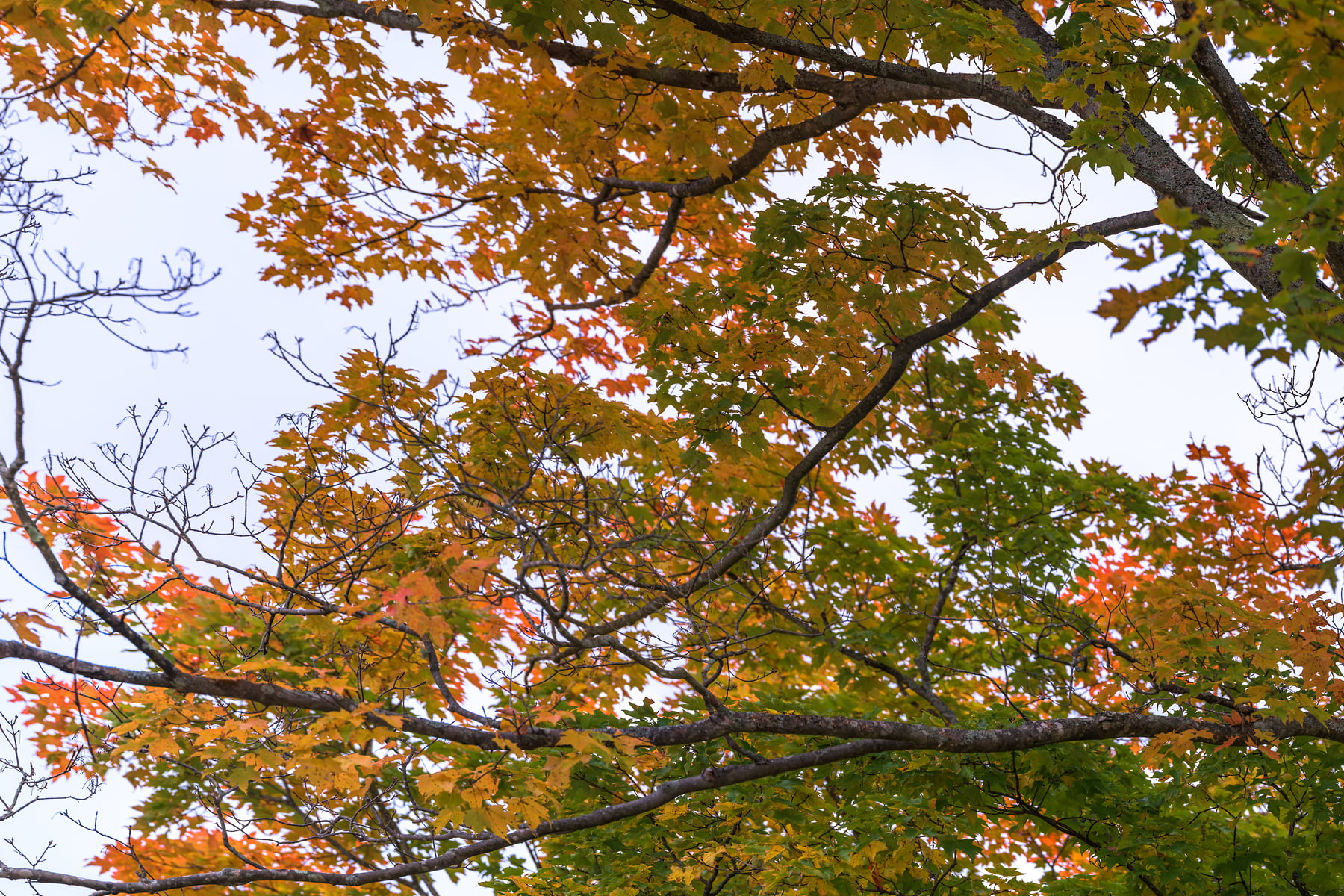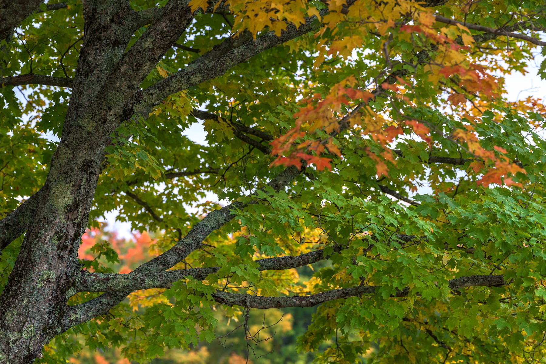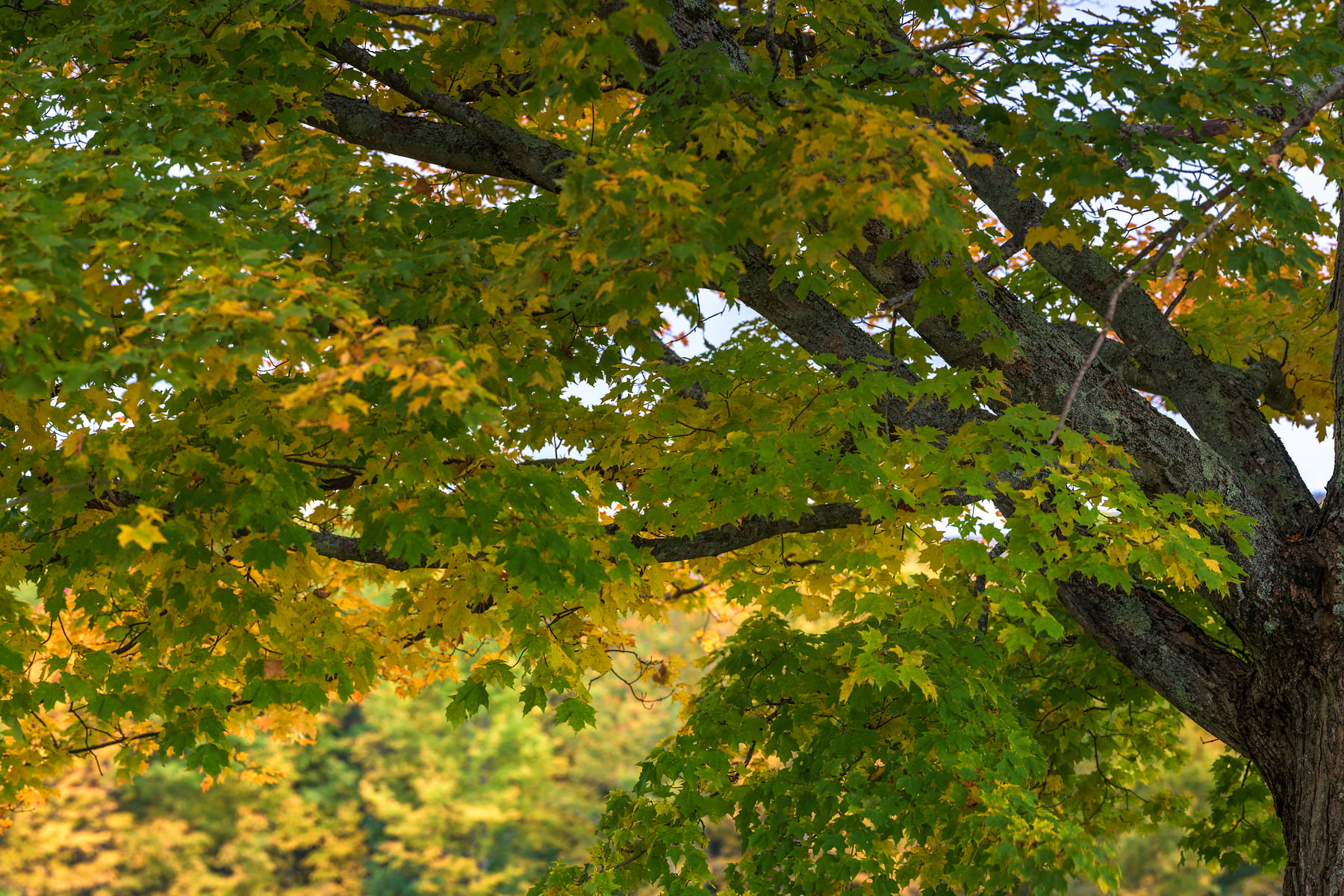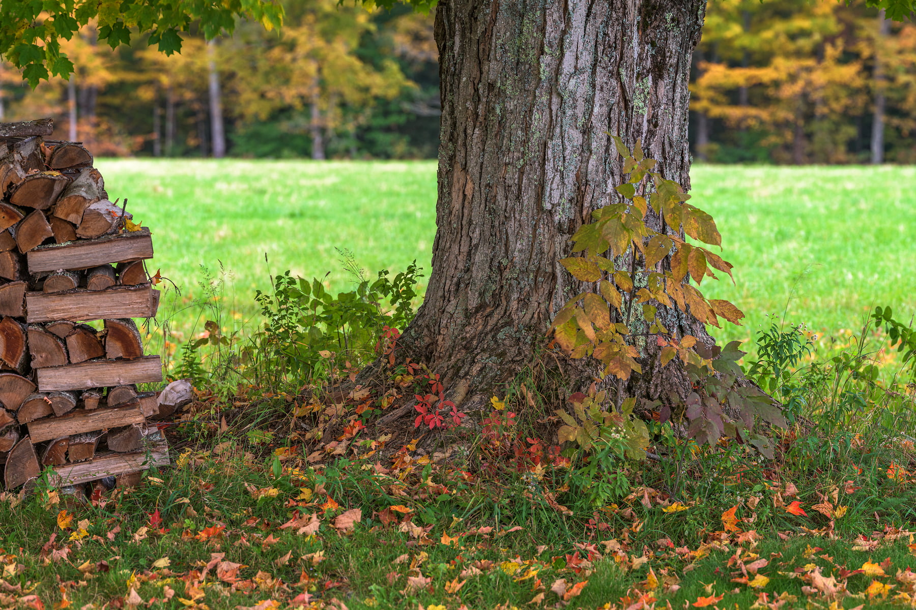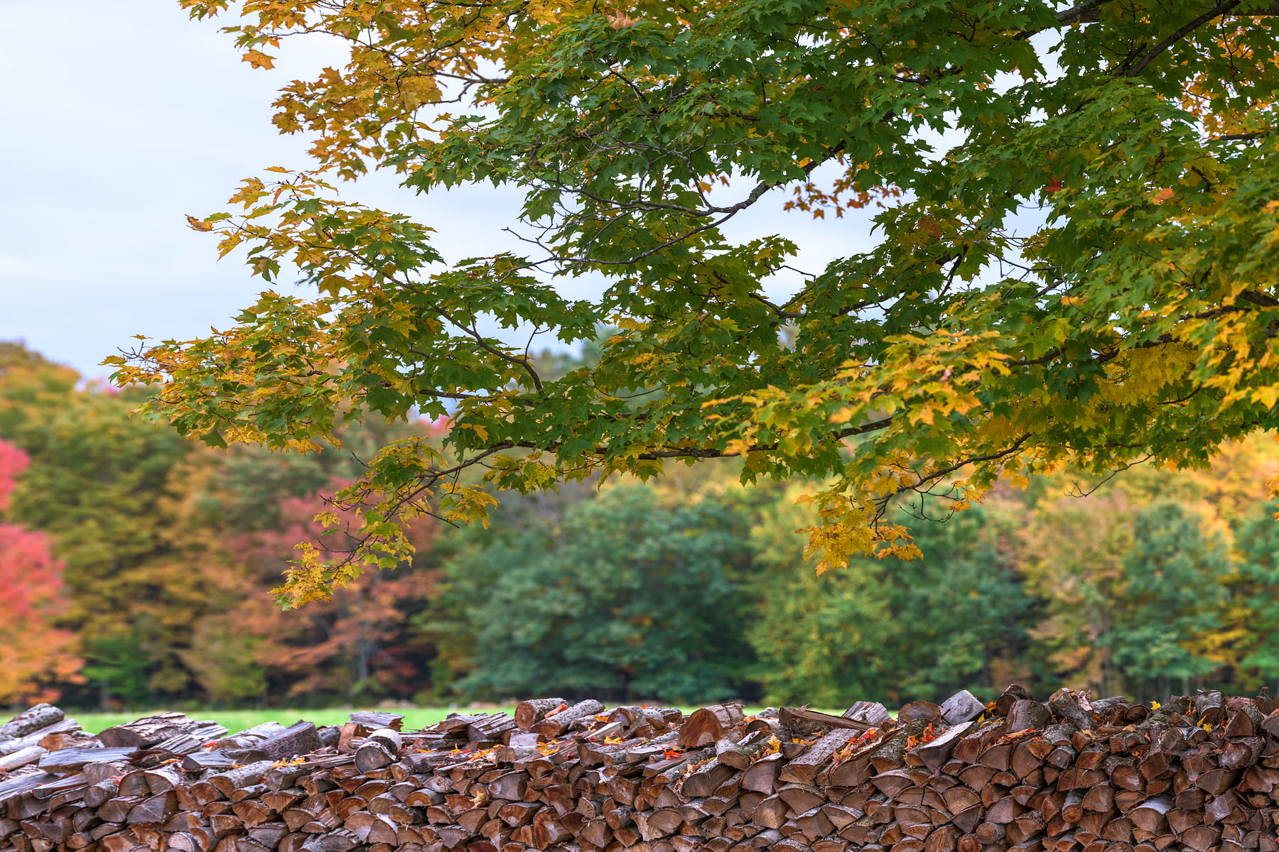 This large maple tree stands tall between rows of woodpiles at Muster Field Farm in Sutton, New Hampshire, October 10, 2021, 18:16 – 18:26.