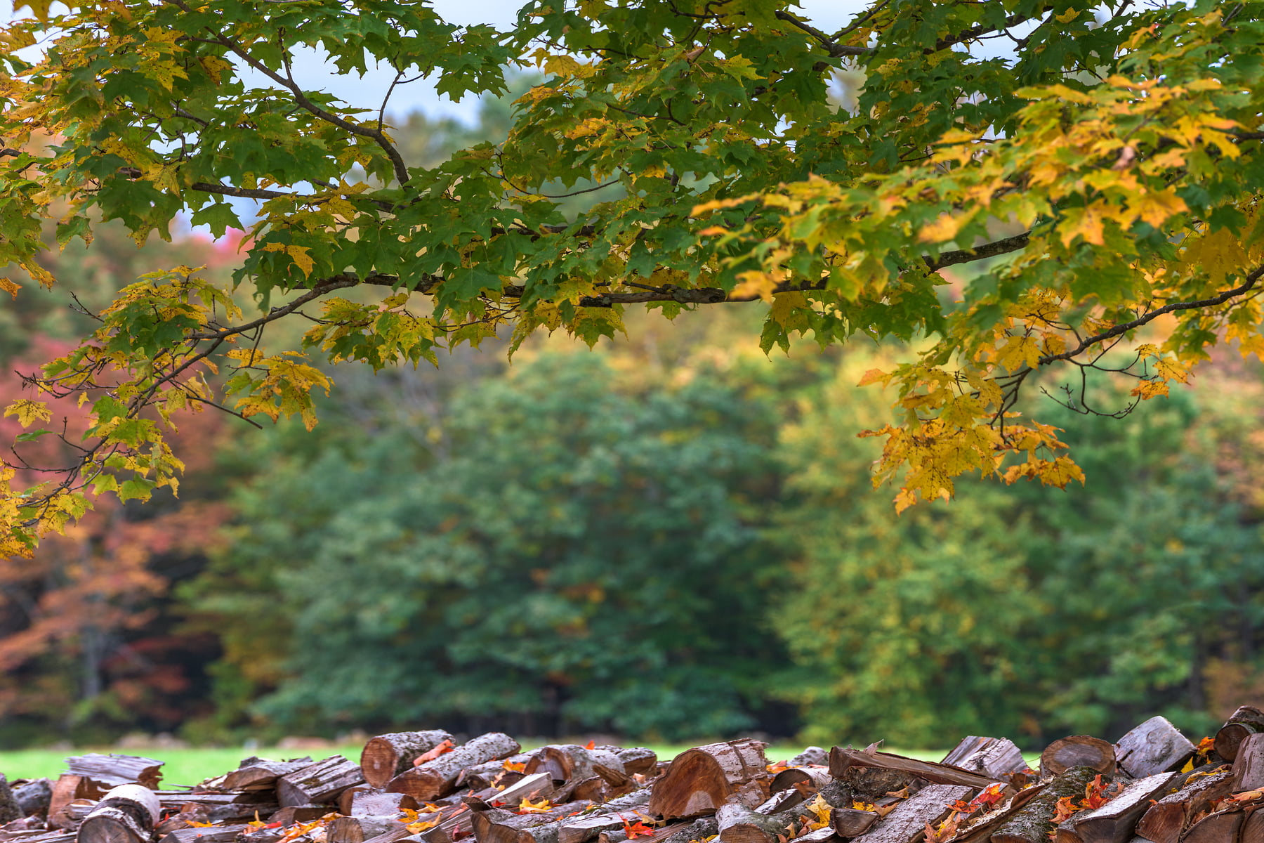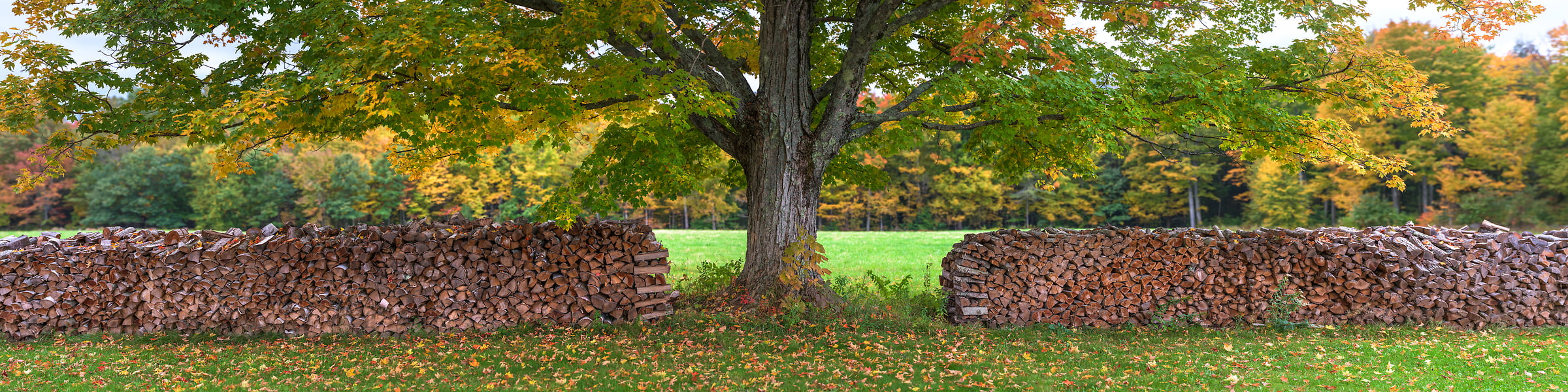 This large maple tree stands tall between rows of woodpiles at Muster Field Farm in Sutton, New Hampshire, October 10, 2021, 18:16 – 18:26.