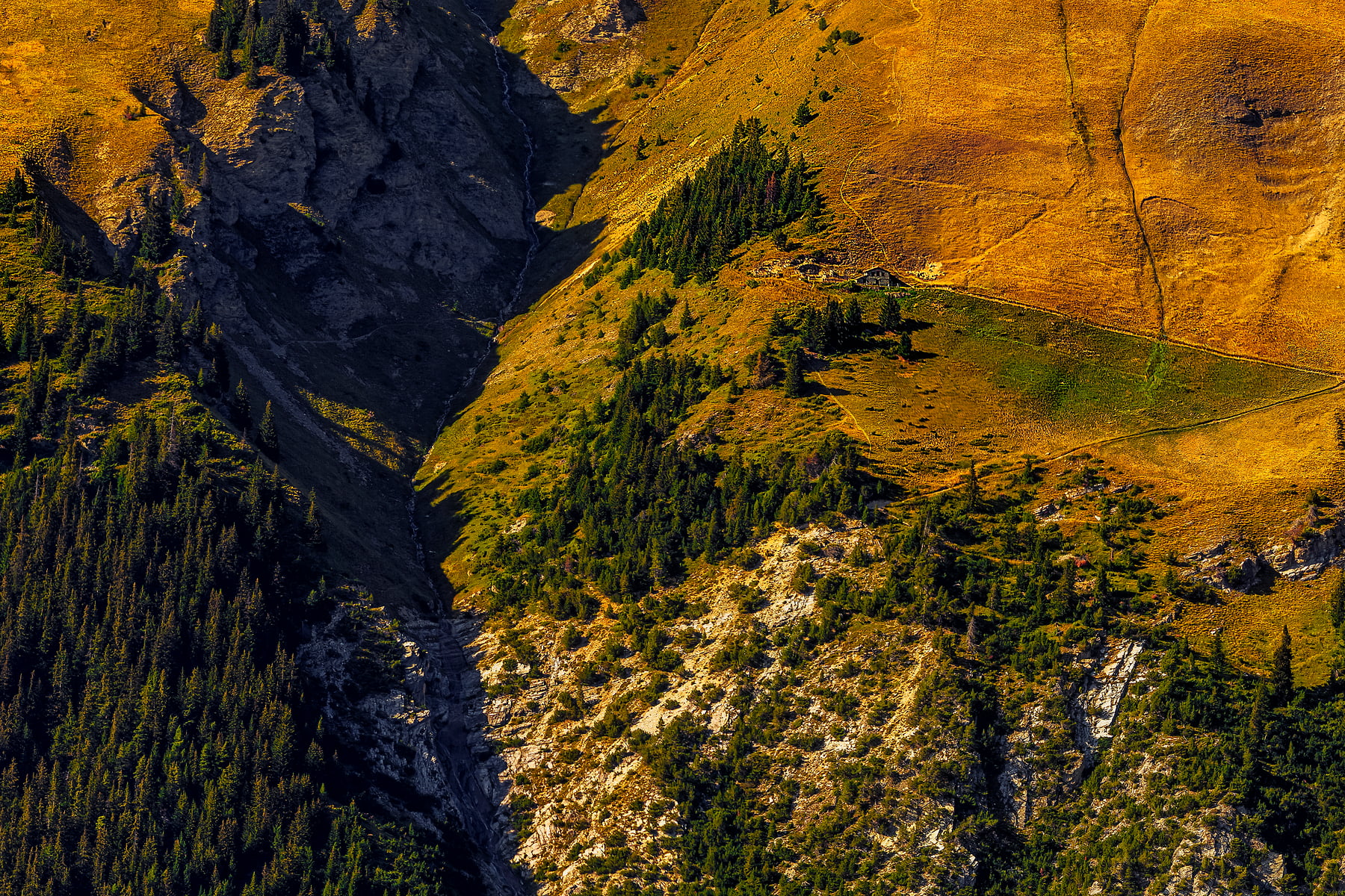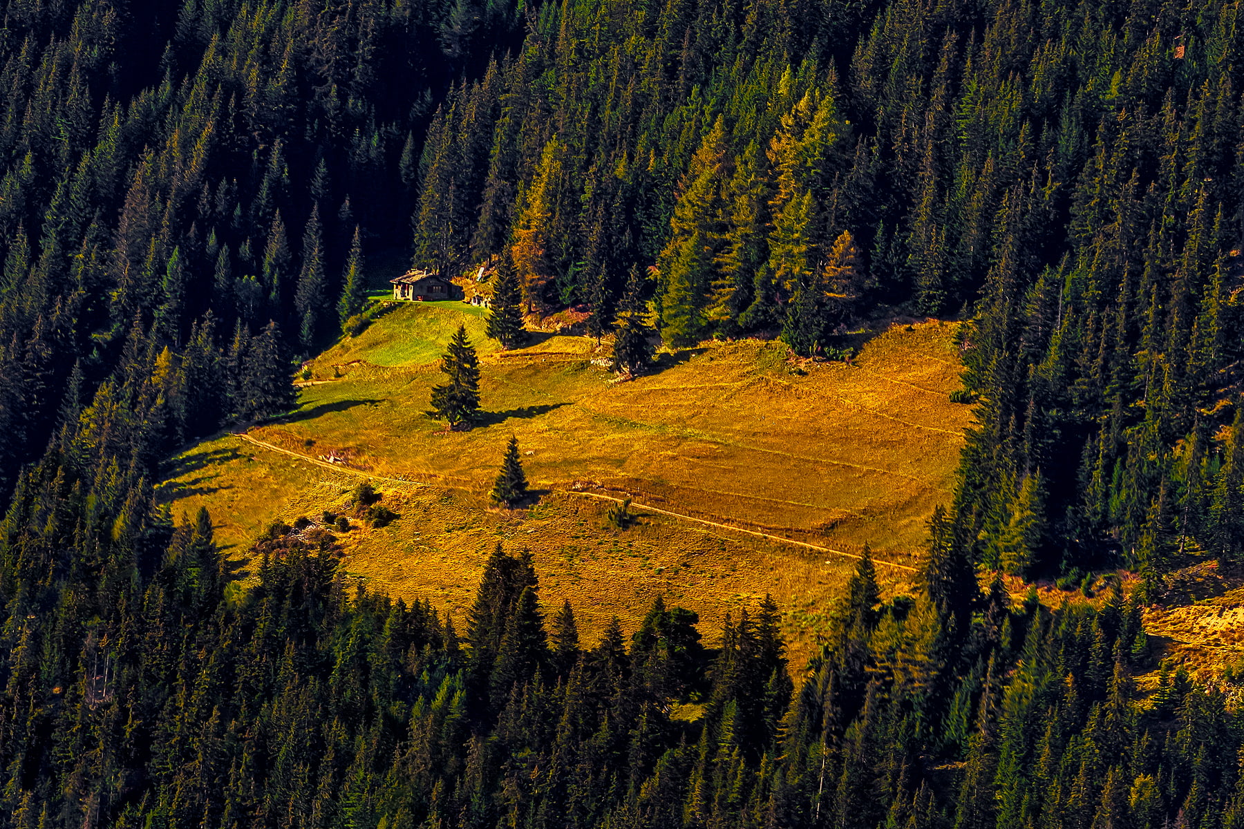 If you explore the photo, you will see how many rocky shapes can be seen, small canyons and gleaming limestone rocky views, waterfalls that jump tens of meters, streams that arise at high altitude and descend to the valley tracing endless paths. Larch and pine forests embellish the whole area, full of pastures and mountain pastures inhabited all summer (you can see in the photo some houses inhabited by the mountaineers who live up there with their cattle in the summer).