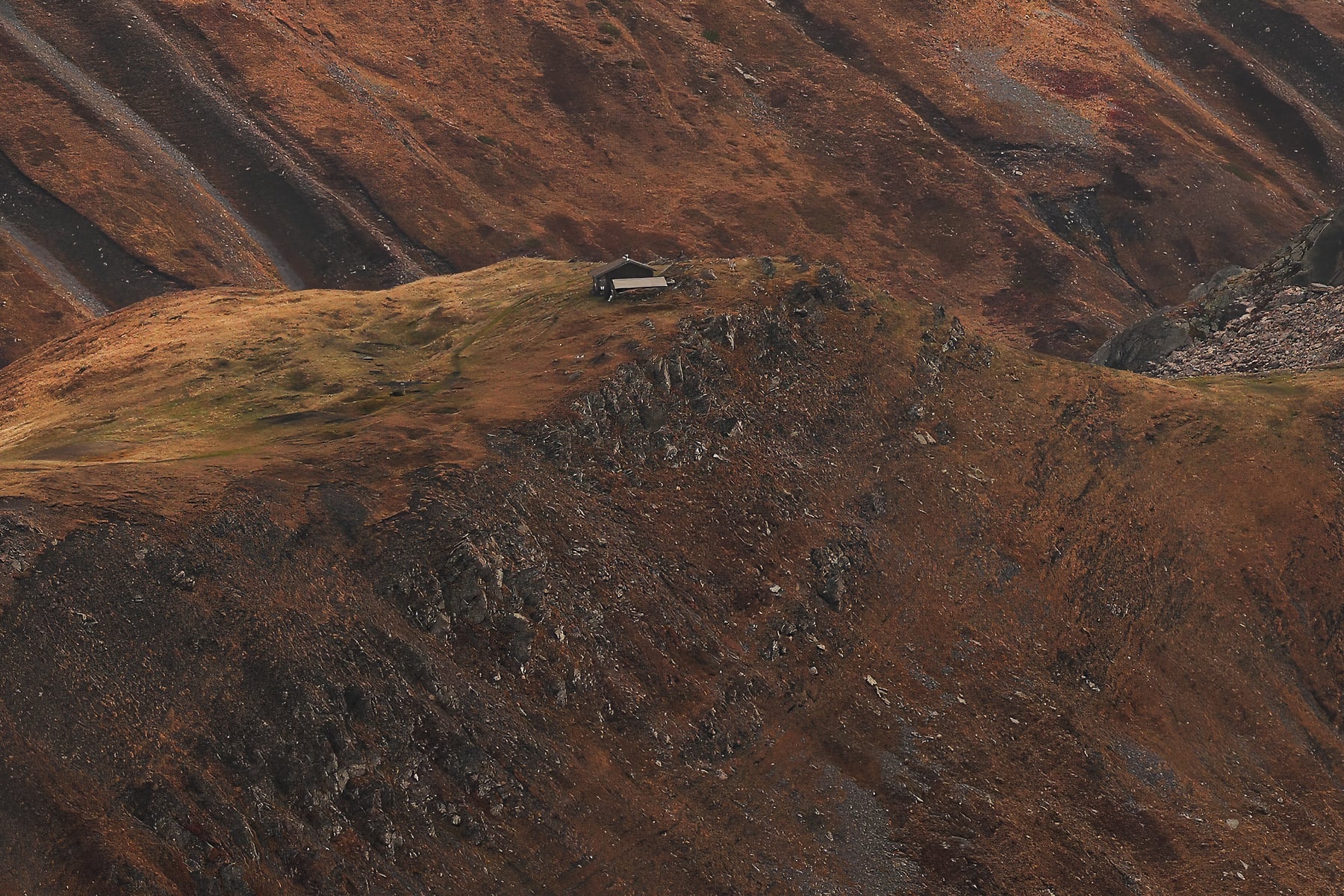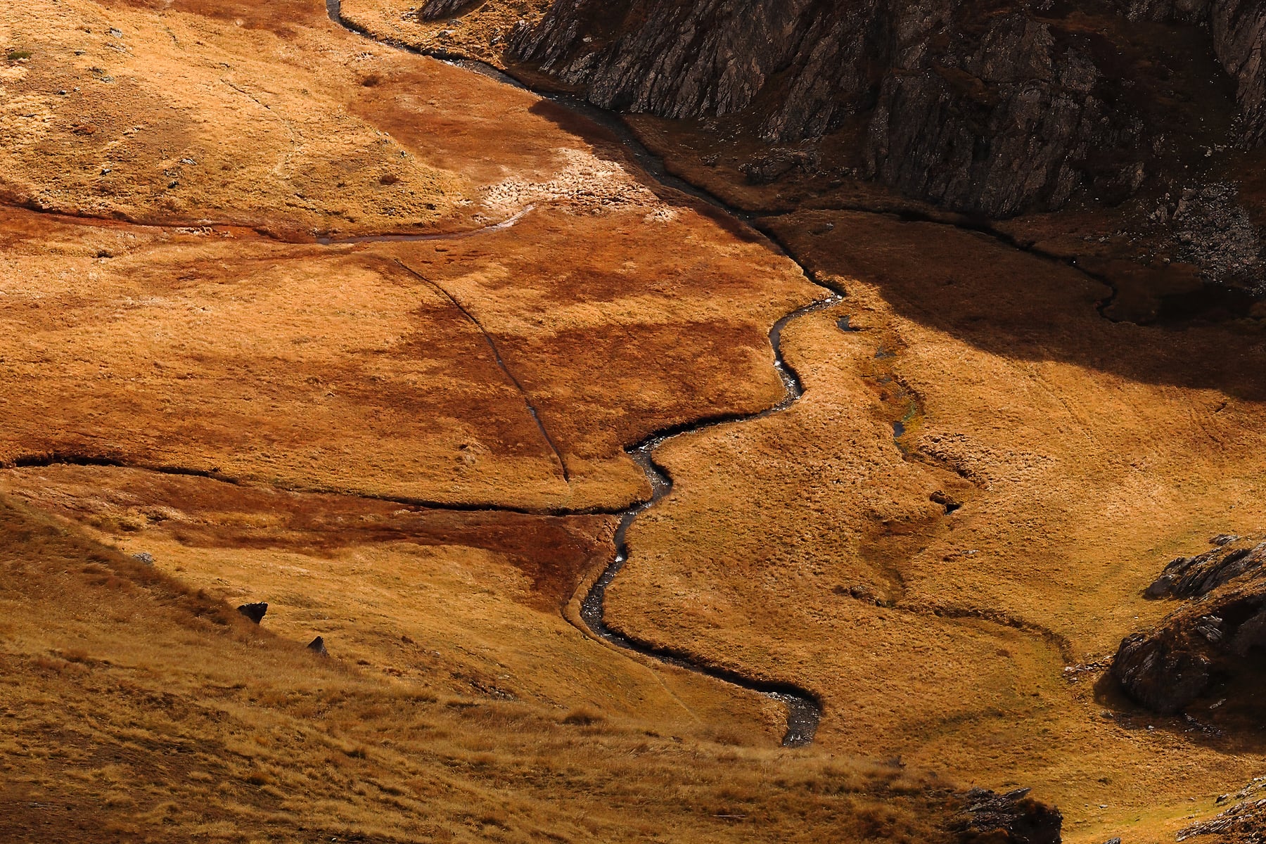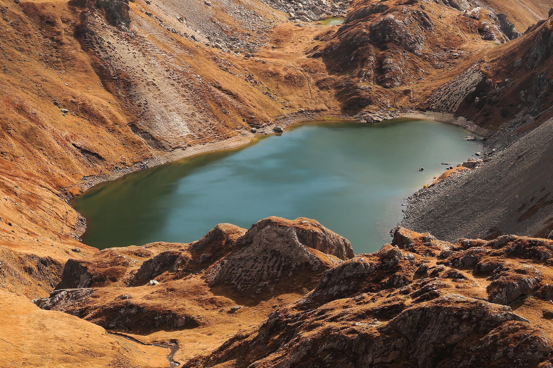 The lake, like a jewel set in the heart of this rugged terrain, reflects the light and adds a delicate balance to the overwhelming scale of the mountains. Shadows dance across the slopes, enhancing the depth and drama of this already spectacular setting.