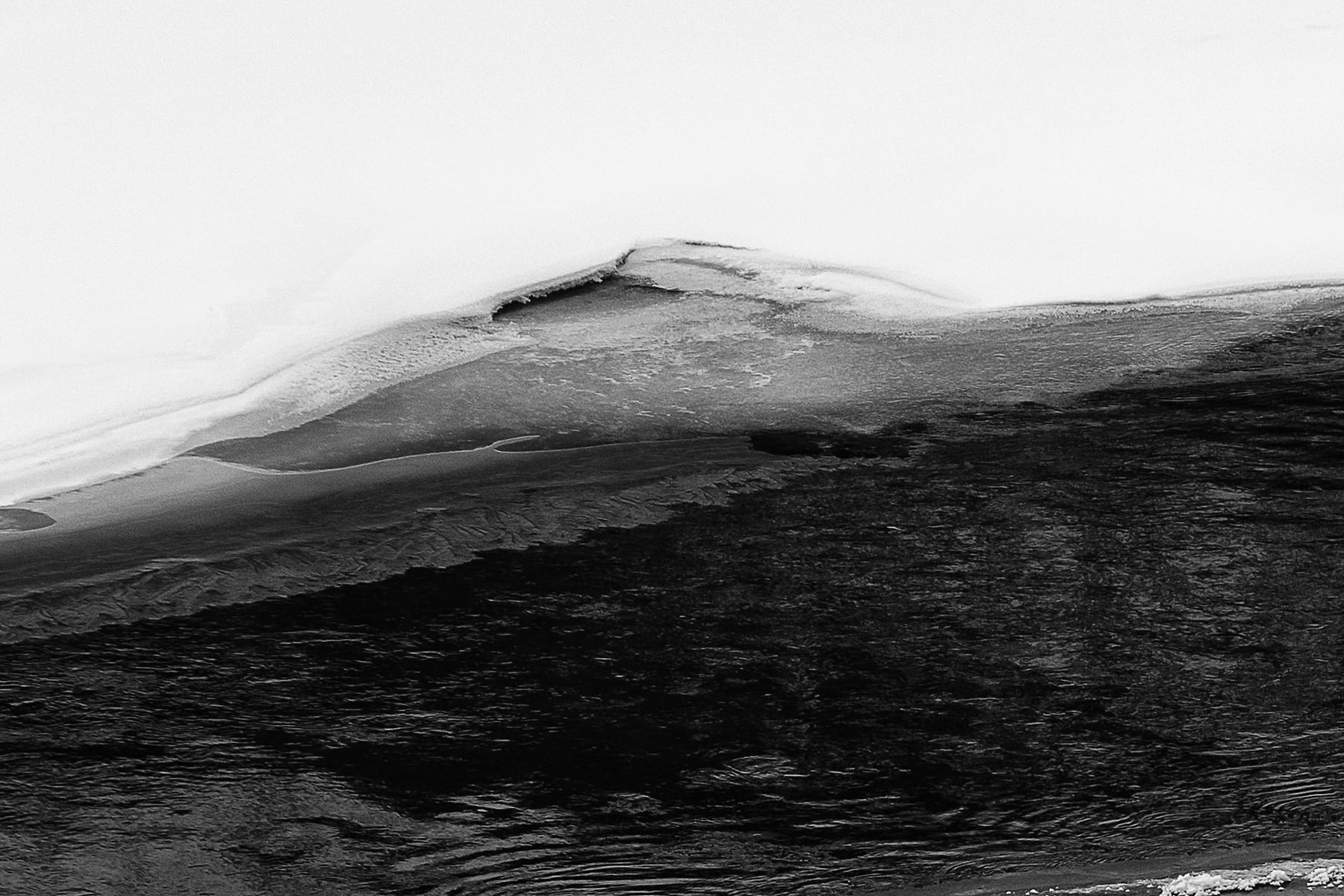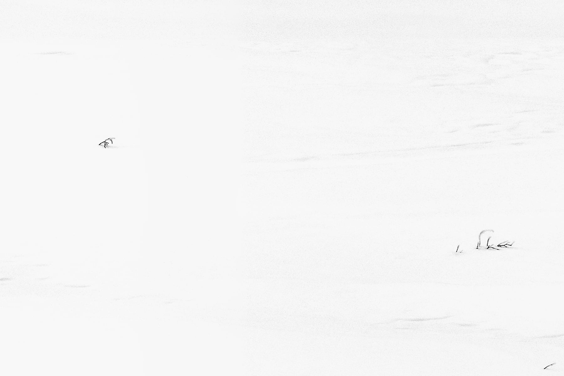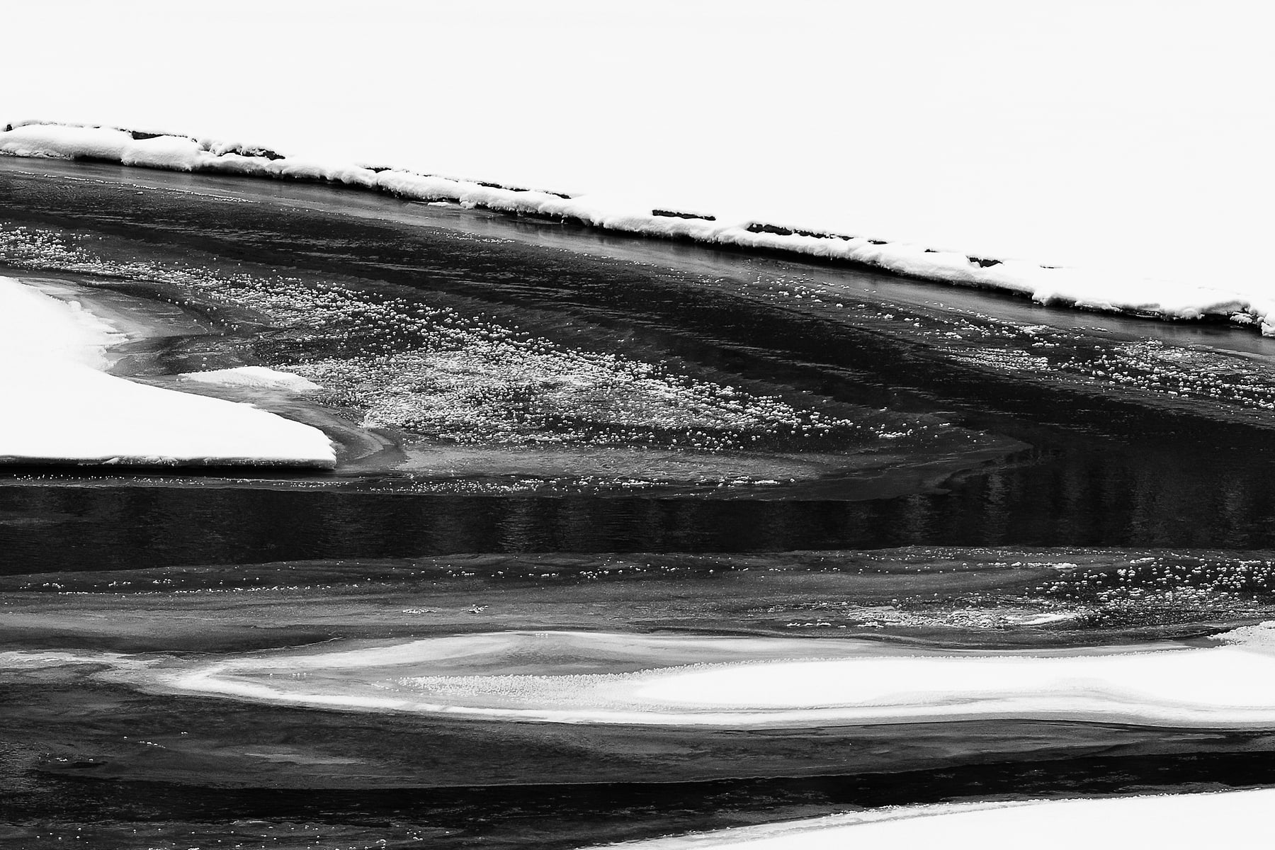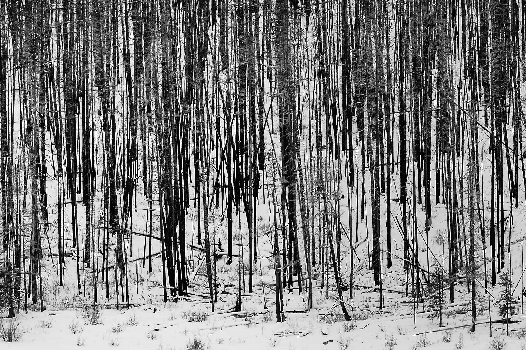 During the summer months when there is lots of meltwater trying to squeeze underground, the water backs up and creates what looks like a large lake. During the winter, Medicine Lake turns into a meandering collection of channels across the frozen expanse. Combined with the remnants of a July 2015 forest fire, the resultant winter view across the “lake” takes on a sense of surrealism with its combination of white snow, dark water, and blackened trees.