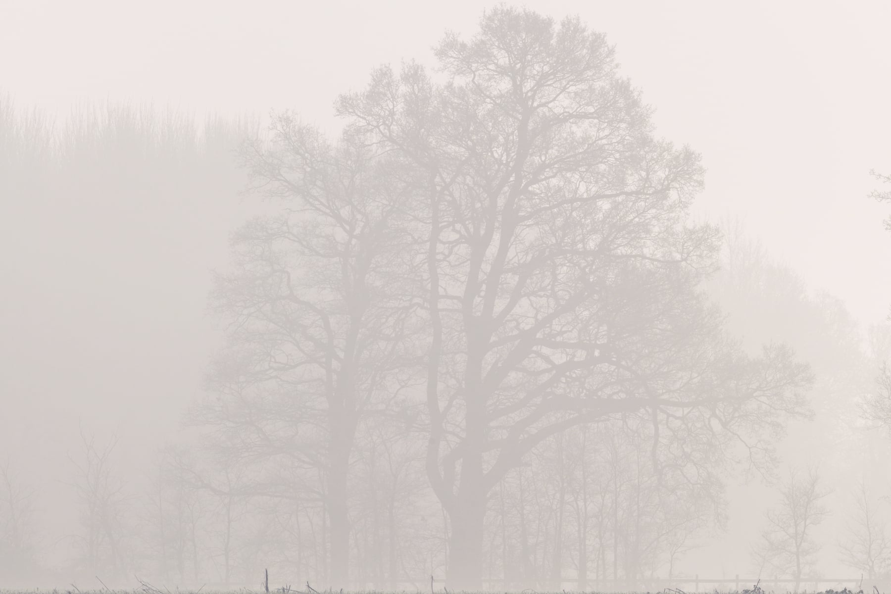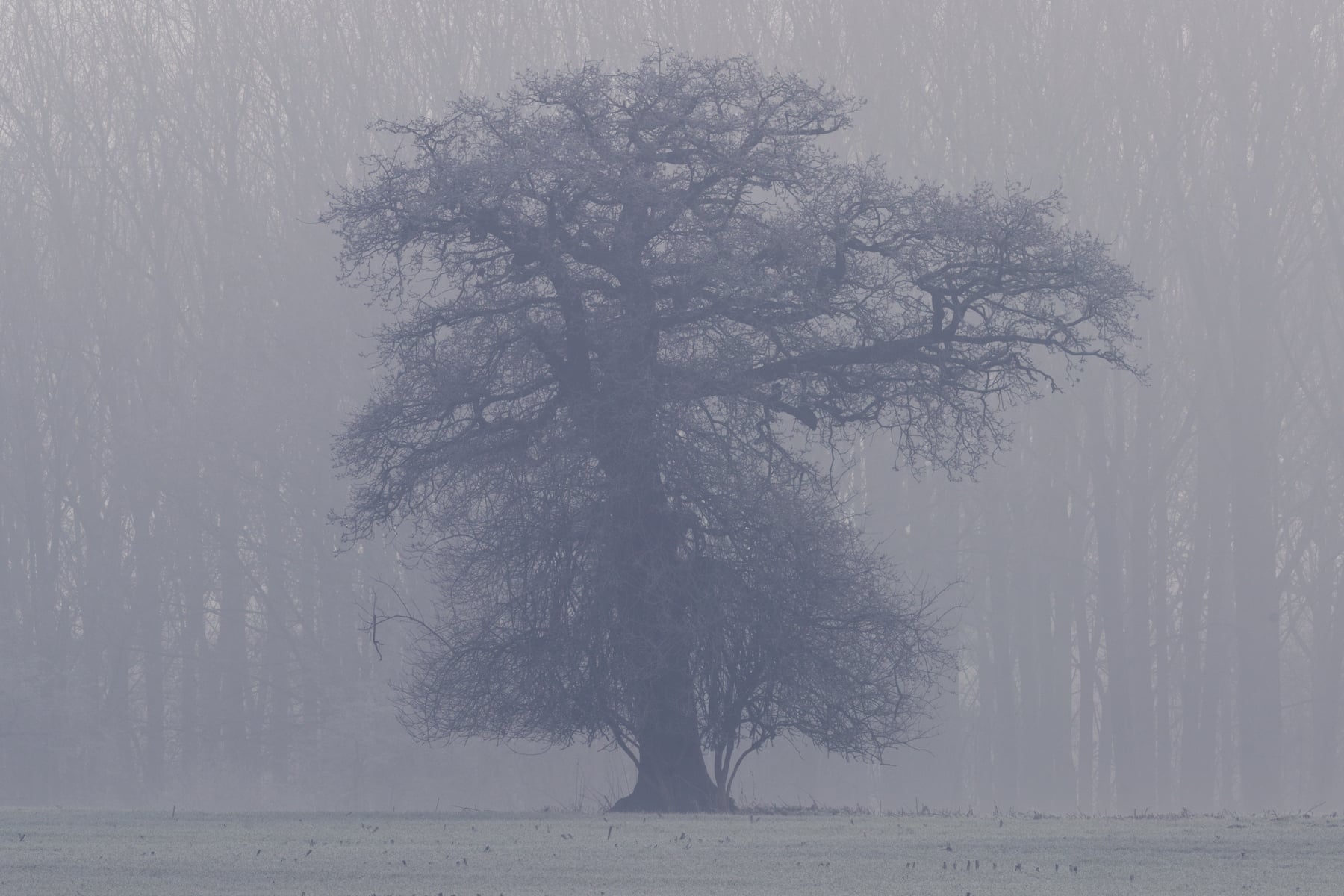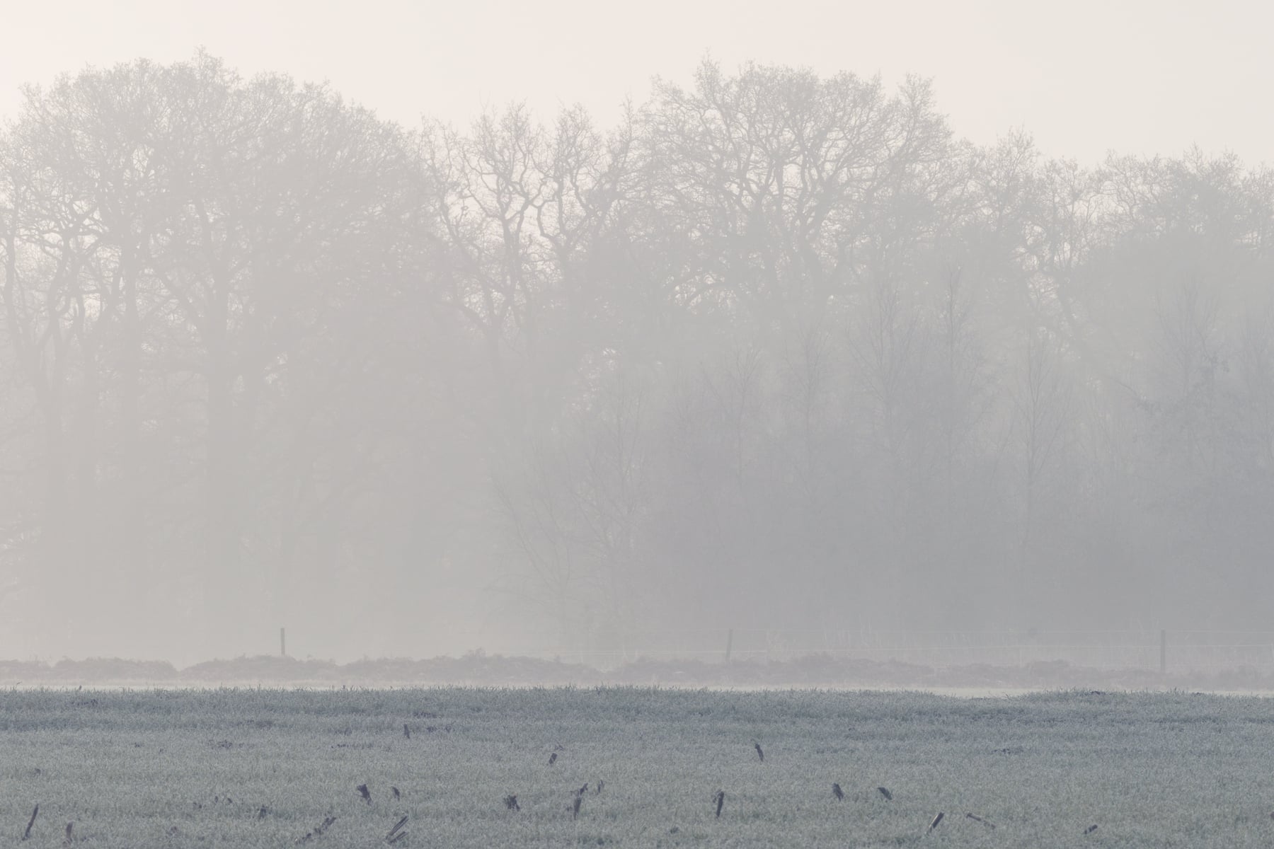 The open field in the foreground, covered with a thin layer of frost, adds to the sense of quiet stillness and tranquillity. The subtle gradation of light and shadow emphasises the depth and layers of the landscape, leading the viewer's eye deeper into the mist-shrouded forest. The distant trees fade gently into the fog, enhancing the composition's sense of mystery and timelessness.