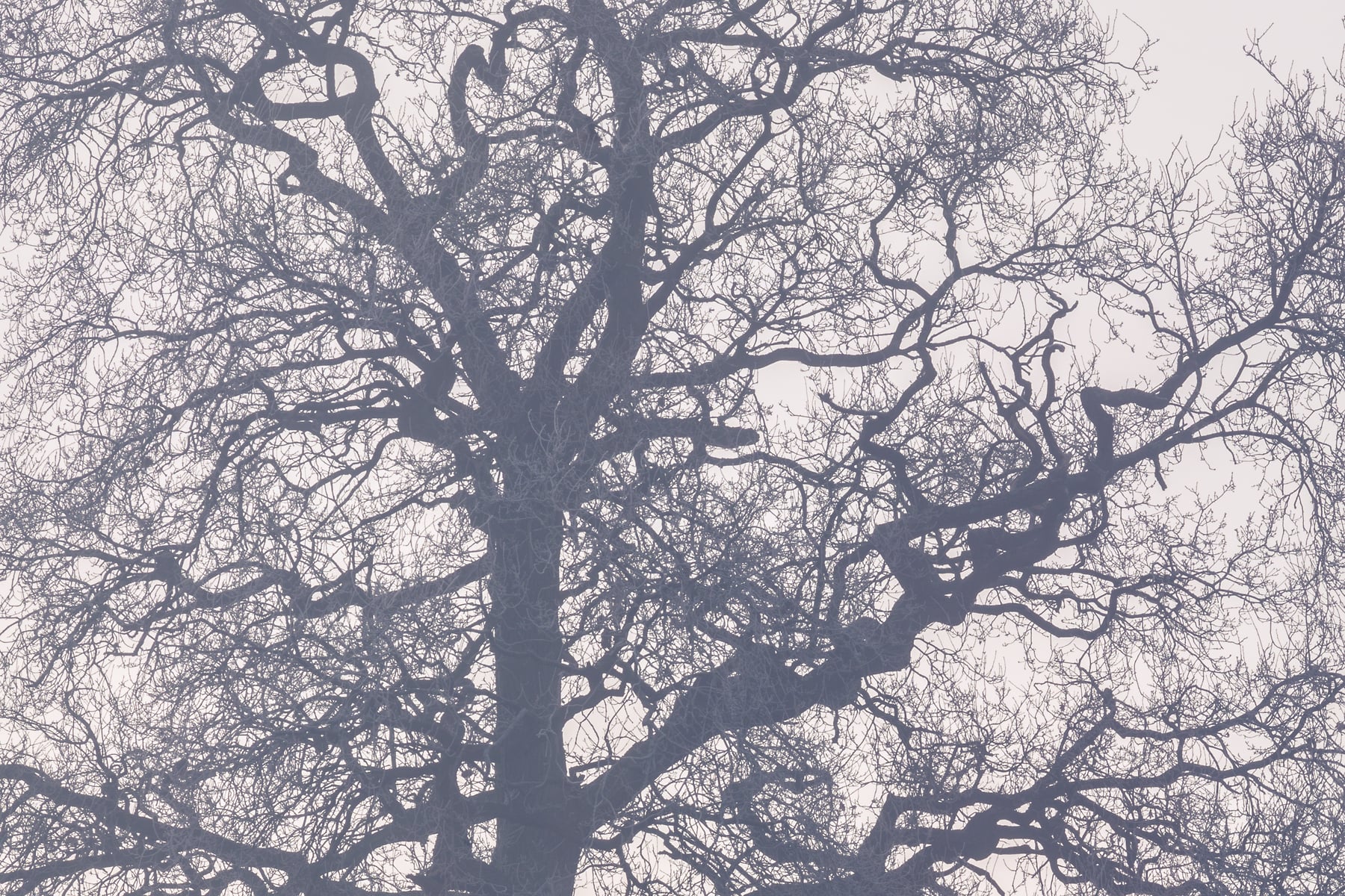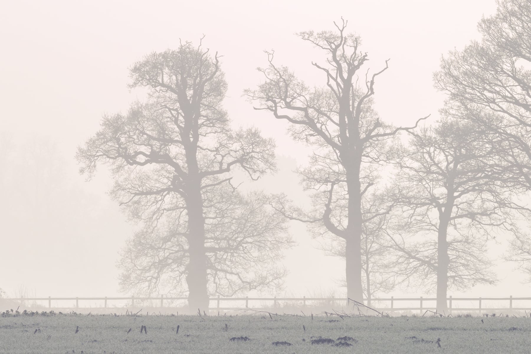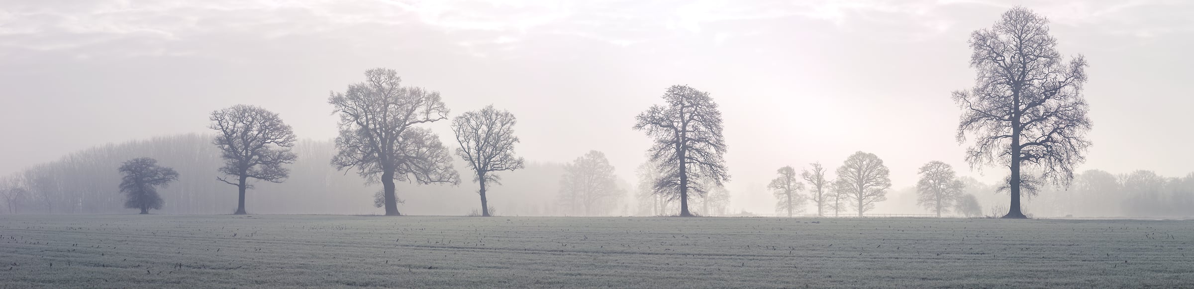 This panoramic photograph captures the ethereal beauty of a misty morning in Winkfield, Ascot, England, United Kingdom. The scene is enveloped in a soft, diffused light that filters through the mist, creating a serene and dreamlike atmosphere. Tall, bare trees stand in elegant silhouettes against the pale, foggy backdrop, their intricate branches reaching out like delicate lacework.