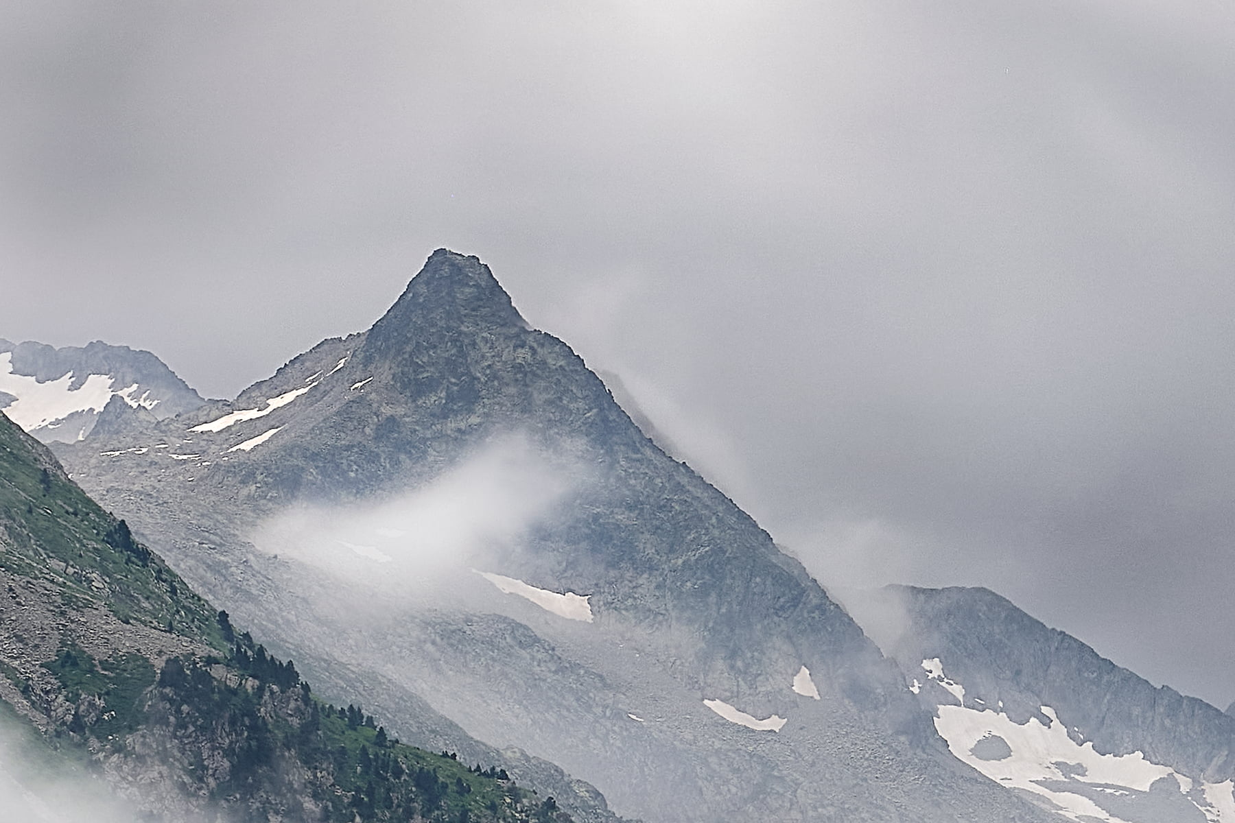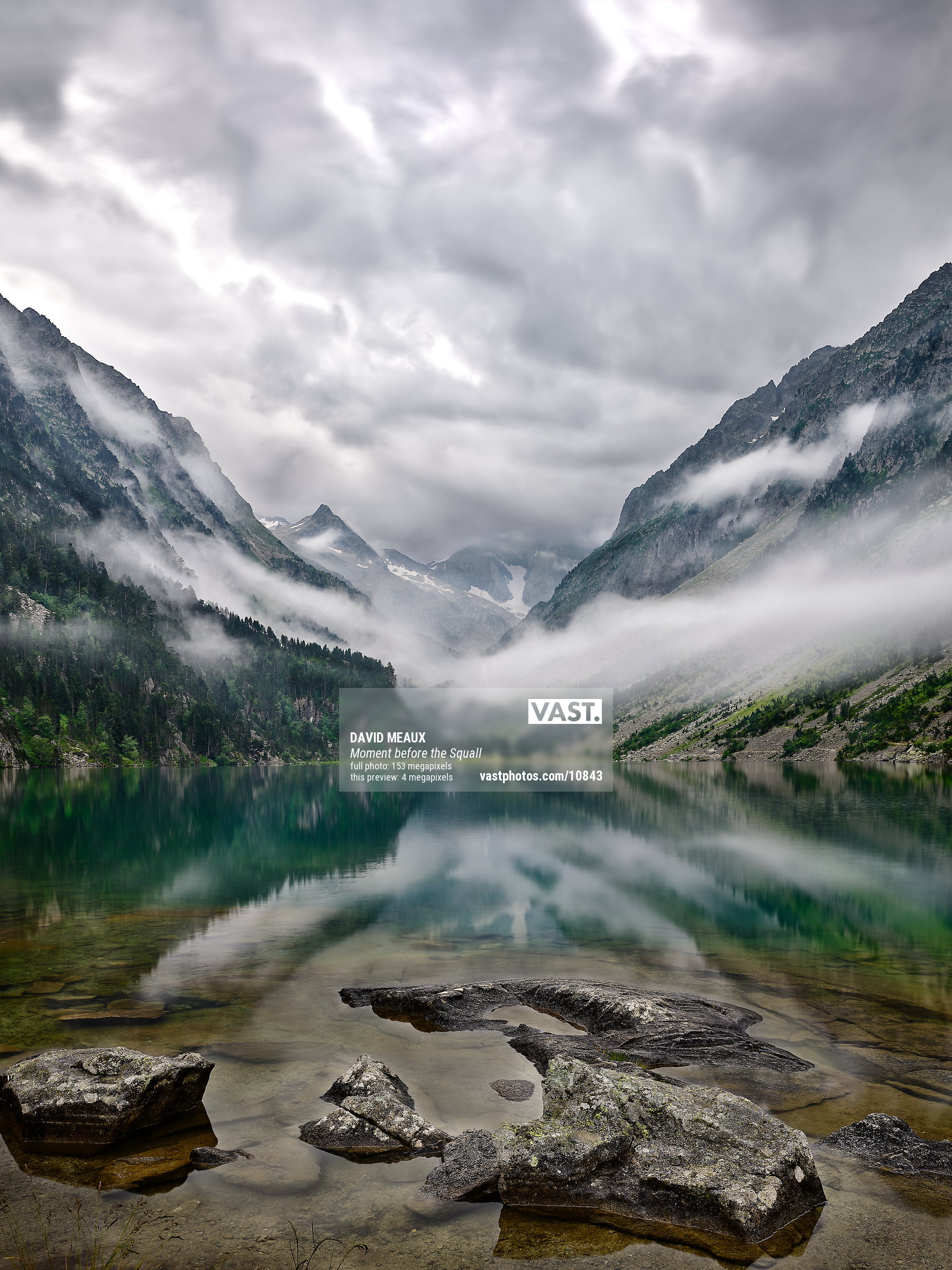While the day was a constant drizzle, it was a perfect opportunity to capture a dramatic atmosphere and the somber mood that rain brings. When I finally arrived at the lake, the clouds started getting darker and darker as a thunderstorm was quickly approaching. I quickly set up my camera and started doing a vertical panorama encompassing 9 frames of focus-stacking for each panel. As I felt cold air begin to quickly move down across the lake, a sign of an imminent thunderstorm, I began to pack up my gear. A moment later a large squall, accompanied by torrential rain, came barreling down over Lake Gaube, and I had to take refuge inside the Hôtellerie as umbrellas and picnic tables were being inverted and blown away.