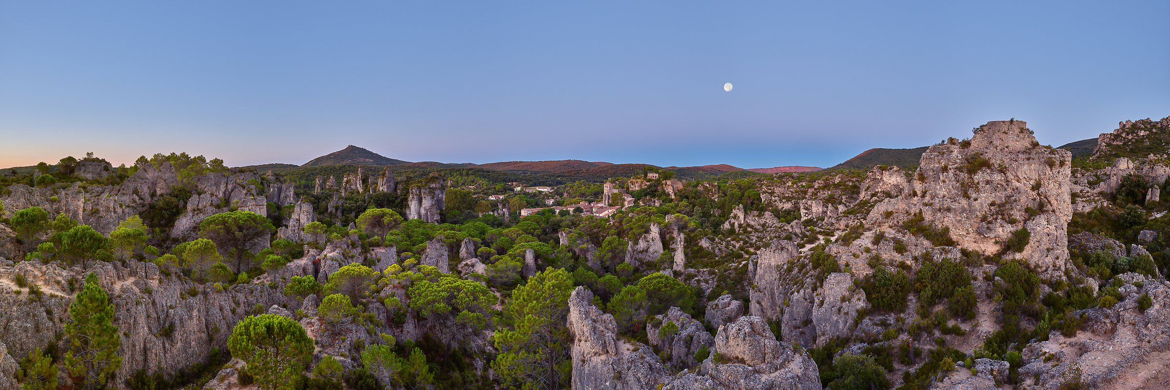 I arrived in Mourèze in the twilight hours before the crack of dawn. I picked up my backpack of gear and headed into the maze of dolomites in the dark, working my way toward the lookout point I had previously scouted out. Perched on a rocky spur atop a large dolomite, I set up my gear and adjusted the tilt, shift, non-parallax point, and precise focus settings of my medium format technical camera, using my headlamp to assist with the process. After getting the adjustments set, I began calculating the exposures I would need to capture the scene of the area surrounding the village of Mourèze as the sun began to illuminate it and the moon still in position.