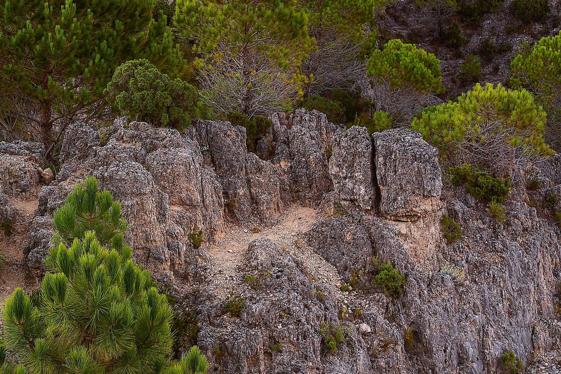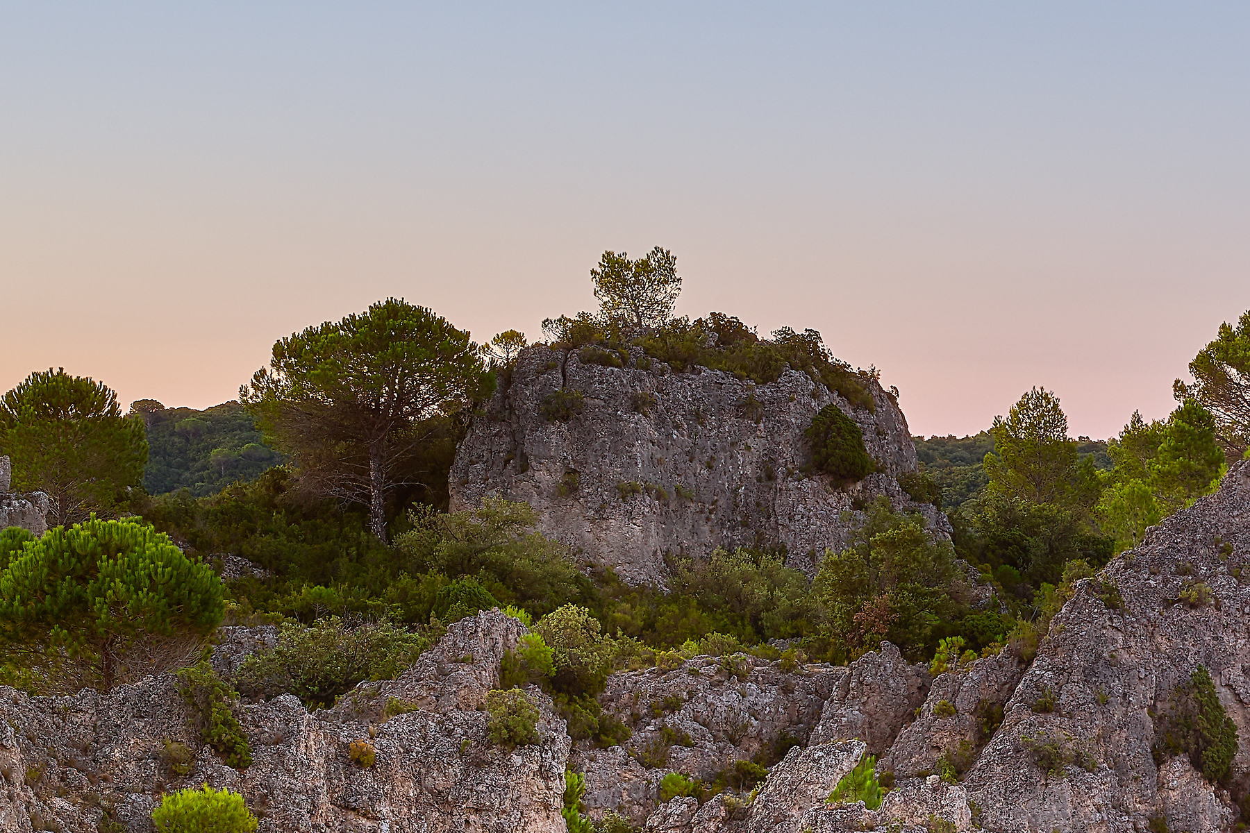 The light during this period of twilight in the morning, just before the sun rises, contrasts with the green trees and the rock formations. The soft sunlight refracts and diffuses through the atmosphere, taking on a predominantly blue hue and at the same time casting a wonderful luminosity onto the rocks, making them radiate. With the full moon still in the sky, yet about to set, the first rays of light began to hit the hills in the distance, and I found myself in awe of the scene before me. At my feet lay a golden sand contrasting with the grayish color of the rocks, and the dolomites, draped with dense vegetation, seemed to release a delightful pine and rosemary scent.