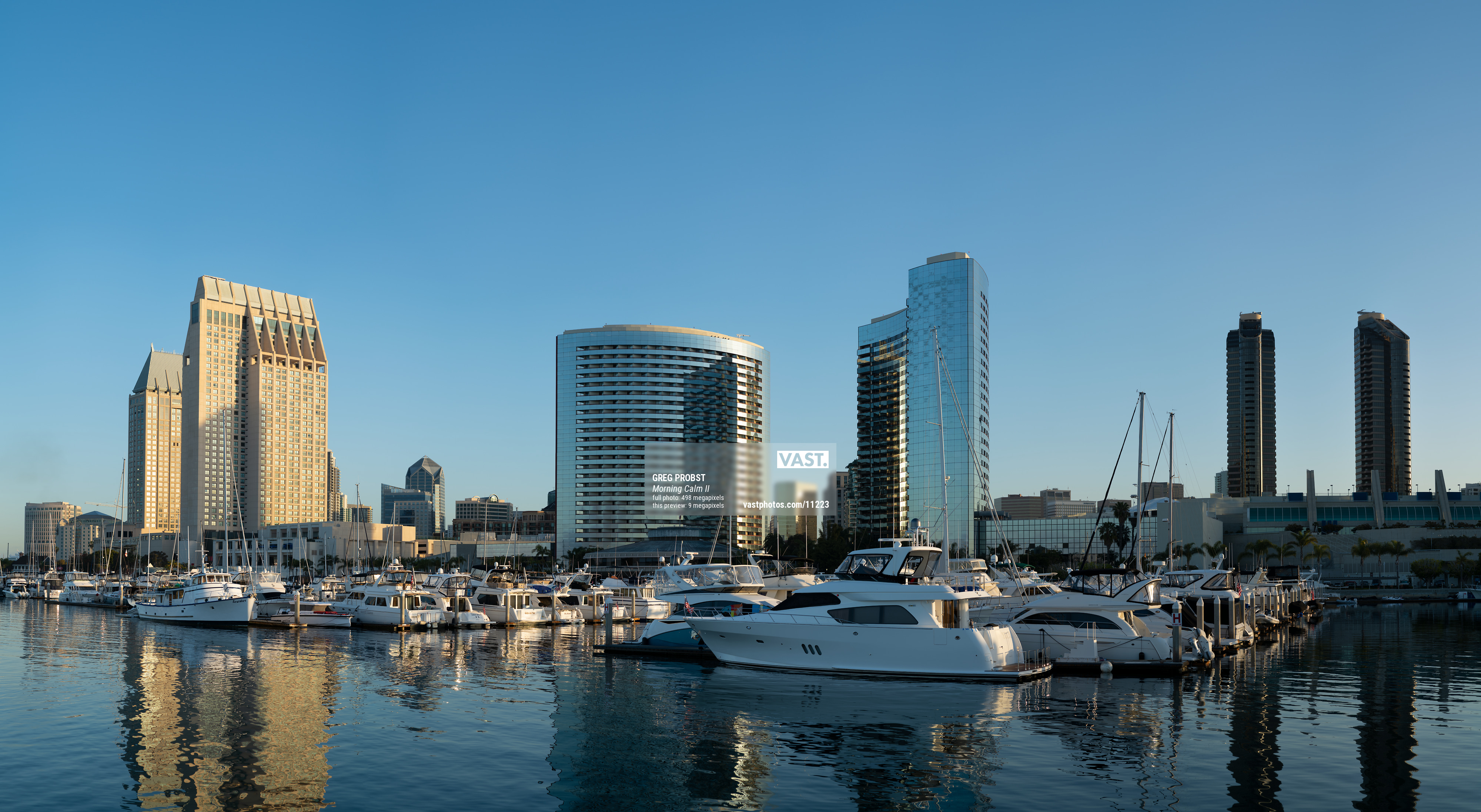 498 megapixels! A very high resolution, large-format VAST photo print of Embarcadero Marina in the morning with boats and the San Diego skyline; photograph created by Greg Probst in Embarcadero Marina, San Diego, California.