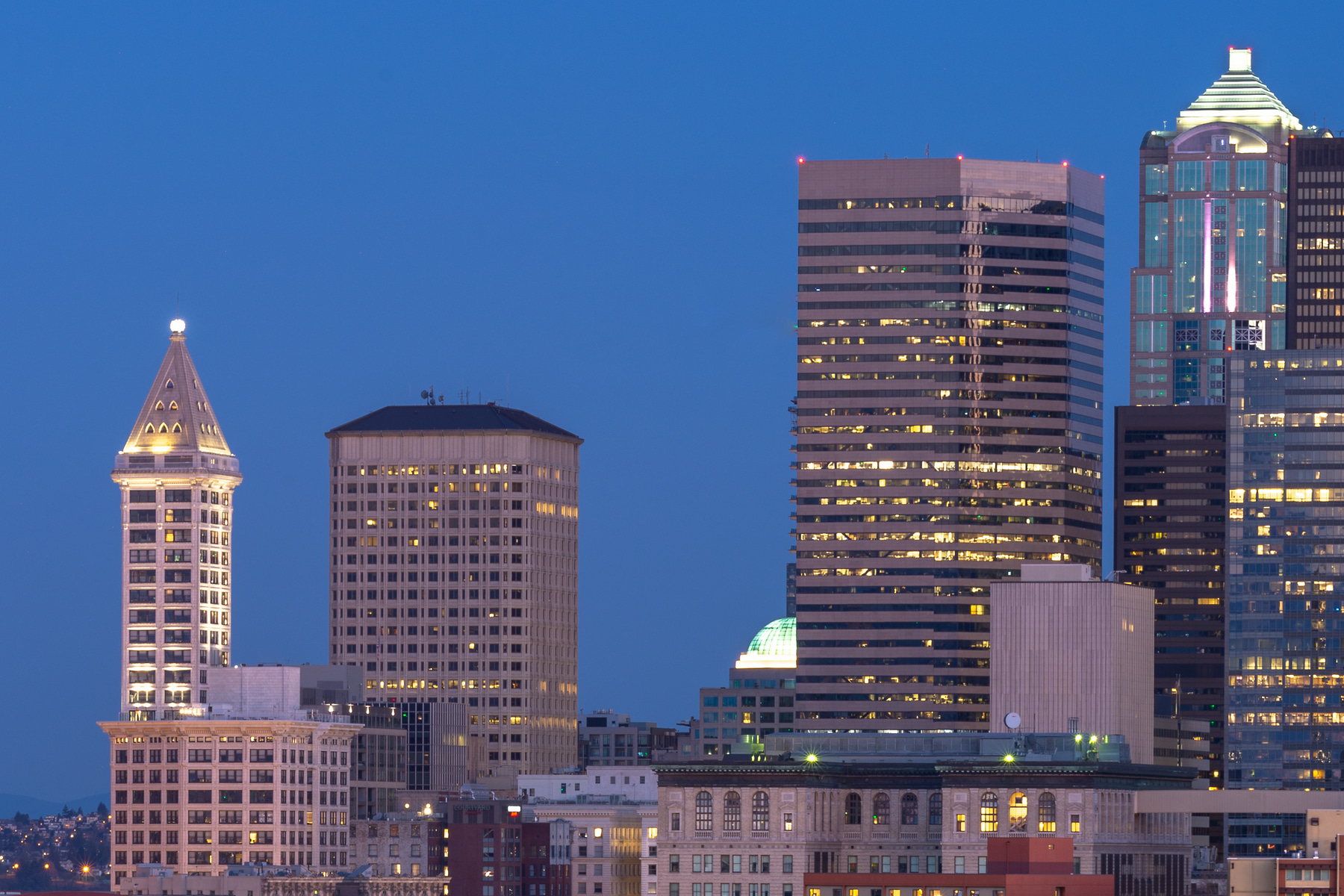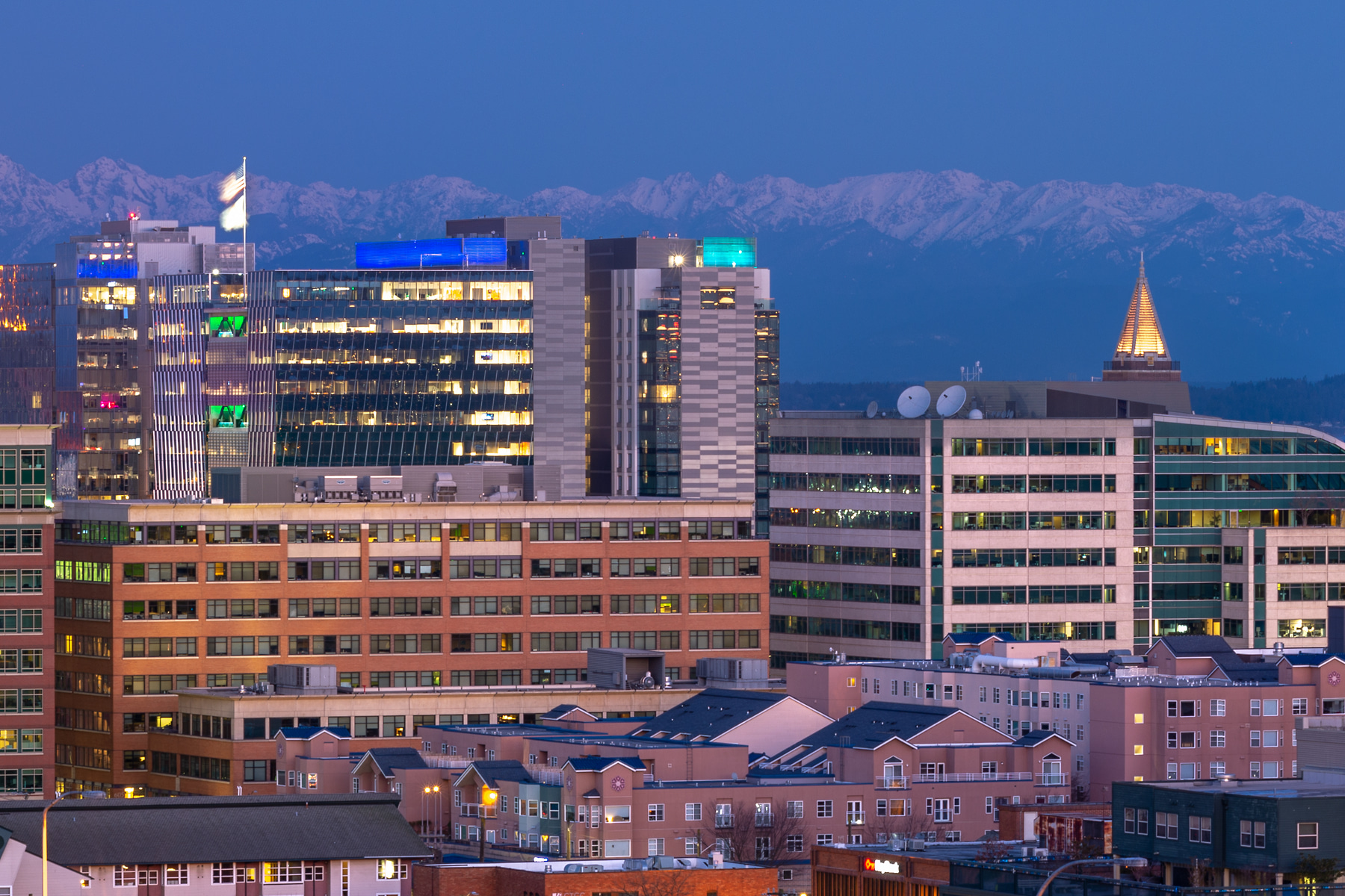 This view is from the south of downtown looking north and northwest with the snow covered Olympic Mountains across Puget Sound in the quiet light of dawn and the rush hour traffic of Interstate 5 and Interstate 90.